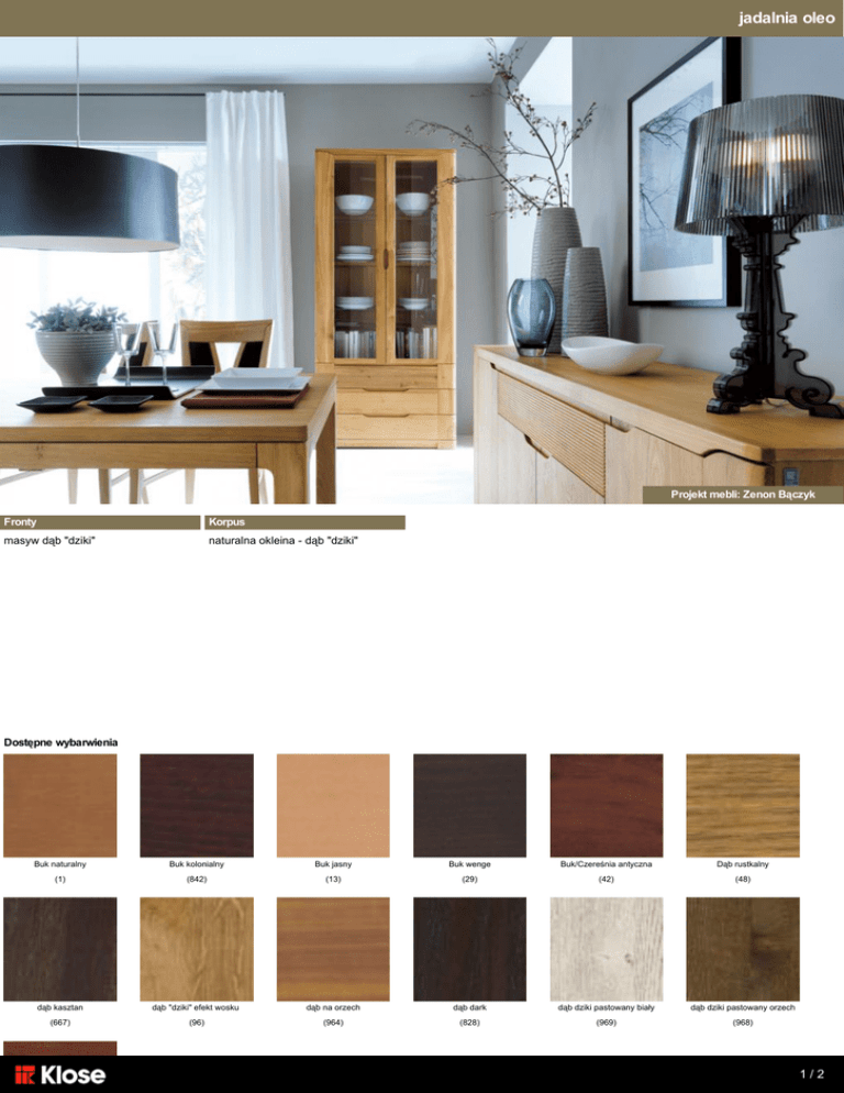 jadalnia oleo Projekt mebli: Zenon Bączyk Fronty Korpus masyw dąb "dziki" naturalna okleina - dąb "dziki" Dostępne wybarwienia Buk naturalny Buk kolonialny Buk jasny Buk wenge Buk/Czereśnia antyczna Dąb rustkalny (1) (842) (13) (29) (42) (48) dąb kasztan dąb "dziki" efekt wosku dąb na orzech dąb dark dąb dziki pastowany biały dąb dziki pastowany orzech (667) (96) (964) (828) (969) (968) 1/2 jadalnia oleo Elementy zestawu witryna lewa witryna prawa witryna kredens wysoki kredens wysoki kredens 7415-07 7415-08 7415-09 7415-05 7415-06 7415-01 60/210/40 60/210/40 90/210/40 90/154/40 137/120/40 137/80/40 kredens słupek stół stół stół stół 7415-02 7415-03 7415-04 3672 3673 3674 3675 180/80/40 60/120/40 90/75/140 90/75/160 90/75/180 100/75/200 lustro półka wisząca 7415-15 7415-12 136/75/6 158/20/23 Wymiary podawane w kolejności szer./wys./głębokość 2/2