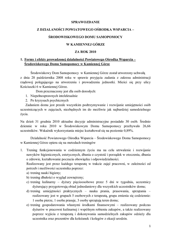 SPRAWOZDANIE Z DZIAŁANOŚCI POWIATOWEGO OŚRODKA WSPARCIA – ŚRODOWISKOWEGO DOMU SAMOPOMOCY W KAMIENNEJ GÓRZE ZA ROK 2010 1. Formy i efekty prowadzonej działalności Powiatowego Ośrodka Wsparcia – Środowiskowego Domu Samopomocy w Kamiennej Górze Środowiskowy Dom Samopomocy w Kamiennej Górze został utworzony uchwałą z dnia 28 października 2008 roku w sprawie przyjęcia zadania z zakresu administracji rządowej polegającego na utworzeniu i prowadzeniu jednostki. Mieści się przy ulicy Kościuszki 6 w Kamiennej Górze. Dom przeznaczony jest dla osób dorosłych: 1. Niepełnosprawnych intelektualnie 2. Po kryzysach psychicznych Zadaniem domu jest przede wszystkim podtrzymywanie i rozwijanie umiejętności osób uczestniczących w zajęciach, niezbędnych im do możliwie jak najbardziej samodzielnego życia. Na dzień 31 grudnia 2010 aktualne decyzje administracyjne posiadało 30 osób. Średnio dziennie w roku 2010 w Środowiskowym Domu Samopomocy przebywało 26,66 uczestników. Wskaźnik wykorzystania miejsc kształtował się na poziomie 0,89%. Działalność Powiatowego Ośrodka Wsparcia – Środowiskowego Domu Samopomocy w Kamiennej Górze opiera się na metodach treningów 1. Trening funkcjonowania w codziennym życiu ma na celu utrwalenie i rozwijanie nawyków higienicznych, estetycznych, dbania o czystość i porządek w otoczeniu, dbania o zdrowie, kształtowanie poczucia obowiązku i odpowiedzialności. Realizowany jest przez każdego terapeutę w trakcie zajęć pracowni, w zależności od potrzeb i możliwości uczestnika poprzez: a) trening nauki higieny; b) trening dbałości o wygląd zewnętrzny; c) trening kulinarny – dyżury pięcioosobowe przez 5 dni w tygodniu, uczestnicy dyżurujący przygotowują obiad jednodaniowy dla wszystkich uczestników domu; d) trening umiejętności praktycznych – nauka prania, prasowania, sprzątania – realizowany jest w grupach 5 osobowych z terapeutą, grupa zmienia się codziennie: 1 osoba pierze, 1 osoba prasuje, 3 osoby sprzątają teren domu; e) trening gospodarowania własnymi środkami finansowymi – realizowany podczas dyżurów w pracowni kulinarnej i wspólnym robieniu zakupów, a także realizowany poprzez wyjścia z terapeutą i dokonywania samodzielnych zakupów odzieży dla uczestnika oraz prezentów dla koleżanek i kolegów z okazji urodzin. 1 2. 3. Trening umiejętności interpersonalnych i rozwiązywania problemów ma na celu kształtowanie umiejętności współżycia w grupie i współpracy z otoczeniem, wyrabianie szacunku dla ludzi i samych siebie, kształtowanie umiejętności rozwiązywania problemów własnych i powstałych w otoczeniu. Realizowany jest przez terapeutów podczas zajęć w każdej z pracowni oraz podczas pracy z psychologiem poprzez: a) kształtowanie pozytywnych relacji uczestnika z osobami bliskimi – wykonywanie drobnych upominków dla bliskich podczas zajęć w pracowniach, rozmowy w grupie na temat kontaktów między uczestnikami, indywidualne rozmowy na temat problemów i możliwości ich rozwiązywania, pomoc w rozwiązywaniu konkretnych problemów w otoczeniu uczestnika jeśli taka pomoc jest potrzebna; (1.rozmowa z rodzicami uczestnika na temat nadużywania przez nich alkoholu, pomoc w uczestnictwie w leczeniu odwykowym i udziale w terapii; 2. pomoc uczestnikowi w znalezieniu ośrodka terapii uzależnień, rozmowy i pomoc w zrozumieniu swoich problemów z tym związanych, współpraca z siostrą uczestnika) b) kształtowanie pozytywnych relacji uczestnika z osobami podczas zakupów, w środkach komunikacji publicznej, w urzędach, instytucjach kultury – podczas zajęć uczestnicy załatwiają sprawy w banku, na poczcie, sklepach, wychodzą wspólnie do kawiarni i pizzerii. Trening umiejętności spędzania czasu wolnego ma na celu wywołanie trwałych zmian w osobowości uczestnika, przejawiających się rozbudzeniem zainteresowania różnymi formami aktywności oraz internalizacji określonych potrzeb, wartości, motywacji i postaw związanych z racjonalnym (pożytecznym, rozumnym) spędzaniem czasu wolnego. Trening realizowany jest poprzez uczestnictwo w pracowniach terapeutycznych oraz hodowli rybek akwariowych, kwiatów, udziału w imprezach sportowych, kulturalnych zabawach i balach organizowanych z zaprzyjaźnionymi środowiskami. a) rozwijanie zainteresowań literaturą – uczestnicy wraz z terapeutą utworzyli punkt biblioteczny. Samodzielnie ogłosili wśród rodziców i znajomych apel o przekazanie książek, w pracowni stolarskiej wykonali odpowiednie półki i regały, w bibliotece pedagogicznej uzyskali informacje na temat katalogowania książek, obłożyli je i ustawili na półkach. Obecnie sporządzają numeryczny katalog zbioru. Biblioteka to miejsce, gdzie w ciszy i spokoju uczestnicy czytają książki, terapeuta organizuje zajęcia biblioterapeutyczne, przygotowuje także zbiór do możliwości wypożyczana książek przez uczestników, terapeutów i ich bliskich. b) rozwijanie zainteresowań audycjami radiowymi i telewizyjnymi – uczestnicy korzystają z telewizora i radia, jednak bardzo rzadko wykorzystują tę formę spędzania czasu wolnego tłumacząc, że przed uczestnictwem w zajęciach ośrodka skazani byli tylko na telewizję i radio. Najchętniej słuchają ulubionej muzyki podczas zajęć, omawiają wspólnie z terapeutą audycje telewizyjne, filmy, które oglądali w domu; c) rozwijanie zainteresowań Internetem – w sali bibliotecznej znajduje się komputer, który wykorzystują uczestnicy do nauki podstawowej jego obsługi. Dla osób, które potrafią już korzystać z internetu przeznaczony jest laptop. Terapeuci uczą uczestników wykorzystania internetu w każdej dziedzinie życia. 2 4. 5. 6. 7. 8. d) udział w spotkaniach towarzyskich i kulturalnych – organizowanie imprez z udziałem zaproszonych gości, udział w imprezach organizowanych, współorganizowanie imprez z innymi jednostkami pomocy społecznej. e) zajęcia w ra