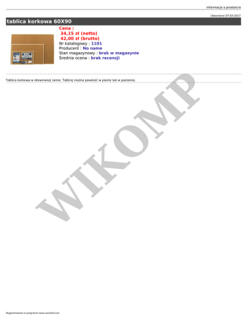 Informacje o produkcie Utworzono 07-03-2017 tablica korkowa 60X90 Cena : 34,15 zł (netto) 42,00 zł (brutto) Nr katalogowy : 1101 Producent : No name Stan magazynowy : brak w magazynie Średnia ocena : brak recenzji W IK O M P Tablica korkowa w drewnianej ramie. Tablicę można powiesić w pionie lub w poziomie. Wygenerowano w programie www.oscGold.com