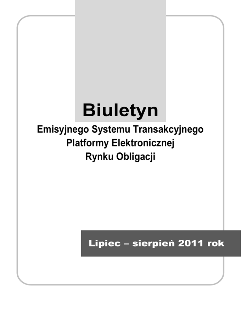 Biuletyn Emisyjnego Systemu Transakcyjnego Platformy Elektronicznej Rynku Obligacji Lipiec – sierpień 2011 rok Inwestor ma możliwość zapoznania się z aktualnymi Informacjami ofertowymi po wprowadzeniu go na listę udostępnień dla konkretnej emisji, o ile ilość uprawnionych inwestorów nie przekracza 99 osób (prawnych lub fizycznych). Informacja ofertowa jest bieżącą aktualizacją załącznika nr 8 Informacji inwestycyjnej stanowiącej propozycję nabycia obligacji dyskontowych na okaziciela, dostępnej na stronie serwisu transakcyjnego EST PERO. Logowanie się do systemu transakcyjnego odbywa się za pomocą elektronicznego urządzenia dostępowego EUD PQI. Urządzenie dostępowe Inwestor otrzymuje od Operatora po akceptacji przez Emitenta zamiaru nabycia obligacji określonej emisji. W biuletynach z 2010 roku (archiwalne biuletyny dostępne są bezpośrednio w serwisie informacyjnym EST PERO) zmieszczono diagram ilustrujący proces uzyskiwania dostępu do informacji umożliwiającej Inwestorowi podjęcie decyzji o nabyciu obligacji (Art. 3 ust. 3 ustawy z 29 lipca 2005 roku o ofercie publicznej i warunkach wprowadzania instrumentów finansowych do zorganizowanego systemu obrotu oraz o spółkach publicznych – tekst jednolity Dz.U. z 2009 roku Nr 185, poz. 1439 ze zm.). Prezentowane na stronie 4 zestawienie przedstawia strukturę wewnętrznej klasyfikacji ratingowej. Aktualnie dostępne emisje na platformie EST PERO: Wszystkie emisje notowane na EST PERO oparte są na obligacjach dyskontowych, wobec których Nabywca/Inwestor może wezwać Emitenta do ich odkupu przed terminem płatności. II Emisja Programu TPE 2009-2012 Obligacje dyskontowe na okaziciela serii CB o nominałach 10 000 zł i 100 000 zł, z rentownością większą niż 10,50 % p.a. Obligacje serii CB mają datę zapadalności w ostatniej dekadzie listopada 2011 roku. Nabycie tych obligacji umożliwia również kontynuowanie inwestycji w kolejną emisję (obligacje serii CC) programu TPE 2009-2012. Nabywając obligacje określonych emisji emitowanych w programie wieloletnim Inwestor ma możliwość utrzymywania swojego zaangażowania w kolejnych emisjach programu poprzez składanie oferty nabycia obligacji kolejnej emisji w trybie zamiany posiadanych walorów (w ich wartości nominalnej) na obligacje kolejnej emisji (w przypadającej na datę emisji wartości transakcyjnej) z zachowaniem gwarantowanego dochodu liczonego jako różnicę oferowanej rentowności i bazowej wartości WIBORU 3M (średnia z tygodnia poprzedzającego tydzień, w którym odbywa się zakup). Emisja obligacji POP 2010-2011 Obligacje dyskontowe na okaziciela serii EA o nominale 50 000 zł, z rentownością większą niż 14,20% p.a. określaną każdorazowo (cotygodniowo) w udostępnianej inwestorowi Informacji ofertowej dla kolejnego tygodnia roku. Obligacje serii EA mają datę zapadalności w pierwszej dekadzie grudnia 2011 roku. www.i-obligacje.pl 2 Wewnętrzna klasyfikacja ratingowa Operator Platformy Elektronicznej Rynku Obligacji zakłada dla krótkoterminowych papierów dłużnych (360 dniowych obligacji dyskontowych na okaziciela), oferowanych w obszarze lokalnego rynku kapitałowego zdefiniowanego rozpoznanymi stosunkami biznesowymi między partnerami obrotu gospodarczego, wykorzystanie w ocenie możliwości spełnienia zobowiązań obligacyjnych przez Emitenta dotychczasowych doświadczeń i relacji gospodarczych między współpracującymi podmiotami. Weryfikacja wewnętrznej klasyfikacji ratingowej możliwa jest poprzez zewnętrzną ocenę jakości inwestycyjnej (rekomendowanej) przez obiektywny podmiot zewnętrzny wskazany przez Emitenta w postępowaniu przedratingowym. Operator Platformy Elektronicznej Rynku Obligacji zaleca wykorzystanie wewnętrznej klasyfikacji ratingowej dla rekomendacji inwestycyjnej przy plasowaniu krótkoterminowych papierów dłużnych wśród inwestorów z obszaru lokalnego rynku kapitałowego Emitenta. Rentowność oferowanych obligacji Emitent ustala z uwzględnieniem parametrów bazowych, którymi są stawki WIBOR dla wybranych okresów inwestycyjnych. Domyślną pozycją bazową jest średni WIBOR 3M dla tygodnia poprzedzającego datę nabycia obligacji określoną w Ofercie i wskazaną w Zleceniu nabycia. Baza rentowności powiększona mnożnikiem z dodaniem współczynników korygujących ( współczynnik korygujący dla jednostki nominałowej i współczynnik korygujący poziom konkurencyjności) dedykowanych dla poszczególnych nominałów obligacji tworzy rentowność oferowanej obligacji w stosunku rocznym (dla 360 dniowego okresu zapadalności). Współczynnik korygujący dla jednostki nominałowej może również uwzględniać poziom zaangażowania inwestora dla wybranej transakcji. Współczynnik korygujący poziom konkurencyjności wyznaczany jest przez Emitenta jeżeli oferowana rentowność z uwzględnieniem mnożnika bazy rentowności i współczynnika korygującego dla jednostki nominałowej znacząco przekracza (ujemna wartość współczynnika) lub nie różni się znacząco (dodatnia wartość współczynnika) od oferowanych na rynku maksymalnych rentowności na lokatach w bankach komercyjnych i spółdzielczych. Użycie skali mnożnika bazy wynika z zakwalifikowania Emitenta do określonej kategorii i nadania odpowiadającego dla tej kategorii stopnia według zaakceptowanej przez Emitenta wewnętrznej klasyfikacji ratingowej. Współczynnik korygujący konkurencyjność Marża nabywcy Współczynnik korekcyjny dla nominału Mnożnik dla kategorii np. C-1 (1,6) Baza www.i-obligacje.pl Rentowność WIBOR 3M 3 Wewnętrzna klasyfikacja ratingowa Kategoria Stopień Mnożnik bazy A 0 1,0 1 2 3 4 5 1 1,0 1,1 1,2 1,3 1,4 1,5 2 1,6 3 1,7 4 1,8 5 1,9 1 2,0 2 2,1 3 2,3 4 2,5 5 0 1 2 3 4 5 2,7 2,9 3,0 3,4 3,8 4,2 4,6 B C D E Podstawa klasyfikacji Obligacje o najwyższej wiarygodności. Emitent posiada najwyższą wiarygodność inwestycyjną przekładającą się na niezakłóconą p