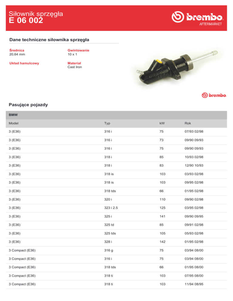 Siłownik sprzęgła E 06 002 Dane techniczne siłownika sprzęgła Średnica 20,64 mm Gwintowanie 10 x 1 Układ hamulcowy Materiał Cast Iron Pasujące pojazdy BMW Model Typ kW Rok 3 (E36) 316 i 75 07/93 02/98 3 (E36) 316 i 73 09/90 09/93 3 (E36) 316 i 75 09/90 09/93 3 (E36) 318 i 85 10/93 02/98 3 (E36) 318 i 83 12/90 10/93 3 (E36) 318 is 103 03/93 02/98 3 (E36) 318 is 103 09/95 02/98 3 (E36) 318 tds 66 01/95 02/98 3 (E36) 320 i 110 09/90 02/98 3 (E36) 323 i 2.5 125 03/95 02/98 3 (E36) 325 i 141 09/90 09/95 3 (E36) 325 td 85 09/91 02/98 3 (E36) 325 tds 105 05/93 02/98 3 (E36) 328 i 142 01/95 02/98 3 Compact (E36) 316 g 75 03/94 08/00 3 Compact (E36) 316 i 75 03/94 08/00 3 Compact (E36) 318 tds 66 01/95 08/00 3 Compact (E36) 318 ti 103 07/95 08/00 3 Compact (E36) 318 ti 103 11/94 08/95 3 Compact (E36) 323 ti 125 08/97 08/00 3 Convertible (E30) 318 i 83 09/90 10/93 3 Convertible (E30) 320 i 95 04/86 10/93 3 Convertible (E30) 325 i 126 12/85 12/87 3 Convertible (E36) 318 i 85 01/94 04/99 3 Convertible (E36) 320 i 110 12/93 04/99 3 Convertible (E36) 323 i 125 06/95 04/99 3 Convertible (E36) 325 i 141 03/93 03/95 3 Convertible (E36) 328 i 142 03/95 04/99 3 Coupe (E36) 316 i 75 09/93 04/99 3 Coupe (E36) 318 is 103 03/92 10/95 3 Coupe (E36) 318 is 103 09/95 04/99 3 Coupe (E36) 320 i 110 03/92 04/99 3 Coupe (E36) 323 i 125 03/95 04/99 3 Coupe (E36) 325 i 141 03/92 04/99 3 Coupe (E36) 328 i 142 01/95 04/99 3 Touring (E36) 316 i 75 01/96 10/99 3 Touring (E36) 318 i 85 07/95 10/99 3 Touring (E36) 318 tds 66 01/95 10/99 3 Touring (E36) 320 i 110 01/95 10/99 3 Touring (E36) 323 i 125 09/95 10/99 3 Touring (E36) 325 tds 105 01/95 10/99 3 Touring (E36) 328 i 142 01/95 10/99 Z3 (E36) 1.8 i 85 10/95 10/98 Z3 (E36) 1.9 i 85 01/99 01/03 Z3 (E36) 1.9 i 87 07/98 01/03 Z3 (E36) 1.9 i 103 10/95 03/99 Z3 (E36) 2.8 i 141 04/97 06/00 Z3 Coupe (E36) 2.8 i 141 07/97 06/00 Numery OE Pasujące kody OE BMW 1159045 BMW 1161530 BMW 1164916 BMW 21521159045 BMW 21521159530 BMW 21521161530 BMW 21521164916