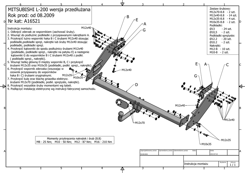 6 D 5 4 MITSUBISHI L-200 wersja przedłużana Rok prod: od 08.2009 Nr kat: A16521 3 B E M12x40 Instrukcja montażu: 1. Odkręcić zderzak ze wspornikiem (zachować śruby). 2. Wsunąć do podłużnic podkładki z przyspawanymi nakrętkami A. 3. Przykręcić lużno wsporniki haka B i C śrubami M12x40 stosując podkładki,podkładki spręż, nakrętki lub śruby M12x40 stosując podkładki, podkładki spręż. 4. Przykręcić kątowniki do spodu podłużnicy śrubami M12x40 (podkładki, podkładki spręż., nakrętki na patyku E) a następnie kątowniki G do wsporników B i C śrubami M12x40 z podkł. ( podkładki spręż., nakrętki). 5. Wsunąć belkę główną D między wsporniki B, C i przykręcić C śrubami M12x35 oraz M10x35 (podkładki, podkł. spręż., nakrętki). 6. Przykręcić wspornik zderzaka (wsuwając w ceownik przyspawany do wsporników M12x35 haka B i C) śrubami oryginalnymi. M10x35 7. Przykręcić kulę oraz blachę gniazdka elektrycz. śrubami M12x70 (podkładki, podkł. sprężyste, nakrętki). 8. Przykręcić wszystkie śruby momentami wg tabeli. 9. Podłączyć instalację elektrycznę wg instrukcji fabrycznej samochodu. 2 1 Zestaw śrubowy: M12x70-8.8 - 2 szt. M12x40-8.8 - 14 szt. M12x35-8.8 - 4 szt. M10x35-8.8 - 2 szt. D Podkładki: Ø13 - 24 szt. Ø10,5 - 2 szt. Podkładki sprężyste: Ø12.2 - 20 szt. Ø10.2 - 2 szt. Nakrętki: M12-8 - 10 szt. M10-8 - 2 szt. A G E A C C M12x40 G D M12x40 B B M12x40 M12x70 Momenty przykręcenia nakrętek i śrub (8.8) M8 - 25 Nm; M10 - 50 Nm; M12 - 87 Nm; M16 - 210 Nm A M12x35 M10x35 Zaprojektowany przez Sprawdzony przez Zatwierdzony przez Data Konstruktor Instrukcja montażu 6 5 4 3 A Data 2015-07-22 2 Wydanie Arkusz 1/1 1