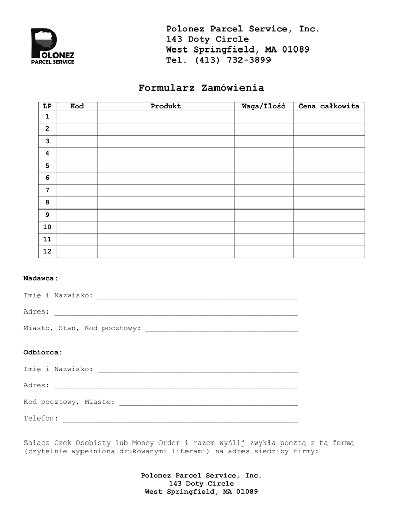 Polonez Parcel Service, Inc. 143 Doty Circle West Springfield, MA 01089 Tel. (413) 732-3899 Formularz Zamówienia LP 1 Kod Produkt Waga/Ilość Cena całkowita 2 3 4 5 6 7 8 9 10 11 12 Nadawca: Imię i Nazwisko: ______________________________________________ Adres: ________________________________________________________ Miasto, Stan, Kod pocztowy: ___________________________________ Odbiorca: Imię i Nazwisko: ______________________________________________ Adres: ________________________________________________________ Kod pocztowy, Miasto: _________________________________________ Telefon: ______________________________________________________ Załącz Czek Osobisty lub Money Order i razem wyślij zwykłą pocztą z tą formą (czytelnie wypełnioną drukowanymi literami) na adres siedziby firmy: Polonez Parcel Service, Inc. 143 Doty Circle West Springfield, MA 01089