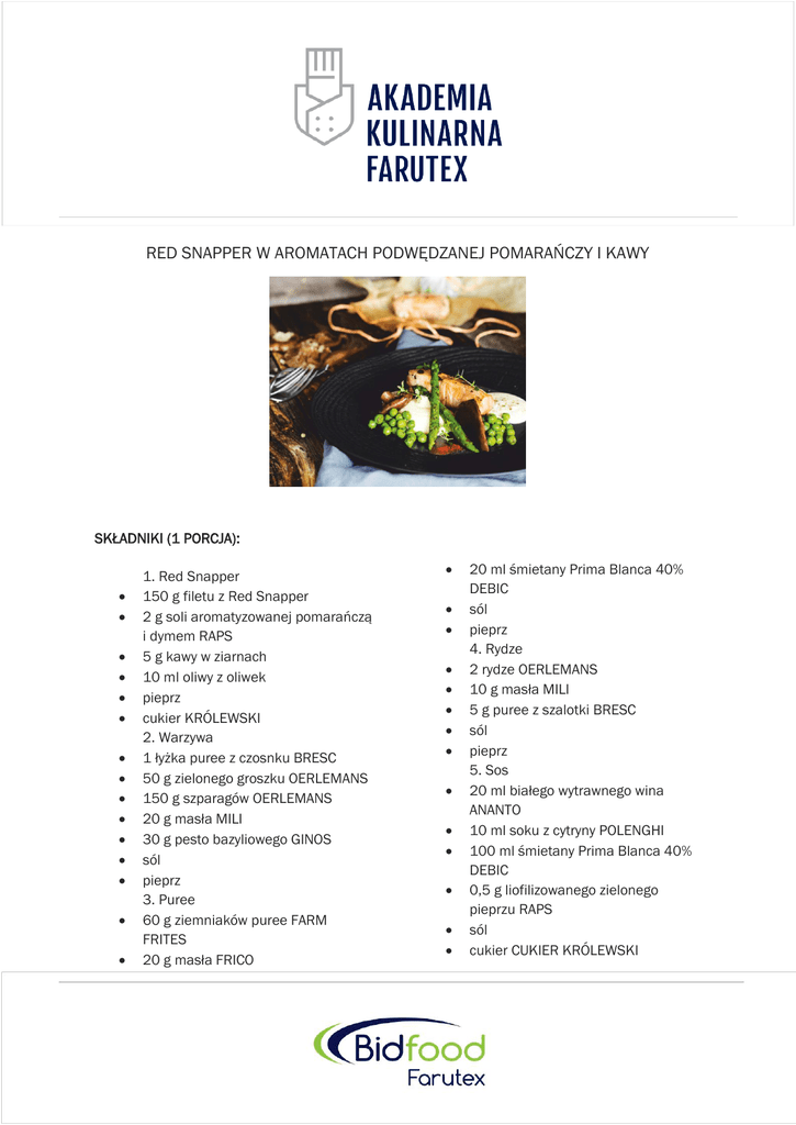 RED SNAPPER W AROMATACH PODWĘDZANEJ POMARAŃCZY I KAWY SKŁADNIKI (1 PORCJA): 1. Red Snapper 150 g filetu z Red Snapper 2 g soli aromatyzowanej pomarańczą i dymem RAPS 5 g kawy w ziarnach 10 ml oliwy z oliwek pieprz cukier KRÓLEWSKI 2. Warzywa 1 łyżka puree z czosnku BRESC 50 g zielonego groszku OERLEMANS 150 g szparagów OERLEMANS 20 g masła MILI 30 g pesto bazyliowego GINOS sól pieprz 3. Puree 60 g ziemniaków puree FARM FRITES 20 g masła FRICO 20 ml śmietany Prima Blanca 40% DEBIC sól pieprz 4. Rydze 2 rydze OERLEMANS 10 g masła MILI 5 g puree z szalotki BRESC sól pieprz 5. Sos 20 ml białego wytrawnego wina ANANTO 10 ml soku z cytryny POLENGHI 100 ml śmietany Prima Blanca 40% DEBIC 0,5 g liofilizowanego zielonego pieprzu RAPS sól cukier CUKIER KRÓLEWSKI SPOSÓB PRZYGOTOWANIA: Filet ryby wykroić na porcję około 150 g. Ziarna kawy rozkruszyć i dodać aromatyzowaną sól, wymieszać z oliwą z oliwek z dodatkiem pieprzu oraz odrobiną cukru. Rybę włożyć do przygotowanej marynaty na ok. 2 godziny. Przygotować arkusz papieru do gotowania SAGA i ułożyć na nim filet Red Snappera, z papieru uformować sakiewkę, następnie wstawić ją do piekarnika nagrzanego do 120°C na 20 minut. Przygotować arkusz papieru do gotowania SAGA, ułożyć na nim czosnek, szparagi oraz groszek dodając masło, pesto, sól i pieprz. Z papieru uformować szczelnie zamkniętą sakiewkę, następnie wstawić ją do garnka z gotującą wodą na ok. 3 minuty. Do gotowego puree z ziemniaków dodajemy masło i śmietanę, doprawiamy solą i pieprzem. Podczas podgrzewania często mieszamy. Na arkuszu papieru do gotowania SAGA ułożyć namoczone wcześniej rydze, szalotkę i masło, doprawić je solą i pieprzem. Z papieru uformować łódkę i wstawić ją do piekarnika nagrzanego do temperatury 140°C na około 15 minut. Do garnka wlać wino oraz sok z cytryny i gotować do momentu odparowania połowy płynu, następnie dodać śmietanę i gotować na małym ogniu ok. 5 minut, całość doprawić solą, cukrem i zielonym pieprzem.