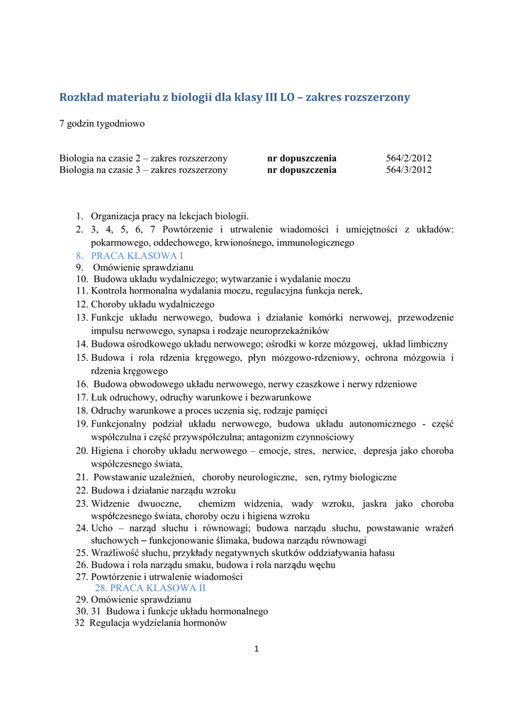 Rozkład materiału z biologii dla klasy III LO – zakres rozszerzony 7 godzin tygodniowo Biologia na czasie 2 – zakres rozszerzony Biologia na czasie 3 – zakres rozszerzony nr dopuszczenia nr dopuszczenia 564/2/2012 564/3/2012 1. Organizacja pracy na lekcjach biologii. 2. 3, 4, 5, 6, 7 Powtórzenie i utrwalenie wiadomości i umiejętności z układów: pokarmowego, oddechowego, krwionośnego, immunologicznego 8. PRACA KLASOWA I 9. Omówienie sprawdzianu 10. Budowa układu wydalniczego; wytwarzanie i wydalanie moczu 11. Kontrola hormonalna wydalania moczu, regulacyjna funkcja nerek, 12. Choroby układu wydalniczego 13. Funkcje układu nerwowego, budowa i działanie komórki nerwowej, przewodzenie impulsu nerwowego, synapsa i rodzaje neuroprzekaźników 14. Budowa ośrodkowego układu nerwowego; ośrodki w korze mózgowej, układ limbiczny 15. Budowa i rola rdzenia kręgowego, płyn mózgowo-rdzeniowy, ochrona mózgowia i rdzenia kręgowego 16. Budowa obwodowego układu nerwowego, nerwy czaszkowe i nerwy rdzeniowe 17. Łuk odruchowy, odruchy warunkowe i bezwarunkowe 18. Odruchy warunkowe a proces uczenia się, rodzaje pamięci 19. Funkcjonalny podział układu nerwowego, budowa układu autonomicznego - część współczulna i część przywspółczulna; antagonizm czynnościowy 20. Higiena i choroby układu nerwowego – emocje, stres, nerwice, depresja jako choroba współczesnego świata, 21. Powstawanie uzależnień, choroby neurologiczne, sen, rytmy biologiczne 22. Budowa i działanie narządu wzroku 23. Widzenie dwuoczne, chemizm widzenia, wady wzroku, jaskra jako choroba współczesnego świata, choroby oczu i higiena wzroku 24. Ucho – narząd słuchu i równowagi; budowa narządu słuchu, powstawanie wrażeń słuchowych – funkcjonowanie ślimaka, budowa narządu równowagi 25. Wrażliwość słuchu, przykłady negatywnych skutków oddziaływania hałasu 26. Budowa i rola narządu smaku, budowa i rola narządu węchu 27. Powtórzenie i utrwalenie wiadomości 28. PRACA KLASOWA II 29. Omówienie sprawdzianu 30. 31 Budowa i funkcje układu hormonalnego 32 Regulacja wydzielania hormonów 1 33. współdziałanie układu hormonalnego z układem nerwowym, porównanie układu hormonalnego z układem nerwowym 34. Budowa i funkcjonowanie męskich narządów rozrodczych, spermatogeneza 35. Budowa i funkcjonowanie żeńskich narządów rozrodczych, oogeneza 36. Porównanie oogenezy ze spermatogenezą, cykl miesiączkowy, hormonalna regulacja przebiegu cyklu płciowego 37. Budowa plemnika, zapłodnienie 38. Rozwój prenatalny człowieka, poród 39. Powstawanie wad wrodzonych, diagnostyka prenatalna, ocena stanu zdrowia noworodka 40. Rozwój postnatalny 41. Choroby i higiena układu rozrodczego 42. Uwarunkowania zdrowia. Choroby zakaźne i pasożytnicze 43. Choroby nowotworowe 44. Uzależnienia 45. Powtórzenie i utrwalenie wiadomości 46. PRACA KLASOWA III 47. Omówienie sprawdzianu 48. Powtórzenie wiadomości o człowieku 49. PRACA KLASOWA IV – „cały człowiek” 50. Omówienie sprawdzianu 51. Budowa i rola kwasów nukleinowych 52. Rodzaje i funkcje RNA, miejsce występowania RNA w komórce, RNA jako materiał genetyczny 53. Replikacja DNA 54. Replikacja końców cząsteczki DNA – mechanizm działania telomerazy, regulacja replikacji DNA 55. struktura genu, genom – kompletna informacja genetyczna, genom komórki prokariotycznej i komórki eukariotycznej, struktura chromatyny i upakowanie DNA 56. Kod genetyczny 57. Transkrypcja 58. Odwrotna transkrypcja, modyfikacje potranskrypcyjne RNA w komórkach eukariotycznych 59. Translacja, modyfikacje potranslacyjne białek 60. Regulacja ekspresji genów w komórce prokariotycznej, model operonu (operon laktozowy i operon tryptofanowy) 61. Regulacja ekspresji genów w komórce eukariotycznej 62. I prawo Mendla 63. II prawo Mendla 64. Chromosomowa teoria dziedziczności 65. Dominacja zupełna i dominacja niezupełna, kodominacja, dziedziczenie w wypadku alleli wielokrotnych, geny kumulatywne, geny dopełniające się (komplementarne), geny epistatyczne i hipostatyczne, plejotropia 66. Determinacja płci. Cechy sprzężone z płcią 2 67. 68 Zadania genetyczne 69. Powtórzenie i utrwalenie wiadomości 70. PRACA KLASOWA V 71. Omówienie sprawdzianu 72. Rodzaje zmienności organizmów, zmienność środowiskowa 73. Mutacje i ich rodzaje 74. Mutacje genowe, chromosomowe, skutki mutacji 75. Mutacje genomowe, skutki mutacji 76. Transformacja nowotworowa komórki jako efekt mutacji 77. Choroby genetyczne człowieka 78. Analiza rodowodów 79. Choroby spowodowane mutacjami liczbowymi, choroby wieloczynnikowe 80. Biotechnologia. Podstawowe techniki inżynierii genetycznej 81. Badanie i izolowanie genu, wprowadzenie genu do genomu innego organizmu, biblioteki genomowe i cDNA 82. Organizmy zmodyfikowane genetycznie 83. Produkty GMO 84. Klonowanie – korzyści i zagrożenia 85. Biotechnologia molekularna w medycynie 86. Biotechnologia molekularna w medycynie sądowej (profil genetyczny, ustalanie ojcostwa), biotechnologia molekularna w badaniach ewolucyjnych i systematyce 87. Powtórzenie i utrwalenie wiadomości 88. PRACA KLASOWA VI 89. Omówienie sprawdzianu 90. Podstawowe pojęcia ekologiczne 91. Ekologia populacji - liczebność i zagęszczenie populacji czynniki wpływające na liczebność populacji, 92. modele wzrostu populacji, struktura przestrzenna populacji, struktura wiekowa i płciowa populacji 93. Oddziaływania antagonistyczne między organizmami 94. Oddziaływania nieantagonistyczne między organizmami 95. Struktura ekosystemu 96. Przemiany ekosystemu – sukcesja ekologiczna 97. Przepływ energii i krążenie materii w ekosystemie 98. Obieg węgla i azotu w przyrodzie 99. Różnorodność biologiczna 100.Biomy lądowe i wodne 101.Elementy ochrony środowiska 102.Powtórzenie i utrwalenie wiadomości 103.PRACA KLASOWA VII 104. Omówienie sprawdzianu 3 105. Rozwój myśli ewolucyjnej 106. Główne założenia teorii doboru naturaln