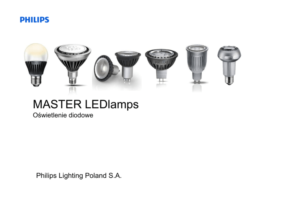 MASTER LEDlamps Oświetlenie diodowe Philips Lighting Poland S.A. MASTER LEDspot PAR38 E27 • 100% zamiennik lamp PAR38 • Temperatura barwowa: 2700K • Trzonek: • Niski pobór mocy: • • • • 16W -> zamiennik halogenu 75W oraz lampy żarowej 80W Światłość: 2800 cd Wysoka trwałość: 45 000 h Kąt rozsyłu: 25° Wskaźnik oddawania barw Ra: 80 MASTER LEDspot PAR 30S E27 • 100% zamiennik lamp PAR30 • Temperatura barwowa: 2700K • Trzonek: • Niski pobór mocy: • • • • 11W -> zamiennik lampy żarowej o mocy 75W Światłość: 1880 cd Wysoka trwałość: 45 000 h Kąt rozsyłu: 25° Wskaźnik oddawania barw Ra: 80 MASTER LEDbulb GLOW A60 • Trzonek: E27 2700K • Możliwość regulacji strumienia świetlnego (10%-100%) • Temperatura barwowa: • Niski pobór mocy: • 7W -> zamiennik lamp żarowych o mocy 40W Strumień świetlny: 400 lm Wysoka trwałość: 25 000 h Wskaźnik oddawania barw Ra: 80 • • MASTER LEDspot PERFECT FIT GU10 • 100% zamiennik lamp halogenowych o trzonku GU10 • Niski pobór mocy: 3W -> zamiennik halogenów „Twistline” o mocy 35W • Temperatura barwowa: • Światłość: 3000K • 550 cd Wysoka trwałość: 22 000 h • Kąt rozsyłu: • Wskaźnik oddawania barw Ra: c= 55,5 mm d= 50 mm 25° 80 MASTER LEDspot GU10 • Zamiennik lamp halogenowych o trzonku GU10 • Możliwość regulacji strumienia świetlnego • Niski pobór mocy: 7W -> zamiennik lamp halogenowych o mocy 35W • Temperatura barwowa: • Światłość: 2700K, 3000K, 4200K • 230 ÷ 800 cd (w zależności od wersji) Wysoka trwałość: 45 000 h • Kąt rozsyłu: • Wskaźnik oddawania barw Ra: 85 (2700K,3000K), 25° oraz 40° 70 (4200K) MASTER LEDspot NR63 E27 • Możliwość regulacji strumienia świetlnego • 7W -> zamiennik lamp żarowej do mocy 40W • Temperatura barwowa: 2700K, 4200K • Trzonek: • Światłość: 230 ÷ 800 cd (w zależności od wersji) • Trwałość: • Kąt rozsyłu: 25° oraz 40° • Wskaźnik oddawania barw Ra: 85 (3000K), 45 000 h 70 (4200K) MASTER LEDspot MR16 • 100% zamiennik lamp halogenowych o trzonku GU5.3 • Temperatura barwowa: • Niski pobór mocy: • • • 2700K oraz 3000K 4W -> zamiennik halogenów o mocy 20W Światłość: 600cd (2700K) – 650cd (3000K) Wysoka trwałość: 45 000 h Kąt rozsyłu: 24° • Wskaźnik oddawania barw Ra: 80 MASTER LEDbulb A55 E27 • Trzonek: • Temperatura barwowa: 2700K • Możliwość regulacji strumienia świetlnego (10%-100%) • 6W Strumień świetlny: 240 lm Wysoka trwałość: 45 000 h • Wskaźnik oddawania barw Ra: • • Niski pobór mocy: 85 MASTER LEDlamps - korzyści W trakcie trwałości MASTER LEDbulb wymianie ulegnie nastepująca liczba lamp żarowych i świetlówek kompaktowych 1. 2. 3. 4. 5. 6. Znaczące obniżenie kosztów użytkowania: – Wysoka trwałość => mniejsza częstotliwość wymian = ograniczenie kosztów – 80% oszczędności energii Prosty montaż: 100% zamienniki obecnie stosowanych lamp żarowych i halogenowych Przyjazny dla środowiska • Mniejsza emisja ciepła • Brak rtęci • Komponenty lamp całkowicie zgodne z Dyrektywą 2002/95/EC Nieszkodliwe światło: Brak promieniowana ultrafioletowego (UV) oraz podczerwonego (IR) Dopasowanie do potrzeb: Regulacja strumienia świetlnego, ciepłobiałe i chłodnobiałe światło Jakość technologii LED: Wysoka trwałość 10 MASTER LEDlamps - korzyści Koszty energii w zastosowaniu profesjonalnym (24h na dobę, 365 dni w roku, koszt kWh 0,45 PLN) 35W (HALOGEN GU10) 3W (MASTER LED GU10) (24*365)*35W X 0,45 PLN kWh 1000 (24*365)*3W X 0,45 PLN kWh 1000 Roczny koszt energii Roczny koszt energii 137,97 PLN 11,83 PLN 11