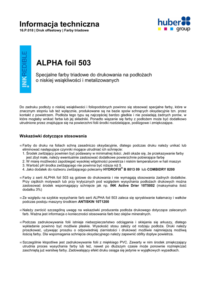 Informacja techniczna 16.P.018 | Druk offsetowy | Farby triadowe ALPHA foil 503 Specjalne farby triadowe do drukowania na podłożach o niskiej wsiąkliwości i metalizowanych Do zadruku podłoży o niskiej wsiąkliwości i foliopodobnych powinno się stosować specjalne farby, które w znacznym stopniu lub też wyłącznie, produkowane są na bazie spoiw schnących oksydacyjnie tzn. przez kontakt z powietrzem. Podłoża tego typu są najczęściej bardzo gładkie i nie posiadają żadnych porów, w które mogłaby wnikać farba lub jej składniki. Ponadto wiązanie się farby z podłożem może być dodatkowo utrudnione przez znajdujące się na powierzchni folii środki rozdzielające, poślizgowe i zmiękczające. Wskazówki dotyczące stosowania • Farby do druku na foliach schną zasadniczo oksydacyjnie, dlatego podczas druku należy unikać lub eliminować następujące czynniki mogące utrudniać ich schnięcie: 1. Środek zwilżający powinien być podawany w minimalnej ilości. Jeśli okaże się, że przekazywanie farby jest zbyt małe, należy ewentualnie zastosować dodatkowe powierzchnie pobierające farbę 2. W miarę możliwości zapobiegać wysokiej wilgotności powietrza i niskim temperaturom w hali maszyn 3. Wartość pH środka zwilżającego nie powinna być niższa niż 5 ® 4. Jako dodatek do roztworu zwilżającego polecamy HYDROFIX B 8013 09 lub COMBIDRY 8200 • Farby z serii ALPHA foil 503 są gotowe do drukowania i nie wymagają stosowania żadnych dodatków. Przy ciężkich motywach lub przy krytycznych pod względem wysychania podłożach drukowych można zastosować środek wspomagający schnięcie jak np. INK Active Drier 10T5002 (maksymalna ilość dodatku 3%) • Ze względu na szybkie wysychanie farb serii ALPHA foil 503 zaleca się spryskiwanie kałamarzy i wałków podczas postoju maszyny środkiem ANTISKIN 10T1200 • Należy zwrócić szczególną uwagę na wskazówki producenta podłoża drukowego dotyczące zalecanych farb. Ważna jest informacja o konieczności stosowania farb bez olejów mineralnych. • Podczas zadrukowywania folii istnieje niebezpieczeństwo odciągania i sklejania się arkuszy, dlatego wykładanie powinno być możliwie płaskie. Wysokość stosu zależy od rodzaju podłoża. Druki należy proszkować, używając proszku o odpowiedniej ziarnistości i drukować możliwie najmniejszą możliwą ilością farby. Dla wspomagania schnięcia oksydacyjnego należy zapewnić obfity dopływ powietrza. • Szczególnie kłopotliwe jest zadrukowywanie folii z miękkiego PVC. Zawarty w nim środek zmiękczający utrudnia proces wysychania farby lub też, nawet po dłuższym czasie może ponownie rozmiękczać zaschniętą już warstwę farby. Zadowalający efekt druku osiąga się jedynie w wyjątkowych wypadkach. • Zawsze przed drukiem właściwego nakładu zalecamy przeprowadzenie próby, w celu sprawdzenia, w warunkach praktycznych, czy wysychanie farby na danym podłożu jest właściwe. Należy zwrócić również uwagę na ocenę przyczepności do podłoża i odpowiedniej odporności na zadrapania (w zależności od przeznaczenia druku). • Seria farb ALPHA foli 503 ze względu na zawartość w swoim składzie olejów mineralnych nie jest zalecana do produkcji opakowań artykułów spożywczych. Odporności ALPHA foil 503 Parametry odporności wg normy DIN 16 524/25 Światło WS* Spirytus Rozpuszczalniki Alkalia Żółta 41 AP 503 5 + + + Magenta 42 AP 503 5 + + -* Cyjan 43 AP 503 8 + + + Czarna 49 AP 503 8 + + + *nie nadaje się do druku plakatów Farby mieszane dostępne są na specjalne zamówienie. Obowiązkowe oznaczenia ostrzegawcze Zgodnie z przepisami o substancjach niebezpiecznych - nie są wymagane Zgodnie z przepisami ppoż. - nie są wymagane. Pozostałe informacje zawiera karta charakterystyki preparatu. Opakowania Puszka o poj. 1 kg pakowana próżniowo Puszka o poj. 2,5 kg pakowana próżniowo Dalsze informacje i porady można uzyskać pod internetowym adresem: www.mhp.com.pl Niniejsza informacja techniczna odpowiada aktualnemu stanowi naszej wiedzy w tym temacie i spełnia tylko funkcję informacyjną i doradczą. Z tego względu nie może być podstawą do roszczeń prawnych. Zastrzeżone są zmiany wynikające z postępu technicznego