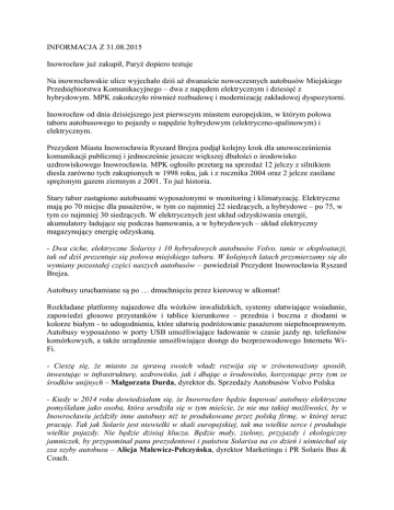 INFORMACJA Z 31.08.2015 Inowrocław już zakupił, Paryż dopiero testuje Na inowrocławskie ulice wyjechało dziś aż dwanaście nowoczesnych autobusów Miejskiego Przedsiębiorstwa Komunikacyjnego – dwa z napędem elektrycznym i dziesięć z hybrydowym. MPK zakończyło również rozbudowę i modernizację zakładowej dyspozytorni. Inowrocław od dnia dzisiejszego jest pierwszym miastem europejskim, w którym połowa taboru autobusowego to pojazdy o napędzie hybrydowym (elektryczno-spalinowym) i elektrycznym. Prezydent Miasta Inowrocławia Ryszard Brejza podjął kolejny krok dla unowocześnienia komunikacji publicznej i jednocześnie jeszcze większej dbałości o środowisko uzdrowiskowego Inowrocławia. MPK ogłosiło przetarg na sprzedaż 12 jelczy z silnikiem diesla zarówno tych zakupionych w 1998 roku, jak i z rocznika 2004 oraz 2 jelcze zasilane sprężonym gazem ziemnym z 2001. To już historia. Stary tabor zastąpiono autobusami wyposażonymi w monitoring i klimatyzację. Elektryczne mają po 70 miejsc dla pasażerów, w tym co najmniej 22 siedzących, a hybrydowe – po 75, w tym co najmniej 30 siedzących. W elektrycznych jest układ odzyskiwania energii, akumulatory ładujące się podczas hamowania, a w hybrydowych – układ elektryczny magazynujący energię odzyskaną. - Dwa ciche, elektryczne Solarisy i 10 hybrydowych autobusów Volvo, tanie w eksploatacji, tak od dziś prezentuje się połowa miejskiego taboru. W kolejnych latach przymierzamy się do wymiany pozostałej części naszych autobusów – powiedział Prezydent Inowrocławia Ryszard Brejza. Autobusy uruchamiane są po … dmuchnięciu przez kierowcę w alkomat! Rozkładane platformy najazdowe dla wózków inwalidzkich, systemy ułatwiające wsiadanie, zapowiedzi głosowe przystanków i tablice kierunkowe – przednia i boczna z diodami w kolorze białym - to udogodnienia, które ułatwią podróżowanie pasażerom niepełnosprawnym. Autobusy wyposażono w porty USB umożliwiające ładowanie w czasie jazdy np. telefonów komórkowych, a także urządzenie umożliwiające dostęp do bezprzewodowego Internetu WiFi. - Cieszę się, że miasto za sprawą swoich władz rozwija się w zrównoważony sposób, inwestując w infrastrukturę, uzdrowisko, jak i dbając o środowisko, korzystając przy tym ze środków unijnych – Małgorzata Durda, dyrektor ds. Sprzedaży Autobusów Volvo Polska - Kiedy w 2014 roku dowiedziałam się, że Inowrocław będzie kupować autobusy elektryczne pomyślałam jako osoba, która urodziła się w tym mieście, że nie ma takiej możliwości, by w Inowrocławiu jeździły inne autobusy niż te produkowane przez polską firmę, w której teraz pracuję. Tak jak Solaris jest niewielki w skali europejskiej, tak ma wielkie serce i produkuje wielkie pojazdy. Nie będzie dzisiaj klucza. Będzie mały, zielony, przyjazdy i ekologiczny jamniczek, by przypominał panu prezydentowi i państwu Solarisa na co dzień i uśmiechał się zza szyby autobusu – Alicja Malewicz-Pełczyńska, dyrektor Marketingu i PR Solaris Bus & Coach. Inwestycja obejmuje także tzw. Inteligentny System Transportowy. Przy dziesięciu przystankach zamontowane zostaną specjalne tablice. Pasażerowie będą mogli sprawdzać aktualny ruch pojazdów w mieście i kontrolować za ile minut przyjedzie autobus, na który oczekują. Te informacje będą też zapowiadane i wyświetlane w autobusach. Aktualną pozycję autobusów będzie można sprawdzić także online – w każdym urządzeniu z dostępem do Internetu. Mniej awarii, mniej napraw, mniejsze zużycie paliwa. Nowoczesne i ekologiczne pojazdy w 85 proc. sfinansowane ze środków Unii Europejskiej pozwolą inowrocławskiemu przewoźnikowi na znaczne oszczędności. Volvo 7900 Hybrid zużywa do 39% mniej paliwa i w odpowiednio mniejszym stopniu oddziałuje na klimat niż analogiczne autobusy w wersji diesel. Do tej pory firma sprzedała już prawie 2000 hybryd operatorom transportu publicznego w ponad dwudziestu krajach. Bezemisyjna, cicha i niezwykle płynna – tak najkrócej można scharakteryzować jazdę Solarisem Urbino 12 electric, które wkrótce wyjadą na berlińską linię nr 204, ulicę Barcelony, testowane są w Paryżu a od dziś jeżdżą na regularnej linii 27 w Inowrocławiu! Eksploatacja elektrycznego Solarisa pozwala na oszczędności rzędu około 70% w stosunku do autobusów napędzanych silnikiem diesla.