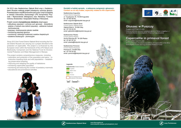 Projekt zawiera kompleksowe działania obejmujące: • odbudowę populacji i ochronę puli genowej - dosiedlenia ptaków z hodowli oraz dzikich populacji - założenie hodowli zachowawczej • poprawę i dostosowanie jakości siedlisk • monitoring populacji głuszca • monitoring i redukcję liczebności ssaków drapieżnych • działania edukacyjno - promocyjne Since 2012 the Forest District Głęboki Bród including the Forest District Ruszów are carrying out a project devoted to the protection of capercaillie. The project is co-financed by the European Union within the framework of the LIFE Nature and Biodiversity Component and the National Fund for Environmental Protection and Water Management in Warsaw. The project contains comprehensive measures, including: • restoration and protection of the population pool gene – introduction breeding birds and wild populations – establishing preservative breeding • improving and adapting the quality of habitations • monitoring capercaillie population • monitoring and reducing the number of predatory mammals • educational and promotional activities fot. M.Karłowicz Kontakt w każdej sprawie, a zwłaszcza związanej z głuszcem: Contact us on any matter, especially related to the capercaillie: Nadleśnictwo Augustów Forest District Augustów ul. Turystyczna 19, 16-300 Augustów tel.: 87 643 99 00 email: [email protected] Nadleśnictwo Głęboki Bród Forest District Głęboki Bród Głęboki Bród 4, 16-506 Giby tel.: 87 516 52 03 email: [email protected] Głuszec w Puszczy Projekt LIFE11 NAT/PL/428 Czynna ochrona nizinnych populacji głuszca (Tetrao urogallus L.) na terenie Borów Dolnośląskich i Puszczy Augustowskiej Nadleśnictwo Płaska Forest District Płaska Sucha Rzeczka 60, 16-326 Płaska tel.: 87 641 87 23 email: [email protected] Capercaillie in primeval forest Project LIFE11 NAT/PL/428 Active protection of lowland populations of Capercaillie in the Bory Dolnośląskie Forest and Augustowska Primeval Forest Nadleśnictwo Pomorze Forest District Pomorze Pomorze 8, 16-506 Giby tel.: 87 516 20 28 email: [email protected] Fot. W. Misiukiewicz Od 2012 roku Nadleśnictwo Głęboki Bród wraz z Nadleśnictwem Ruszów realizują projekt poświęcony ochronie głuszca. Przedsięwzięcie współfinansowane jest przez Unię Europejską w ramach instrumentu finansowego LIFE komponentu Przyroda i Różnorodność Biologiczna oraz Narodowy Fundusz Ochrony Środowiska i Gospodarki Wodnej w Warszawie. Mapa: G. Jasnoch Nadleśnictwo Głęboki Bród www.lifeurogallus.pl www.lifeurogallus.pl www.bialystok.lasy.gov.pl/web/gleboki_brod www.bialystok.lasy.gov.pl/web/gleboki_brod Lasy Lasy Państwowe Państwowe Fot. P. Płoński Fot. W. Misiukiewicz Fot. P. Płoński Głuszec Tetrao urogallus Jest gatunkiem borealnym, obejmującym swym zasięgiem północne obszary Eurazji oraz obszary górskie środkowej i zachodniej Europy. W Polsce występuje w czterech izolowanych populacjach: w Karpatach Zachodnich, Puszczy Solskiej i Lasach Janowskich, w Puszczy Augustowskiej oraz Borach Dolnośląskich. Najliczniejsza i największa terytorialnie jest populacja zachodniokarpacka. Born to be free Jest to metoda rozwijana przez dr Andrzeja Krzywińskiego. Polega na półnaturalnym odchowie młodych osobników pisklęta dzięki swobodnemu poruszaniu się poza wolierą, w której przebywa matka, przystosowują się do samodzielnego zdobywania pokarmu, unikania drapieżnictwa oraz wykształcają niezbędne zachowania socjalne. Dynamika liczebności Od dawna liczebność populacji głuszca wykazuje tendencje spadkowe. Jeszcze 100 lat temu w Polsce żyło około 2000-2500 ptaków. Obecnie łączna liczebność krajowej populacji wynosi zaledwie 350 – 500 osobników. Capercaillie (Tetrao urogallus) It’s boreal species, whose coverage areas are Eurasia and northern mountainous areas of central and western Europe. It occurs in four isolated populations: the Western Carpathian Mountains, the Solska Primeval Forest and the Lasy Janowskie Forest, the Bory Dolnośląskie Forest, the Augustowska Primeval Forest. The largest and the largest territory’s population is Western Carpathian population. Born to be free This method has been developed by Andrew Krzywinski. It’s based on semi-natural rearing of young animals – chicks thanks to the free movement outside the aviary, where is the mother, can self-adapt to acquire food, avoid predation, and develops the necessary social behavior. Fot. W. Misiukiewicz W Puszczy Augustowskiej w 1997 roku było około 60 głuszców, wiosną 2013 liczebność populacji augustowskiej wynosiła już tylko 30-35 osobników. Do najważniejszych czynników wpływających na wymieranie głuszca w kraju należą: drapieżnictwo, zmiany siedliskowe, antropopresja, zbyt mała liczebność izolowanych populacji oraz polowania na tokach przed 1995 rokiem. In 1997 in the Augustowska Primary Forest there was about 60 capercaillies. In spring of 2013 this population was only 30–35 individuals. The most important factors influencing the extinction of capercaillie are: predation, changes of habitations, anthropopressure, very small number of isolated populations and hunting program types before 1995. Jestem największym ptakiem grzebiącym w Europie. I’m the biggest bird rummager in Europe Dynamics of the numbers For a long time the capercaillie population has been decreasing. Even 100 years ago in Poland lived about 2000–2500 birds. Currently the total population size is only 350–500 individuals. Rysunek: T. Samojlik W Polsce głuszec od roku 1995 objęty został ochroną gatunkową ścisłą, a jego tokowiska podlegają dodatkowo ochronie strefowej. Gatunek wpisany jest również do „Polskiej czerwonej księgi zwierząt” jako gatunek skrajnie zagrożony (kategoria CR). Since 1995 the capercaillie in Poland was included in the strict species protection, and the tooting are additionally protected zone. Species is also listed