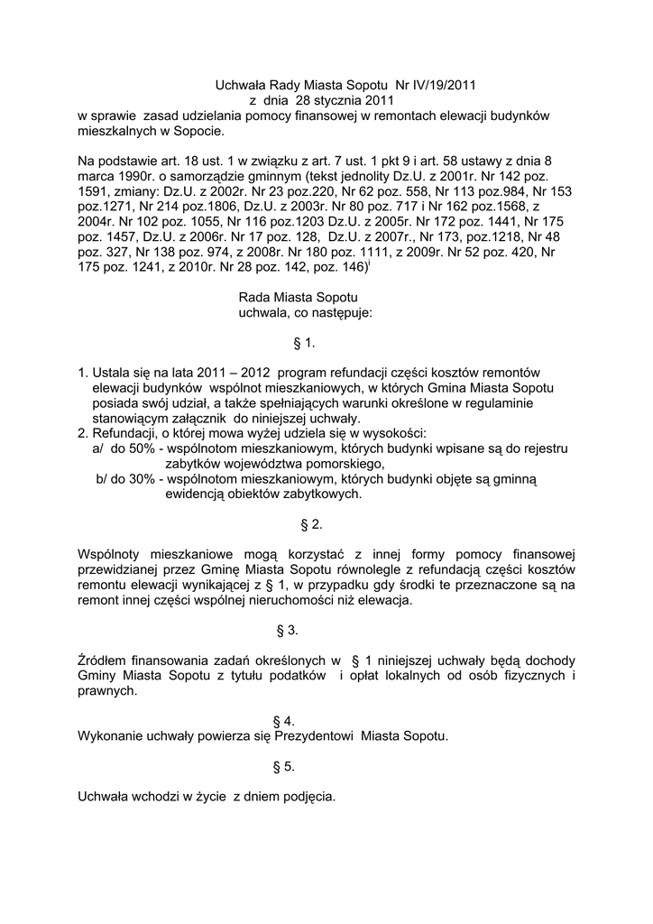 Uchwała Rady Miasta Sopotu Nr IV/19/2011 z dnia 28 stycznia 2011 w sprawie zasad udzielania pomocy finansowej w remontach elewacji budynków mieszkalnych w Sopocie. Na podstawie art. 18 ust. 1 w związku z art. 7 ust. 1 pkt 9 i art. 58 ustawy z dnia 8 marca 1990r. o samorządzie gminnym (tekst jednolity Dz.U. z 2001r. Nr 142 poz. 1591, zmiany: Dz.U. z 2002r. Nr 23 poz.220, Nr 62 poz. 558, Nr 113 poz.984, Nr 153 poz.1271, Nr 214 poz.1806, Dz.U. z 2003r. Nr 80 poz. 717 i Nr 162 poz.1568, z 2004r. Nr 102 poz. 1055, Nr 116 poz.1203 Dz.U. z 2005r. Nr 172 poz. 1441, Nr 175 poz. 1457, Dz.U. z 2006r. Nr 17 poz. 128, Dz.U. z 2007r., Nr 173, poz.1218, Nr 48 poz. 327, Nr 138 poz. 974, z 2008r. Nr 180 poz. 1111, z 2009r. Nr 52 poz. 420, Nr 175 poz. 1241, z 2010r. Nr 28 poz. 142, poz. 146)i Rada Miasta Sopotu uchwala, co następuje: § 1. 1. Ustala się na lata 2011 – 2012 program refundacji części kosztów remontów elewacji budynków wspólnot mieszkaniowych, w których Gmina Miasta Sopotu posiada swój udział, a takŜe spełniających warunki określone w regulaminie stanowiącym załącznik do niniejszej uchwały. 2. Refundacji, o której mowa wyŜej udziela się w wysokości: a/ do 50% - wspólnotom mieszkaniowym, których budynki wpisane są do rejestru zabytków województwa pomorskiego, b/ do 30% - wspólnotom mieszkaniowym, których budynki objęte są gminną ewidencją obiektów zabytkowych. § 2. Wspólnoty mieszkaniowe mogą korzystać z innej formy pomocy finansowej przewidzianej przez Gminę Miasta Sopotu równolegle z refundacją części kosztów remontu elewacji wynikającej z § 1, w przypadku gdy środki te przeznaczone są na remont innej części wspólnej nieruchomości niŜ elewacja. § 3. Źródłem finansowania zadań określonych w § 1 niniejszej uchwały będą dochody Gminy Miasta Sopotu z tytułu podatków i opłat lokalnych od osób fizycznych i prawnych. § 4. Wykonanie uchwały powierza się Prezydentowi Miasta Sopotu. § 5. Uchwała wchodzi w Ŝycie z dniem podjęcia. Uzasadnienie Uchwałą Rady Miasta Sopotu Nr XIX/307/2000 z dnia 8 grudnia 2000r. przyjęto do realizacji program „100 elewacji na stulecie” miasta, mający na celu zintensyfikowanie działań zmierzających do poprawienia wizerunku miasta. W ramach programu wspólnoty mieszkaniowe mogą uzyskać pomoc finansową w postaci refundacji części kosztów remontu elewacji. Wstępne załoŜenia określały wydatkowanie przez miasto kwoty ok. 4 mln złotych w przeciągu 2 lat, jako Ŝe program przyjęto na lata 2001-2002. Z uwagi na duŜe zainteresowanie wspólnot mieszkaniowych oraz widoczne efekty w mieście Rada Miasta Sopotu postanowiła kontynuować program i podjęła kolejno we wrześniu 2002r. uchwałę w sprawie udzielania pomocy finansowej w remontach elewacji budynków mieszkalnych w latach 2003-2004, w październiku 2004r. w sprawie udzielania pomocy finansowej na lata 2005-2006 oraz w październiku 2006r. w sprawie udzielania pomocy finansowej w remontach elewacji budynków mieszkalnych na lata 2007-2008, natomiast w listopadzie 2008r. na lata 2009-2010. PoniewaŜ zainteresowanie programem jest nadal ogromne i środki zabezpieczane na ten cel w budŜecie miasta na dany rok są zawsze niŜsze w stosunku do wniosków składanych przez wspólnoty mieszkaniowe, celowym jest kontynuowanie programu. W latach 2001 – 2010 przeznaczono w budŜecie miasta na finansowanie programu refundacji części kosztów remontu elewacji około 8.000.000zł. Dzięki wprowadzeniu tego programu udało się uruchomić inicjatywę mieszkańców w dąŜeniu do poprawy wyglądu budynku jak równieŜ poprawy estetyki posesji. Wspólnoty mieszkaniowe mogąc uzyskać pomoc finansową ze strony miasta przy remoncie elewacji mobilizują się i wykonują niezbędne remonty /dach, opierzenia, izolacja ścian fundamentowych/ we własnym zakresie, co oznacza, iŜ zaangaŜowanie finansowe mieszkańców wyraźnie przewyŜsza wkład miasta w program rewitalizacji. Przez 10 lat działania programu 179 wspólnot mieszkaniowych skorzystało z pomocy finansowej miasta – przystępując do remontu elewacji budynków. Decyzją nr 936 z dnia 12 lutego 1979r. Sopot został wpisany do rejestru zabytków Województwa Pomorskiego jako zespół urbanistyczno-krajobrazowy i fakt ten obliguje władze miasta do działań mających na celu ochronę i opiekę nad zabytkami. Działający od 2001 roku program refundacji remontu części kosztów elewacji jest jednym z elementów polityki miasta dotyczącej ochrony zabytkowej substancji mieszkaniowej. W świetle powyŜszego Prezydent Miasta Sopotu wnioskuje o przyjęcie programu refundacji części kosztów remontu elewacji na kolejne lata 2011-2012.