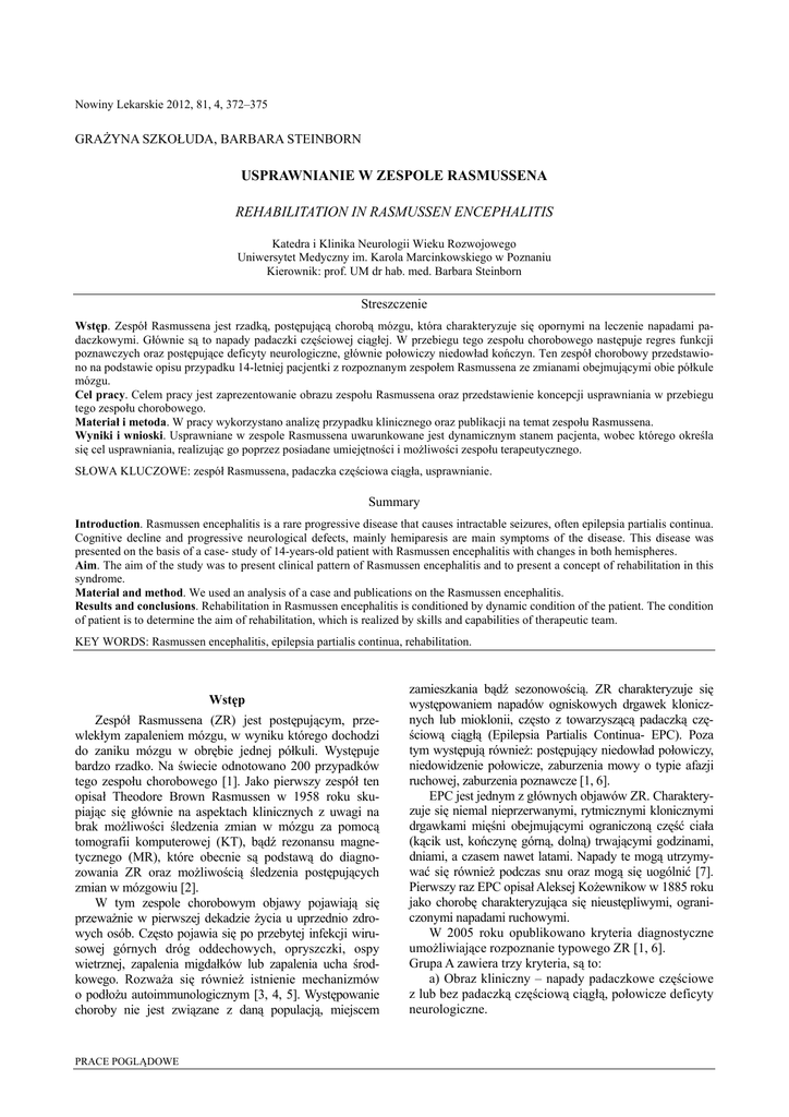 Nowiny Lekarskie 2012, 81, 4, 372–375 GRAŻYNA SZKOŁUDA, BARBARA STEINBORN USPRAWNIANIE W ZESPOLE RASMUSSENA REHABILITATION IN RASMUSSEN ENCEPHALITIS Katedra i Klinika Neurologii Wieku Rozwojowego Uniwersytet Medyczny im. Karola Marcinkowskiego w Poznaniu Kierownik: prof. UM dr hab. med. Barbara Steinborn Streszczenie Wstęp. Zespół Rasmussena jest rzadką, postępującą chorobą mózgu, która charakteryzuje się opornymi na leczenie napadami padaczkowymi. Głównie są to napady padaczki częściowej ciągłej. W przebiegu tego zespołu chorobowego następuje regres funkcji poznawczych oraz postępujące deficyty neurologiczne, głównie połowiczy niedowład kończyn. Ten zespół chorobowy przedstawiono na podstawie opisu przypadku 14-letniej pacjentki z rozpoznanym zespołem Rasmussena ze zmianami obejmującymi obie półkule mózgu. Cel pracy. Celem pracy jest zaprezentowanie obrazu zespołu Rasmussena oraz przedstawienie koncepcji usprawniania w przebiegu tego zespołu chorobowego. Materiał i metoda. W pracy wykorzystano analizę przypadku klinicznego oraz publikacji na temat zespołu Rasmussena. Wyniki i wnioski. Usprawniane w zespole Rasmussena uwarunkowane jest dynamicznym stanem pacjenta, wobec którego określa się cel usprawniania, realizując go poprzez posiadane umiejętności i możliwości zespołu terapeutycznego. SŁOWA KLUCZOWE: zespół Rasmussena, padaczka częściowa ciągła, usprawnianie. Summary Introduction. Rasmussen encephalitis is a rare progressive disease that causes intractable seizures, often epilepsia partialis continua. Cognitive decline and progressive neurological defects, mainly hemiparesis are main symptoms of the disease. This disease was presented on the basis of a case- study of 14-years-old patient with Rasmussen encephalitis with changes in both hemispheres. Aim. The aim of the study was to present clinical pattern of Rasmussen encephalitis and to present a concept of rehabilitation in this syndrome. Material and method. We used an analysis of a case and publications on the Rasmussen encephalitis. Results and conclusions. Rehabilitation in Rasmussen encephalitis is conditioned by dynamic condition of the patient. The condition of patient is to determine the aim of rehabilitation, which is realized by skills and capabilities of therapeutic team. KEY WORDS: Rasmussen encephalitis, epilepsia partialis continua, rehabilitation. Wstęp Zespół Rasmussena (ZR) jest postępującym, przewlekłym zapaleniem mózgu, w wyniku którego dochodzi do zaniku mózgu w obrębie jednej półkuli. Występuje bardzo rzadko. Na świecie odnotowano 200 przypadków tego zespołu chorobowego [1]. Jako pierwszy zespół ten opisał Theodore Brown Rasmussen w 1958 roku skupiając się głównie na aspektach klinicznych z uwagi na brak możliwości śledzenia zmian w mózgu za pomocą tomografii komputerowej (KT), bądź rezonansu magnetycznego (MR), które obecnie są podstawą do diagnozowania ZR oraz możliwością śledzenia postępujących zmian w mózgowiu [2]. W tym zespole chorobowym objawy pojawiają się przeważnie w pierwszej dekadzie życia u uprzednio zdrowych osób. Często pojawia się po przebytej infekcji wirusowej górnych dróg oddechowych, opryszczki, ospy wietrznej, zapalenia migdałków lub zapalenia ucha środkowego. Rozważa się również istnienie mechanizmów o podłożu autoimmunologicznym [3, 4, 5]. Występowanie choroby nie jest związane z daną populacją, miejscem PRACE POGLĄDOWE zamieszkania bądź sezonowością. ZR charakteryzuje się występowaniem napadów ogniskowych drgawek klonicznych lub mioklonii, często z towarzyszącą padaczką częściową ciągłą (Epilepsia Partialis Continua- EPC). Poza tym występują również: postępujący niedowład połowiczy, niedowidzenie połowicze, zaburzenia mowy o typie afazji ruchowej, zaburzenia poznawcze [1, 6]. EPC jest jednym z głównych objawów ZR. Charakteryzuje się niemal nieprzerwanymi, rytmicznymi klonicznymi drgawkami mięśni obejmującymi ograniczoną część ciała (kącik ust, kończynę górną, dolną) trwającymi godzinami, dniami, a czasem nawet latami. Napady te mogą utrzymywać się również podczas snu oraz mogą się uogólnić [7]. Pierwszy raz EPC opisał Aleksej Kożewnikow w 1885 roku jako chorobę charakteryzująca się nieustępliwymi, ograniczonymi napadami ruchowymi. W 2005 roku opublikowano kryteria diagnostyczne umożliwiające rozpoznanie typowego ZR [1, 6]. Grupa A zawiera trzy kryteria, są to: a) Obraz kliniczny – napady padaczkowe częściowe z lub bez padaczką częściową ciągłą, połowicze deficyty neurologiczne. Usprawnianie w zespole Rasmussena 373 b) Wynik EEG – zwolnienie zapisu w jednej półkuli z lub bez zmian ogniskowych c) Obraz rezonansu magnetycznego – zanik korowy mózgu jednostronny i obecność zmian hiperintensywnych w obszarze T2 – zależnym w istocie szarej i/lub białej albo hiperintensywny sygnał lub zanik w głowie jądra ogoniastego. Grupa B zawiera również trzy kryteria, są to: a) Obraz kliniczny – padaczka częściowa ciągła lub postępujące połowicze deficyty neurologiczne. b) Obraz rezonansu magnetycznego – postępujący zanik korowy mózgu w jednej półkuli. c) Obraz histopatologiczny – przewlekłe zapalenie z obecnością limfocytów T. Do rozpoznania ZR muszą być spełnione wszystkie trzy kryteria z grupy A lub dwa z grupy B. Leczenie farmakologiczne tego zespołu chorobowego jest wyzwaniem dla neurologów, gdyż EPC bardzo trudno poddaje się leczeniu. Leczenie operacyjne jakim jest hemisferektomia, czyli resekcja płata skroniowego, usunięcie zakrętów przed- i zarodkowego okolicy czuciowo-ruchowej z pozostawieniem wzgórza i innych jąder podkorowych oraz pełnej kallostomii wydaje się być najlepszym sposobem leczenia tego schorzenia. Jednak kandydaci do tego zabiegu operacyjnego muszą być wyselekcjonowani bardzo precyzyjnie. Najlepszymi kandydatami do hemisferektomii c