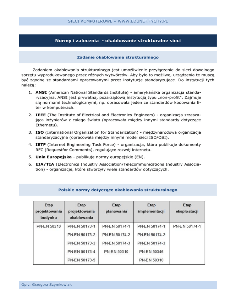 SIECI KOMPUTEROWE – WWW.EDUNET.TYCHY.PL Normy i zalecenia - okablowanie strukturalne sieci Zadanie okablowanie strukturalnego Zadaniem okablowania strukturalnego jest umożliwienie przyłączenie do sieci dowolnego sprzętu wyprodukowanego przez różnych wytwórców. Aby było to możliwe, urządzenia te muszą być zgodne ze standardami opracowanymi przez instytucje standaryzujące. Do instytucji tych należą: 1. ANSI (American National Standards Institute) - amerykańska organizacja standaryzacyjna. ANSI jest prywatną, pozarządową instytucją typu „non-profit". Zajmuje się normami technologicznymi, np. opracowała jeden ze standardów kodowania liter w komputerach. 2. IEEE (The Institute of Electrical and Electronics Engineers) - organizacja zrzeszająca inżynierów z całego świata (opracowała między innymi standardy dotyczące Ethernetu). 3. ISO (International Organization for Standarization) - międzynarodowa organizacja standaryzacyjna (opracowała między innymi model sieci ISO/OSI). 4. IETF (Internet Engineering Task Force) - organizacja, która publikuje dokumenty RFC (Reąuestfor Comments), regulujące rozwój internetu. 5. Unia Europejska - publikuje normy europejskie (EN). 6. EIA/TIA (Electronics Industry Association/Telecommunications Industry Association) - organizacje, które stworzyły wiele standardów dotyczących. Polskie normy dotyczące okablowania strukturalnego Opr.: Grzegorz Szymkowiak SIECI KOMPUTEROWE – WWW.EDUNET.TYCHY.PL Większość zagadnień związanych z okablowaniem strukturalnym określa norma EN 50173. Wśród pozostałych norm na szczególną uwagę zasługują: PN-EN 50174-1 - Specyfikacja i zapewnienie jakości. PN-EN 50174-2 - Planowanie i wykonawstwo instalacji wewnątrz budynków. PN-EN 50174-3 - Planowanie i wykonawstwo instalacji na zewnątrz budynków. Zalecenia ogólne 1. Okablowanie poziome powinno tworzyć nieprzerwane połączenie od punktu dystrybucyjnego do punktu abonenckiego. 2. Należy umieścić jeden punkt abonencki (2xRJ-45) na każde 10 m2 powierzchni biurowej. 3. Na każdym piętrze budynku powinien być punkt dystrybucyjny (w przypadku małej liczby punktów abonenckich możliwe jest ich przyłączenie do punktu dystrybucyjnego na innym piętrze). 4. Wszystkie kable muszą być zakończone w gniazdach abonenckich i szafach dystrybucyjnych. 5. W obrębie całej sieci powinno się stosować jednakowe przewody (kable miedziane o jednakowej impedancji i średnicy, a kable światłowodowe o jednakowych włóknach). 6. Rozplot kabla UTP nie powinien być większy niż 13 mm. 7. Każdy element systemu powinien być czytelnie oznaczony (jednakowe oznaczenie na obu końcach kabla). 8. Sieć musi posiadać pełną dokumentację. Zalecenia dotyczące kabli w przebiegach poziomych Normy zalecają stosowanie 4-parowego symetrycznego kabla STP lub UTP kategorii co najmniej 5e dla wszystkich kanałów poziomych. 1. Parametry kabla wymagane przez normy: średnica przewodów: 0,45/0,65 mm, nominalna impedancja: 100 Ω ± 15%, tłumienność dla kategorii 5 przy f= 100 MHz - 24,0 dB, Opr.: Grzegorz Szymkowiak SIECI KOMPUTEROWE – WWW.EDUNET.TYCHY.PL tłumienność dla kategorii 6 przy f = 100 MHz - 21,1 dB. 2. Długość przebiegu kabla poziomego całkowita długość kanału nie może przekroczyć 100 m. (A+B+C), maksymalna długość przebiegu kabla poziomego pomiędzy punktem abonenckim a punktem dystrybucyjnym w panelu krosowym (patch panel) wynosi 90 m (B), maksymalna długość kabli krosowych pomiędzy panelem krosowym a przełącznikiem wynosi 6 m (A), maksymalna długość kabla stacyjnego i krosowego łączne wynosi 10 m (A+C). 3. Zasady obowiązujące podczas układania kabla w przebiegach poziomych: kable biegnące ponad sufitem podwieszanym nie powinny być mocowane do konstrukcji sufitu, odległości pomiędzy punktami mocowania kabli poziomych nie powinny być większe niż 1,2 -1,5 m, aby zachować przejrzystość instalacji i ułatwić obsługę, należy wszystkie kable prowadzić prostopadle lub równolegle do korytarza, kable wchodzące i wychodzące do/z pomieszczeń (pod kątem 90°) powinny skręcać łagodnie (minimalny promień skrętu = 8 średnic kabla), instalując kable, należy sprawdzać, czy nie są naprężone na końcach i na całym swoim przebiegu. Jeżeli kable znajdują się na otwartej przestrzeni, powinny być umieszczone w jednej płaszczyźnie, nie wolno owijać kabli dookoła rur, kolumn, itp., kable, na całej długości od gniazda abonenckiego do punktu dystrybucyjnego, powinny być wolne od „sztukowań”, zagnieceń i nacięć lub złamań, nie można rozdzielać par przewodów na dwa kanały komunikacyjne, kable powinny być wyprowadzane i wprowadzane z głównych tras przebiegu pod kątem 90°, zaś promień ich zagięć w kanałach powinien być zgodny z zaleceniami producenta kabla. Opr.: Grzegorz Szymkowiak SIECI KOMPUTEROWE – WWW.EDUNET.TYCHY.PL 4. Minimalny promień zgięcia kabli jeżeli producent nie zaleci inaczej: dla skrętki UTP - 4 średnice kabla, dla skrętki STP - 6 średnic kabla, dla kabla światłowodowego od 10 do 20 średnic w zależności od sposobu wykonania. 5. Ustalając trasę przebiegu kabla, należy zachować następujące odległości od źródeł zasilania: 30 cm od wysokonapięciowego oświetlenia (świetlówki), 90 cm od przewodów elektrycznych 5 KVA lub więcej, 100 cm od transformatorów i silników. Wymagania instalacyjne dla przebiegów pionowych Do budowy przebiegów pionowych zalecane jest używanie kabli światłowodowych lub w wyjątkowych przypadkach - skrętki. 1. Do prowadzenia kabli między piętrami stosuje się: rękaw o średnicy co najmniej 10 cm (mogą one wystawać od 2,5 cm do 10 cm powyżej płaszczyzny podłogi), prostokątne szyby o minimalnym wymiarze 15 cm x 22,5 cm. 2. Mocowanie kabli: jeżeli trasa przebiegu kabli pionowych obejmuje więcej niż dwa piętra lub gdy kable są wyjątkowo ciężkie (np. wieloparowe kable miedz