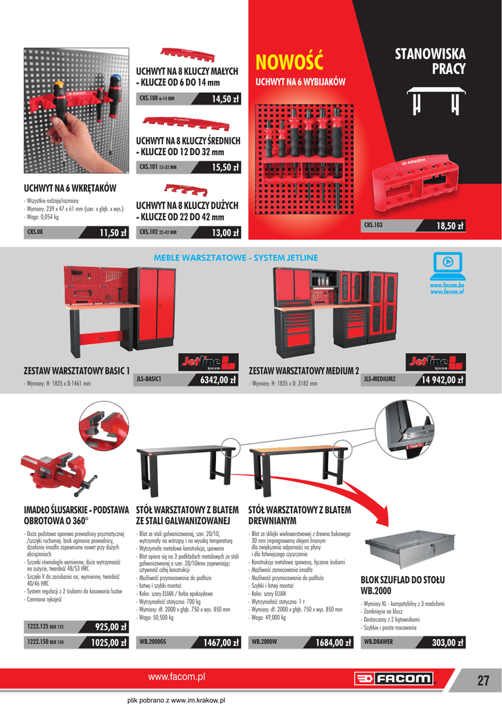 UCHWYT NA 8 KLUCZY MAŁYCH - KLUCZE OD 6 DO 14 mm STANOWISKA PRACY NOWOŚĆ UCHWYT NA 6 WYBIJAKÓW 14,50 zł CKS.100 6-14 mm UCHWYT NA 8 KLUCZY ŚREDNICH - KLUCZE OD 12 DO 32 mm 15,50 zł CKS.101 12-32 mm UCHWYT NA 6 WKRĘTAKÓW - Wszystkie rodzaje/rozmiary - Wymiary: 239 x 47 x 61 mm (szer. x głęb. x wys.) - Waga: 0,054 kg CKS.08 UCHWYT NA 8 KLUCZY DUŻYCH - KLUCZE OD 22 DO 42 mm 11,50 zł CKS.103 13,00 zł CKS.102 22-42 mm 18,50 zł MEBLE WARSZTATOWE - SYSTEM JETLINE www.facom.be www.facom.nl ZESTAW WARSZTATOWY BASIC 1 - Wymiary: H: 1835 x D:1461 mm JLS-BASIC1 6342,00 zł ZESTAW WARSZTATOWY MEDIUM 2 - Wymiary: H: 1835 x D: 3182 mm JLS-MEDIUM2 14 942,00 zł IMADŁO ŚLUSARSKIE - PODSTAWA STÓŁ WARSZTATOWY Z BLATEM STÓŁ WARSZTATOWY Z BLATEM OBROTOWA O 360° ZE STALI GALWANIZOWANEJ DREWNIANYM - Duża podstawa oporowa prowadnicy pryzmatycznej /szczęki ruchomej: brak uginania prowadnicy, działanie imadla zapewnione nawet przy dużych obciążeniach - Szczeki równoległe wymienne; duża wytrzymaość na zużycie, twardość 48/53 HRC - Szczęki V do zaciskania rur, wymienne; twardość 40/46 HRC - System regulacji z 2 śrubami do kasowania luzów - Czerniona rękojeść 1222.125 BEK 125 925,00 zł 1222.150 BEK 150 1025,00 zł - Blat ze stali galwanizowanej, szer. 20/10, wytrzymały na wstrząsy i na wysoką temperaturę - Wytrzymała metalowa konstrukcja, spawana - Blat opiera się na 3 podkładach metalowych ze stali galwanizowanej o szer. 20/10ème zapewniając sztywność całej konstrukcji - Możliwość przymocowania do podłoża - Łatwy i szybki montaż - Kolor: szary ELIAN / farba epoksydowa - Wytrzymałość statyczna: 700 kg - Wymiary: dł. 2000 x głęb. 750 x wys. 850 mm - Waga: 50,500 kg WB.2000GS 1467,00 zł www.facom.pl plik pobrano z www.im.krakow.pl - Blat ze sklejki wielowarstwowej z drewna bukowego 30 mm impregnowany olejem lnianym dla zwiększenia odporności na płyny i dla łatwiejszego czyszczenia - Konstrukcja metalowa spawana, łączona śrubami - Możliwość zamocowania imadła - Możliwość przymocowania do podłoża - Szybki i łatwy montaż - Kolor: szary ELIAN - Wytrzymałość statyczna: 1 t - Wymiary: dł. 2000 x głęb. 750 x wys. 850 mm - Waga: 49,000 kg WB.2000W 1684,00 zł BLOK SZUFLAD DO STOŁU WB.2000 - Wymiary XL - kompatybilny z 3 modułami - Zamknięcie na klucz - Dostarczany z 2 kątownikami - Szybkie i proste mocowanie WB.DRAWER 303,00 zł 27