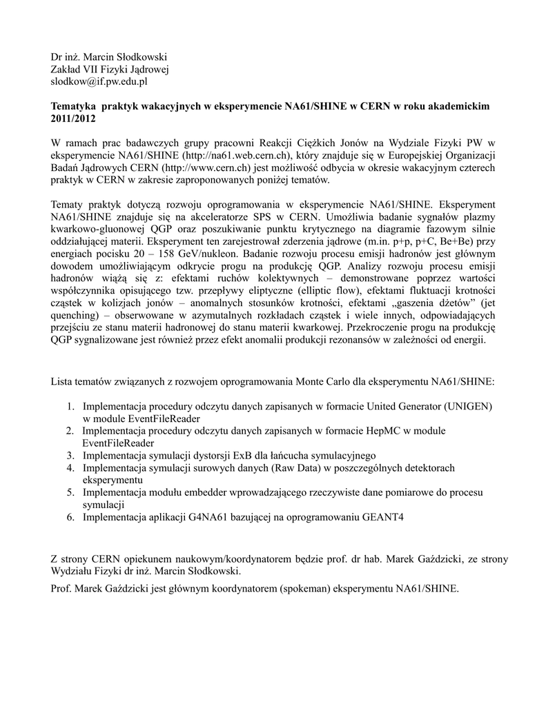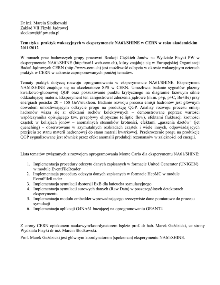 Dr inż. Marcin Słodkowski Zakład VII Fizyki Jądrowej [email protected] Tematyka praktyk wakacyjnych w eksperymencie NA61/SHINE w CERN w roku akademickim 2011/2012 W ramach prac badawczych grupy pracowni Reakcji Ciężkich Jonów na Wydziale Fizyki PW w eksperymencie NA61/SHINE (http://na61.web.cern.ch), który znajduje się w Europejskiej Organizacji Badań Jądrowych CERN (http://www.cern.ch) jest możliwość odbycia w okresie wakacyjnym czterech praktyk w CERN w zakresie zaproponowanych poniżej tematów. Tematy praktyk dotyczą rozwoju oprogramowania w eksperymencie NA61/SHINE. Eksperyment NA61/SHINE znajduje się na akceleratorze SPS w CERN. Umożliwia badanie sygnałów plazmy kwarkowo-gluonowej QGP oraz poszukiwanie punktu krytycznego na diagramie fazowym silnie oddziałującej materii. Eksperyment ten zarejestrował zderzenia jądrowe (m.in. p+p, p+C, Be+Be) przy energiach pocisku 20 – 158 GeV/nukleon. Badanie rozwoju procesu emisji hadronów jest głównym dowodem umożliwiającym odkrycie progu na produkcję QGP. Analizy rozwoju procesu emisji hadronów wiążą się z: efektami ruchów kolektywnych – demonstrowane poprzez wartości współczynnika opisującego tzw. przepływy eliptyczne (elliptic flow), efektami fluktuacji krotności cząstek w kolizjach jonów – anomalnych stosunków krotności, efektami „gaszenia dżetów” (jet quenching) – obserwowane w azymutalnych rozkładach cząstek i wiele innych, odpowiadających przejściu ze stanu materii hadronowej do stanu materii kwarkowej. Przekroczenie progu na produkcję QGP sygnalizowane jest również przez efekt anomalii produkcji rezonansów w zależności od energii. Lista tematów związanych z rozwojem oprogramowania Monte Carlo dla eksperymentu NA61/SHINE: 1. Implementacja procedury odczytu danych zapisanych w formacie United Generator (UNIGEN) w module EventFileReader 2. Implementacja procedury odczytu danych zapisanych w formacie HepMC w module EventFileReader 3. Implementacja symulacji dystorsji ExB dla łańcucha symulacyjnego 4. Implementacja symulacji surowych danych (Raw Data) w poszczególnych detektorach eksperymentu 5. Implementacja modułu embedder wprowadzającego rzeczywiste dane pomiarowe do procesu symulacji 6. Implementacja aplikacji G4NA61 bazującej na oprogramowaniu GEANT4 Z strony CERN opiekunem naukowym/koordynatorem będzie prof. dr hab. Marek Gaździcki, ze strony Wydziału Fizyki dr inż. Marcin Słodkowski. Prof. Marek Gaździcki jest głównym koordynatorem (spokeman) eksperymentu NA61/SHINE.