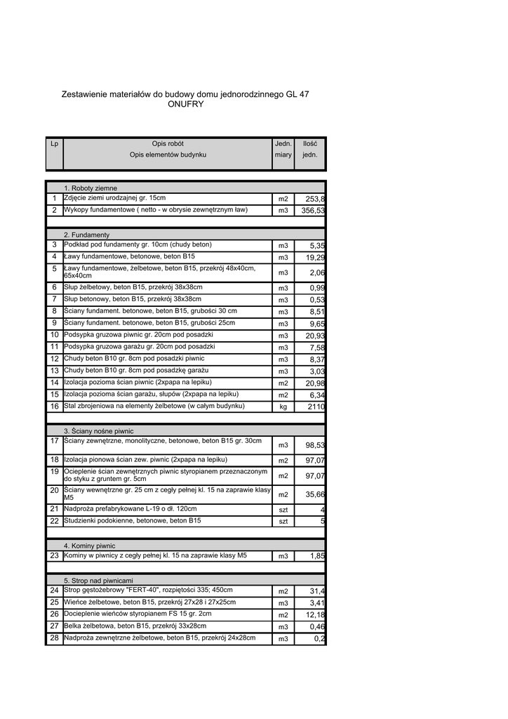 Zestawienie materiałów do budowy domu jednorodzinnego GL 47