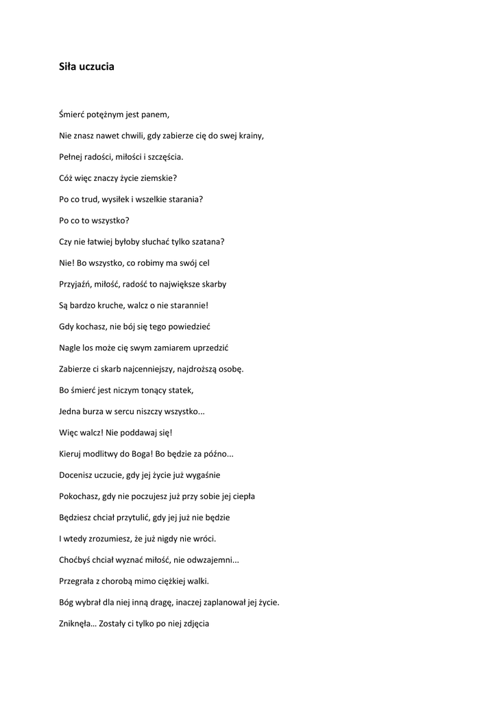 Siła uczucia Śmierd potężnym jest panem, Nie znasz nawet chwili, gdy zabierze cię do swej krainy, Pełnej radości, miłości i szczęścia. Cóż więc znaczy życie ziemskie? Po co trud, wysiłek i wszelkie starania? Po co to wszystko? Czy nie łatwiej byłoby słuchad tylko szatana? Nie! Bo wszystko, co robimy ma swój cel Przyjaźo, miłośd, radośd to największe skarby Są bardzo kruche, walcz o nie starannie! Gdy kochasz, nie bój się tego powiedzied Nagle los może cię swym zamiarem uprzedzid Zabierze ci skarb najcenniejszy, najdroższą osobę. Bo śmierd jest niczym tonący statek, Jedna burza w sercu niszczy wszystko... Więc walcz! Nie poddawaj się! Kieruj modlitwy do Boga! Bo będzie za późno... Docenisz uczucie, gdy jej życie już wygaśnie Pokochasz, gdy nie poczujesz już przy sobie jej ciepła Będziesz chciał przytulid, gdy jej już nie będzie I wtedy zrozumiesz, że już nigdy nie wróci. Chodbyś chciał wyznad miłośd, nie odwzajemni... Przegrała z chorobą mimo ciężkiej walki. Bóg wybrał dla niej inną dragę, inaczej zaplanował jej życie. Zniknęła… Zostały ci tylko po niej zdjęcia Ale na zawsze będzie w twoim sercu. Bo to jest miłośd Ona nie umiera, mimo ze dwoje ludzi śmierd rozdzieliła… Bo ci, co zostali pokonani przez miłośd Tak naprawdę ją wygrali…