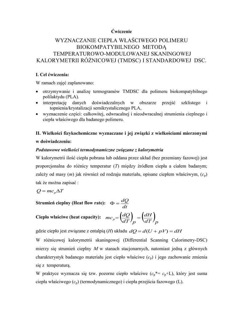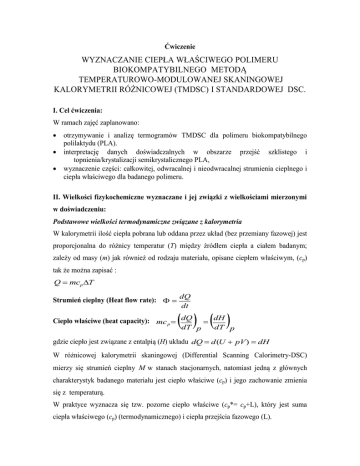 Ćwiczenie WYZNACZANIE CIEPŁA WŁAŚCIWEGO POLIMERU BIOKOMPATYBILNEGO METODĄ TEMPERATUROWO-MODULOWANEJ SKANINGOWEJ KALORYMETRII RÓŻNICOWEJ (TMDSC) I STANDARDOWEJ DSC. I. Cel ćwiczenia: W ramach zajęć zaplanowano: otrzymywanie i analizę termogramów TMDSC dla polimeru biokompatybilnego polilaktydu (PLA). interpretację danych doświadczalnych w obszarze przejść szklistego i topnienia/krystalizacji semikrystalicznego PLA, wyznaczenie części: całkowitej, odwracalnej i nieodwracalnej strumienia cieplnego i ciepła właściwego dla badanego polimeru. II. Wielkości fizykochemiczne wyznaczane i jej związki z wielkościami mierzonymi w doświadczeniu: Podstawowe wielkości termodynamiczne związane z kalorymetria W kalorymetrii ilość ciepła pobrana lub oddana przez układ (bez przemiany fazowej) jest proporcjonalna do różnicy temperatur (T) między źródłem ciepła a ciałem badanym; zależy od masy (m) jak również od rodzaju materiału, opisane ciepłem właściwym, (cp) tak że można zapisać : Q mcp T Strumień cieplny (Heat flow rate): dQ dt dH Ciepło właściwe (heat capacity): mc p dQ dT p dT p gdzie ciepło jest związane z entalpią (H) układu dQ d (U pV ) dH W różnicowej kalorymetrii skaningowej (Differential Scanning Calorimetry-DSC) mierzy się strumień cieplny w stanach stacjonarnych, natomiast jedną z głównych charakterystyk badanego materiału jest ciepło właściwe (cp) i jego zachowanie zmienia się z temperaturą. W praktyce wyznacza się tzw. pozorne ciepło właściwe (cp*= cp+L), który jest suma ciepła właściwego (cp) (termodynamicznego) i ciepła przejścia fazowego (L). W standardowej różnicowej kalorymetrii skaningowej (DSC) stosuje się liniowy program wzrostu temperatury: T (t ) T0 qt Temperaturowo modulowana różnicowa kalorymetria skaningowa (Temperature Modulated Differential Scanning Calorimetry-TMDSC) Standardowa TMDSC W temperaturowo modulowanej różnicowej kalorymetrii skaningowej (TMDSC) stosuje się liniowy i sinusoidalny program wzrostu temperatury: T (t ) T0 qt ATs sin(t ) Odpowiedzią układu jest modulowany strumień cieplny, który podlega dekonwolucji używając analizy Fouriera w wyniku czego otrzymuje się trzy charakterystyki: tzw. odwracalny (reversing), nieodwracalny (non-reversing) i całkowity (total heat flow-rate) strumień cieplny. Rysunek 1 Modulowany strumień cieplny dla polimeru i jego składowe. Rysunek 2 przestawia przykład całkowitego (a), odwracalnego (b), nieodwracalnego ciepła właściwego (c) dla PLA. PLA - H cooling at 0.1 K/min less annealed more annealed 0 320 (b) Total C p at 20 K/min Q1000 TA Inst heating at 1K/min, A Ts = 0.5 K, p = 60 s; 320 330 340 Temperature (K) (a) Nonrev Cp [J/(mol K)] Heat Capacity [J/(mol K)] TMDSC Rev Cp [J/(mol K)] Heat Capacity of Poly(Lactic Acid) 330 Temperature (K) 340 more annealed less annealed 320 330 (c) Temperature (K) 340 M. Pyda, and B. Wunderlich, Reversible and Irreversible Heat Capacity of Poly(trimethy lene Terephthalate) by Temperature-Modulated DSC, J. Polymer Sci., Part B: Polymer Phys., 38 , 622-631 (2000). Rysunek 2 Całkowite (Total Cp), odwracalne (Rev Cp) i nieodwracalne (Nonrev Cp) ciepło właściwe polilaktydu (PLA) jako funkcja temperatury z pomiarów metody temperaturowo modulowanej DSC III. Odczynniki i aparatura: 1. Próbki polimerów: polilaktydu (PLA) 2. Tygle aluminiowe (pans) do umieszczenia próbek; 3. Układ do przygotowania próbki (prasa do zamykania tygli); 4. Zestaw kalorymetryczny (TMDSC) składający się z : różnicowej kalorymetrii skaningowej TMDSC – Q1000 TA Instrument; zestaw do chłodzenia (intracooler); komputer z oprogramowaniem TA Inst. do kontroli doświadczenia i analizy; 5. Waga analityczna; 6. Pęseta i nóż; IV. Przebieg ćwiczenia: 1. Przygotować próbkę polimeru o masie 0.5- 5 mg w tyglu używając specjalnej prasy, włóż próbkę i referencyjny tygiel do komory TMDSC; 2. Uruchomić na 10-15 min przepływ azotu przez intracooler z prędkością 50ml/min (przed uruchomieniem intracoolera). 3. Włączyć TMDSC 4. Włączyć komputera: należy się zalogować komputer z oprogramowaniem TA Inst. do kontroli doświadczenia. 5. Włączyć intracooler temperatura w celce pomiarowej automatycznie obniża się poniżej 0C do minimalnej temperatury ok. –90C. Po uruchomieniu dowolnego pomiaru i jego zresetowaniu temperatura w celce pomiarowej wynosić będzie 30C (temp. „stand by”). 5. Przebieg pomiaru: Wybierz metodę pomiaru: tzn. należy wybrać istniejący lub podać nowy przebieg temperaturowy ( z możliwa jest kombinacja przebiegów grzania, chłodzenia z różnym przyrostem temperatury oraz przebiegi izotermiczne); każdą nową metodę należy nazwać; Podaj nazwę analizowanej substancji (Sample Name) i jej masy (Size); ustawić w Summery tab: mode: TMDSC …Procedure tab: ustalić metodę.. Notes tab: dodaj zadane informacje. Zakończ przez wduszenie hasła : Apply. Aby eksperyment rozpocząć naciśnij: Control, Start. Dane są rejestruje automatycznie Po skończonych pomiarach prowadzący zamyka okna dialogowe TMDSC i kalorymetr. V. Opracowanie wyników-analiza : Wyniki pomiarów opracować przy pomocy oprogramowania Universal Analysis software -TA Instrument. Program TA Inst rejestruje automatycznie każdą krzywą TMDSC. analizować termogramy: strumienia cieplnego w funkcji czasu lub temperatury przeanalizować obszar ciekawe dla danego polimeru, wyznaczyć charakterystyki pomiaru, dla TMDSC przeanalizować dane doświadczalne w obszarze przejść: zeszklenia i topnienia/krystalizacji, wyznaczenie części całkowita, odwracalnej i nieodwracalnej strumienia cieplnego i ciepła właściwego dla badanego polimeru. VI. Sprawozdanie: Sprawozdanie z przeprowadzonego ćwiczenia powinno zawierać: nazwiska wykonawców, datę i tytuł przeprowadzonego ćwiczenia; krótki opis zastosowanej metody (maksymalnie 1 strona formatu A4); rodzaj aparatury i odczynników wykorzystanych w ćwiczeniu; wa