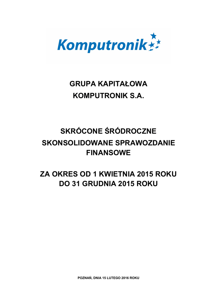 GRUPA KAPITAŁOWA KOMPUTRONIK S.A. SKRÓCONE ŚRÓDROCZNE SKONSOLIDOWANE SPRAWOZDANIE FINANSOWE ZA OKRES OD 1 KWIETNIA 2015 ROKU DO 31 GRUDNIA 2015 ROKU POZNAŃ, DNIA 15 LUTEGO 2016 ROKU SPIS TREŚCI SKONSOLIDOWANY BILANS ................................................................................................................................ 1 SKONSOLIDOWANY RACHUNEK ZYSKÓW I STRAT .......................................................................................... 3 SKONSOLIDOWANE ZESTAWIENIE ZMIAN W KAPITALE WŁASNYM ............................................................... 5 SKONSOLIDOWANY RACHUNEK PRZEPŁYWÓW PIENIĘŻNYCH ..................................................................... 7 DODATKOWE INFORMACJE I OBJAŚNIENIA DO ŚRÓDROCZNEGO SKRÓCONEGO SKONSOLIDOWANEGO SPRAWOZDANIA FINANSOWEGO .............................................................................. 9 1. Informacje ogólne ...................................................................................................................................... 9 2. Podstawa sporządzenia oraz zasady rachunkowości ............................................................................. 10 3. Znaczące zdarzenia i transakcje ............................................................................................................. 15 4. Zysk na akcję .......................................................................................................................................... 25 5. Sezonowość działalności ........................................................................................................................ 25 6. Segmenty operacyjne.............................................................................................................................. 25 7. Konsolidacja ............................................................................................................................................ 27 8. Rzeczowe aktywa trwałe ......................................................................................................................... 30 9. Wartości niematerialne ............................................................................................................................ 31 10. Nieruchomości inwestycyjne ................................................................................................................... 32 11. Wartość godziwa instrumentów finansowych⃰ ⃰ ......................................................................................... 32 12. Odpisy aktualizujące wartość aktywów ................................................................................................... 34 13. Kapitał podstawowy................................................................................................................................. 34 14. Programy płatności akcjami .................................................................................................................... 36 15. Dywidendy............................................................................................................................................... 37 16. Emisja i wykup papierów dłużnych .......................................................................................................... 37 17. Naruszenie postanowień umów (kredyty, pożyczki) ................................................................................ 37 18. Rezerwy .................................................................................................................................................. 38 19. Informacje o istotnych zmianach wielkości szacunkowych, w tym o korektach z tytułu rezerw, rezerwie i aktywach z tytułu odroczonego podatku dochodowego .................................................................................... 38 20. Zobowiązania warunkowe ....................................................................................................................... 38 21. Połączenia jednostek gospodarczych ..................................................................................................... 39 22. Działalność zaniechana........................................................................................................................... 39 23. Transakcje z jednostkami powiązanymi .................................................................................................. 39 24. Zdarzenia po dniu bilansowym ................................................................................................................ 40 25. Inne znaczące zmiany aktywów, zobowiązań, przychodów i kosztów..................................................... 40 26. Inne informacje wymagane przepisami (wybrane dane finansowe przeliczone na euro) ........................ 40 27. Inne informacje, które zdaniem Zarządu Emitenta są istotne dla oceny sytuacji kadrowej, majątkowej, finansowej, wyniku finansowego Komputronik S.A. oraz Grupy Komputronik .................................................. 42 28. Zatwierdzenie do publikacji ..................................................................................................................... 43 SKONSOLIDOWANY BILANS AKTYWA Aktywa trwałe Wartość firmy Wartości niematerialne Rzeczowe aktywa trwałe Nieruchomości inwestycyjne Inwestycje w jednostkach zależnych Inwestycje w jednostkach stowarzyszonych Należności i pożyczki Pochodne instrumenty finansowe Pozostałe długoterminowe aktywa finansowe Inne długoterminowe aktywa finansowe Długoterminowe rozliczenia międzyokresowe Aktywa z tytułu odroczonego podatku dochodowego Aktywa trwałe razem Aktywa obrotowe Zapasy Należności z tytułu umów o usługę budowlaną Należności z tytułu dostaw i usług oraz pozostałe należności Należności z tytułu bieżącego podatku dochodowego Pożyczki Pochodne instrumenty finansowe Pozostałe krót