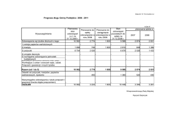 Załącznik Nr 10 do budŜetu na 2006 rok Prognoza długu Gminy Poddębice 2006 - 2011 w tys zł Planowany Stan Planowanie do Planowane do stan zobowiązań spłaty zaciągnięcia zobowiązań pozostałych do zobowiązania w zobowiązania w j.s.t. na spłaty na roku 2006 roku 2006 31.12.2005 r. 31.12.2006 r. 10 562 2 774 1 800 9 588 Wyszczególnienie Zobowiązania wg tytułów dłuŜnych z tego: 1) emisja papierów wartościowych - - 2) kredyty 1 858 748 3) poŜyczki 8 704 2 026 4) przyjęte depozyty 5) wymagalne zobowiązania jednostek budŜetowych pozostałych jednostek sektora finan. publ. Wynikające z ustaw i orzeczeń sądu, udziel. Poręczeń i gwarancji i innych tytułów 1 800 planowana spłata w latach 2007 2008 2 874 - 2 831 - 2 910 848 1 398 6 678 2 026 1 433 - - - - - - - - - - - - - - - - - - Razem (od 1 do 5) Odsetki od poŜyczek, kredytów, papierów wartościowych, dyskonto Niewymagalne zobowiązania z tytułu poręczeń i gwarancji (kwota objęta poręczeniem) OGÓŁEM 10 062 2 774 1 800 450 10 062 3 224 9 088 2 874 2 831 1 360 520 430 1 800 10 448 3 394 3 261 Wiceprzewodniczący Rady Miejskiej Ryszard Olejniczak etu na 2006 rok planowana spłata w latach pozostałych 2009-2011 3 383 164 3 219 3 383 410 3 793