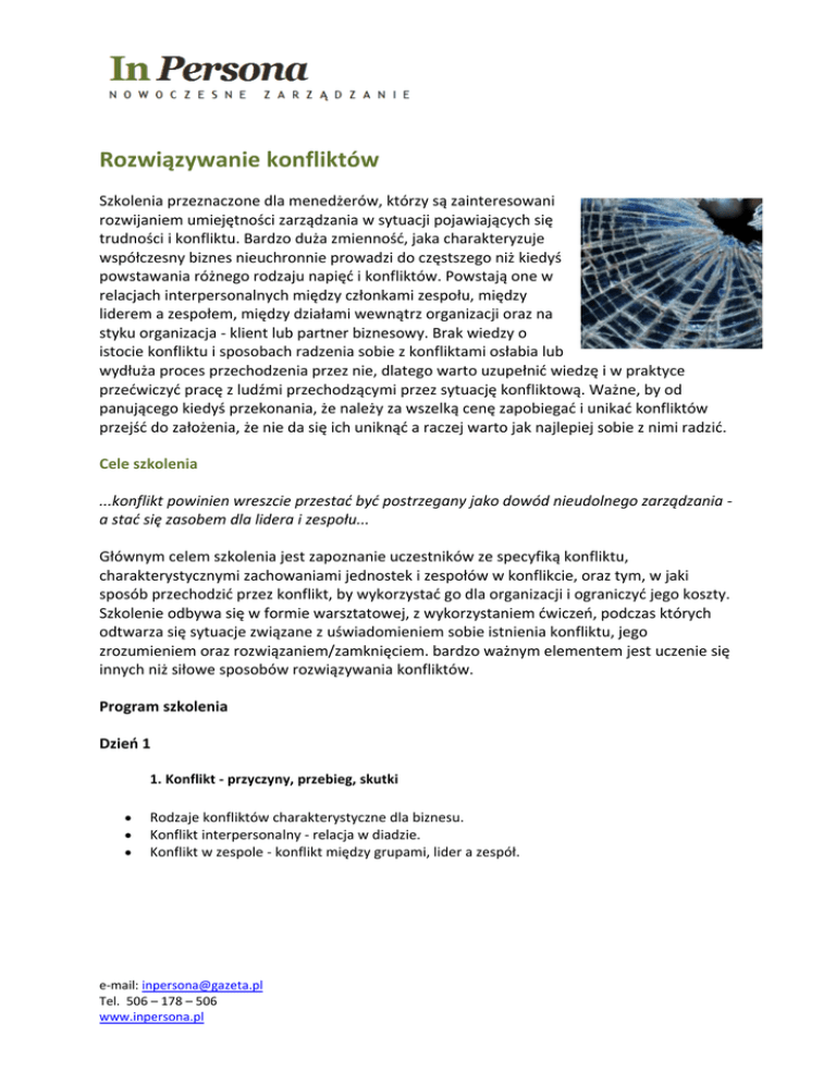 Rozwiązywanie konfliktów Szkolenia przeznaczone dla menedżerów, którzy są zainteresowani rozwijaniem umiejętności zarządzania w sytuacji pojawiających się trudności i konfliktu. Bardzo duża zmienność, jaka charakteryzuje współczesny biznes nieuchronnie prowadzi do częstszego niż kiedyś powstawania różnego rodzaju napięć i konfliktów. Powstają one w relacjach interpersonalnych między członkami zespołu, między liderem a zespołem, między działami wewnątrz organizacji oraz na styku organizacja - klient lub partner biznesowy. Brak wiedzy o istocie konfliktu i sposobach radzenia sobie z konfliktami osłabia lub wydłuża proces przechodzenia przez nie, dlatego warto uzupełnić wiedzę i w praktyce przećwiczyć pracę z ludźmi przechodzącymi przez sytuację konfliktową. Ważne, by od panującego kiedyś przekonania, że należy za wszelką cenę zapobiegać i unikać konfliktów przejść do założenia, że nie da się ich uniknąć a raczej warto jak najlepiej sobie z nimi radzić. Cele szkolenia ...konflikt powinien wreszcie przestać być postrzegany jako dowód nieudolnego zarządzania a stać się zasobem dla lidera i zespołu... Głównym celem szkolenia jest zapoznanie uczestników ze specyfiką konfliktu, charakterystycznymi zachowaniami jednostek i zespołów w konflikcie, oraz tym, w jaki sposób przechodzić przez konflikt, by wykorzystać go dla organizacji i ograniczyć jego koszty. Szkolenie odbywa się w formie warsztatowej, z wykorzystaniem ćwiczeń, podczas których odtwarza się sytuacje związane z uświadomieniem sobie istnienia konfliktu, jego zrozumieniem oraz rozwiązaniem/zamknięciem. bardzo ważnym elementem jest uczenie się innych niż siłowe sposobów rozwiązywania konfliktów. Program szkolenia Dzień 1 1. Konflikt - przyczyny, przebieg, skutki Rodzaje konfliktów charakterystyczne dla biznesu. Konflikt interpersonalny - relacja w diadzie. Konflikt w zespole - konflikt między grupami, lider a zespół. e-mail: [email protected] Tel. 506 – 178 – 506 www.inpersona.pl 2. Psychologia konfliktu Fazy konfliktu - jaka jest dynamika i etapy reagowania na sytuację sporną? Diagnoza źródeł konfliktu - konflikty bywają nieuniknione. Konflikt jako pozytywny czynnik wspierający zmiany. W jakich konfliktach braliśmy udział i jak się one skończyły? - przegląd doświadczeń w radzeniu sobie z konfliktem uczestników. 3. Mamy konflikt - diagnoza konfliktu Po czym poznać, że jesteśmy w konflikcie - wskaźniki i diagnoza konfliktu. Jak rozmawiać o różnicach? - komunikacja w konflikcie. Rola menedżera w konflikcie - jak sobie radzić w trudnej sytuacji zarządczej? Mapa konfliktu - bliski i szeroki plan, identyfikacja czynników tworzących konflikt. Ćwiczenia - komunikacja na temat konfliktu, rozmowy w pracownikami/zespołem w konflikcie. 4. Konflikt - i co dalej? Jakie działania/strategie należy wdrożyć w sytuacji konfliktu? - najczęstsze działania w sytuacji konfliktu (konfrontacja, kompromis, unikanie). Jakie działania mogą niepotrzebnie wyeskalować konflikt - czego nie robić w konflikcie, jeśli nie chcemy go pogłębić? Menedżer i koalicje w konflikcie - jak zachować mądrą neutralność. Mediacja - jeden ze sposobów zarządzenia sytuacją konfliktową. Techniki wspierające radzenie sobie z konfliktem: negocjowanie, techniki komunikacyjne (parafraza, odzwierciedlanie, interpretacja) Ćwiczenia - mediacje między stronami w konflikcie, wystąpienia z prezentowaniem rozwiązań i monitoring działań. Dzień 2 5. Symulacja - konflikt w zespole Wprowadzenie w role - zasady gry, role, przygotowanie do gry. Gra - Konflikt w zespole. Podsumowanie gry - jakie zachowania występowały, ocena działań lidera i przywódców grup pozostających w konflikcie. Podsumowanie symulacji - indywidualny plan działań podnoszących kompetencje w zarządzaniu konfliktem w zespole. 6. Symulacje - konflikt interpersonalny Ćwiczenia - symulacje rozmów z pracownikami będącymi w konflikcie. Ćwiczenia - symulacje rozmów z przełożonym bądź współpracownikiem - ja w konflikcie interpersonalnym. Podsumowanie symulacji - indywidualny plan działań podnoszących kompetencje w zarządzaniu konfliktem interpersonalnym. e-mail: [email protected] Tel. 506 – 178 – 506 www.inpersona.pl 7. Podsumowanie i zakończenie szkolenia Jakie korzyści możemy mieć z dobrego przechodzenia przez konflikty? Czy zespół może nauczyć się efektywnego przechodzenia przez konflikty? Jakie narzędzia feed-forward wprowadzić do zespołu, organizacji? Czas trwania: 2 dni szkoleniowe Liczba uczestników: 8-15 osób Koszt udziału w szkoleniu: 750 PLN + 23% VAT. Cena obejmuje udział w szkoleniu, materiały szkoleniowe i catering. Terminy szkolenia ustalone będą po zebraniu grupy. Prosimy wysłać zgłoszenie przez Formularz Zgłoszenia e-mail: [email protected] Tel. 506 – 178 – 506 www.inpersona.pl