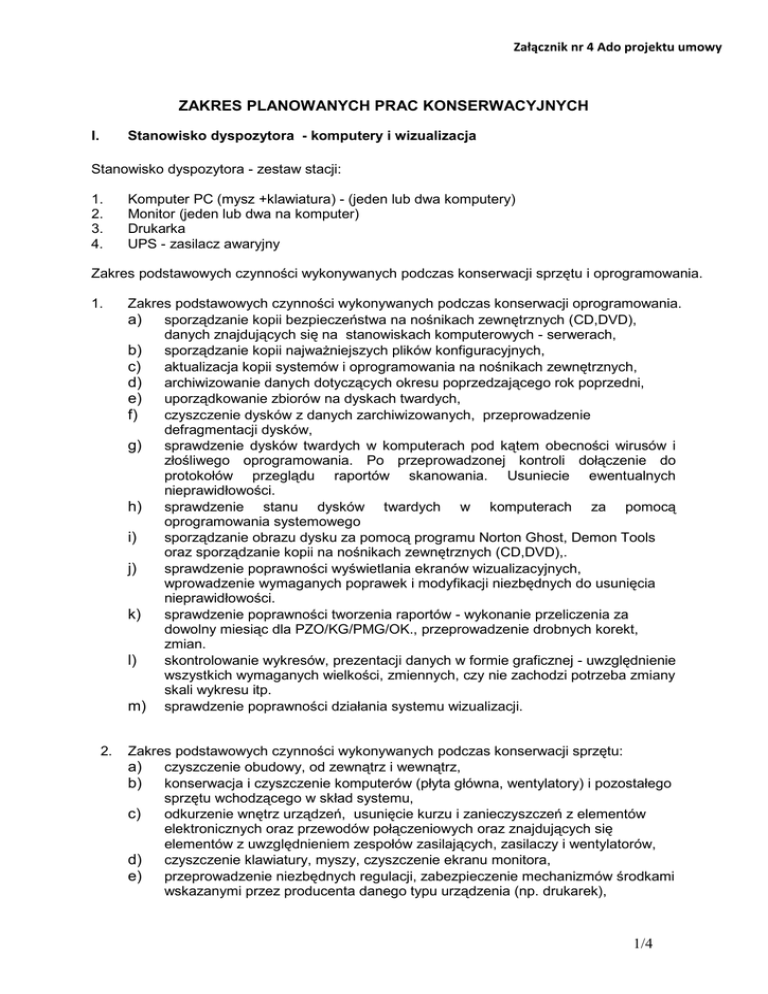 Załącznik nr 4 Ado projektu umowy ZAKRES PLANOWANYCH PRAC KONSERWACYJNYCH I. Stanowisko dyspozytora - komputery i wizualizacja Stanowisko dyspozytora - zestaw stacji: 1. 2. 3. 4. Komputer PC (mysz +klawiatura) - (jeden lub dwa komputery) Monitor (jeden lub dwa na komputer) Drukarka UPS - zasilacz awaryjny Zakres podstawowych czynności wykonywanych podczas konserwacji sprzętu i oprogramowania. 1. 2. Zakres podstawowych czynności wykonywanych podczas konserwacji oprogramowania. a) sporządzanie kopii bezpieczeństwa na nośnikach zewnętrznych (CD,DVD), danych znajdujących się na stanowiskach komputerowych - serwerach, b) sporządzanie kopii najważniejszych plików konfiguracyjnych, c) aktualizacja kopii systemów i oprogramowania na nośnikach zewnętrznych, d) archiwizowanie danych dotyczących okresu poprzedzającego rok poprzedni, e) uporządkowanie zbiorów na dyskach twardych, f) czyszczenie dysków z danych zarchiwizowanych, przeprowadzenie defragmentacji dysków, g) sprawdzenie dysków twardych w komputerach pod kątem obecności wirusów i złośliwego oprogramowania. Po przeprowadzonej kontroli dołączenie do protokołów przeglądu raportów skanowania. Usuniecie ewentualnych nieprawidłowości. h) sprawdzenie stanu dysków twardych w komputerach za pomocą oprogramowania systemowego i) sporządzanie obrazu dysku za pomocą programu Norton Ghost, Demon Tools oraz sporządzanie kopii na nośnikach zewnętrznych (CD,DVD),. j) sprawdzenie poprawności wyświetlania ekranów wizualizacyjnych, wprowadzenie wymaganych poprawek i modyfikacji niezbędnych do usunięcia nieprawidłowości. k) sprawdzenie poprawności tworzenia raportów - wykonanie przeliczenia za dowolny miesiąc dla PZO/KG/PMG/OK., przeprowadzenie drobnych korekt, zmian. l) skontrolowanie wykresów, prezentacji danych w formie graficznej - uwzględnienie wszystkich wymaganych wielkości, zmiennych, czy nie zachodzi potrzeba zmiany skali wykresu itp. m) sprawdzenie poprawności działania systemu wizualizacji. Zakres podstawowych czynności wykonywanych podczas konserwacji sprzętu: czyszczenie obudowy, od zewnątrz i wewnątrz, konserwacja i czyszczenie komputerów (płyta główna, wentylatory) i pozostałego sprzętu wchodzącego w skład systemu, c) odkurzenie wnętrz urządzeń, usunięcie kurzu i zanieczyszczeń z elementów elektronicznych oraz przewodów połączeniowych oraz znajdujących się elementów z uwzględnieniem zespołów zasilających, zasilaczy i wentylatorów, d) czyszczenie klawiatury, myszy, czyszczenie ekranu monitora, e) przeprowadzenie niezbędnych regulacji, zabezpieczenie mechanizmów środkami wskazanymi przez producenta danego typu urządzenia (np. drukarek), a) b) 1/4 Załącznik nr 4 Ado projektu umowy f) g) h) 3. 4. 5. kontrola elementów zestawu i w miarę potrzeb – czyszczenie połączeń w konserwowanym urządzeniu: – sprawdzenie skuteczności chłodzenia podzespołów - pracy wentylatorów – wymiana niesprawnych, – czyszczenie napędów (CD/DVD, HDD), – testowanie podstawowych podzespołów po konserwacji. sprawdzenie poprawnej pracy awaryjnych zasilaczy napięcia UPS, przeprowadzenie przeglądu urządzenia, w razie konieczności wymiana baterii, kalibracja po wymianie baterii, testowanie po konserwacji, wykonanie testów zasilacza awaryjnego UPS-u chroniącego system. W razie zużycia wymiana baterii, kalibracja zasilacza. Opracowanie wyników pomiarów i sporządzenie protokołów - dokumentacji z przeprowadzenia prac konserwacyjnych i przekazanie jej Kierownikowi obiektu. Przekazanie kopii zapasowych systemu i projektu wizualizacji kopalni, na której wykonywany był przegląd Kierownikowi obiektu oraz do Działu Elektrycznego i Automatyki. Dokumentacja z przeprowadzenia prac konserwacyjnych (bez formy papierowej) w formie elektronicznej (PDF) wykonanej w formie umożliwiającej wyszukiwanie tekstu wraz duplikatem haseł winna być dostarczona również do Działu Elektrycznego i Automatyki PGNiG SA w W-wie Oddział w Sanoku. Szczegółowy wykaz urządzeń AKPiA na obiektach zawiera załącznik nr 2. II. System sterowania i zasilanie – sterowniki, szafy sterownicze, tablice synoptyczne, UPS-y. – Zakres prac wykonywanych w ramach przeglądów okresowych Przeglądy konserwacyjne wykonywane będą zgodnie z harmonogramem i obejmują wszystkie lokalizacje systemu. Do zakresu prac należy: 1. Wykonanie kopii zapasowych całego systemu (układu sterowania) i danych archiwalnych. Sprawdzenie poprawności kopii bezpieczeństwa. 2. Sprawdzenie sprzętu i oprogramowania sterownika i wizualizacji pod względem sprawności i warunków eksploatacji. Usunięcie ewentualnych problemów. 3. Sprawdzenie poprawności pracy sterownika: 3.1. archiwizacja całości oprogramowania przed przystąpieniem do prac 3.2. konserwacja elementów, złącz i zacisków, 3.3. czyszczenie filtra powietrza, odkurzenie modułów i przemycie ich obudów, 3.4. sprawdzenie stanu baterii podtrzymującej pamięć, wymiana w przypadku baterii używanych ponad 2 lata, 3.5. sprawdzenie kart wejściowych i wyjściowych analogowych i cyfrowych, 3.6. sprawdzenie pomiarów wchodzących do systemu, 3.7. sprawdzenie urządzeń transmisji danych, 3.8. sprawdzanie poprawności transmisji danych, 3.9. sprawdzenie zużycia energii poszczególnych elementów systemu. 4. Optymalizacja systemów w zakresie funkcjonalności - wykonanie drobnych modyfikacji systemu na życzenie Zleceniodawcy. 5. Wykonanie testów zasilacza awaryjnego UPS-u chroniącego system. W razie zużycia wymiana baterii, kalibracja zasilacza. 6. Sprawdzenie zabezpieczeń, wyłączników różnicowo-prądowych. 7. Sprawdzenie stanu połączeń obwodów pomiarowych, sterowniczych, sygnalizacyjnych: 2/4 Załącznik nr 4 Ado projektu umowy 8. 9. 10. 11. 12. 13. 14. 15. 16. 17. 18. 19. 20. 21. 7.1. docisku zacisków w listwach łączeniowych i aparatach, 7.2. konserwacja styków w przełącznikach sterowniczych. 7.3. sprawdzenie kabli połączenio