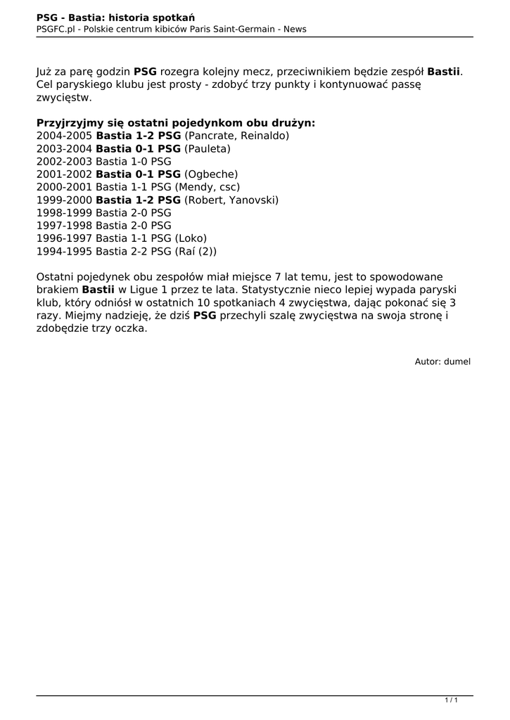 PSG - Bastia: historia spotkań PSGFC.pl - Polskie centrum kibiców Paris Saint-Germain - News Już za parę godzin PSG rozegra kolejny mecz, przeciwnikiem będzie zespół Bastii. Cel paryskiego klubu jest prosty - zdobyć trzy punkty i kontynuować passę zwycięstw. Przyjrzyjmy się ostatni pojedynkom obu drużyn: 2004-2005 Bastia 1-2 PSG (Pancrate, Reinaldo) 2003-2004 Bastia 0-1 PSG (Pauleta) 2002-2003 Bastia 1-0 PSG 2001-2002 Bastia 0-1 PSG (Ogbeche) 2000-2001 Bastia 1-1 PSG (Mendy, csc) 1999-2000 Bastia 1-2 PSG (Robert, Yanovski) 1998-1999 Bastia 2-0 PSG 1997-1998 Bastia 2-0 PSG 1996-1997 Bastia 1-1 PSG (Loko) 1994-1995 Bastia 2-2 PSG (Raí (2)) Ostatni pojedynek obu zespołów miał miejsce 7 lat temu, jest to spowodowane brakiem Bastii w Ligue 1 przez te lata. Statystycznie nieco lepiej wypada paryski klub, który odniósł w ostatnich 10 spotkaniach 4 zwycięstwa, dając pokonać się 3 razy. Miejmy nadzieję, że dziś PSG przechyli szalę zwycięstwa na swoja stronę i zdobędzie trzy oczka. Autor: dumel 1/1 Powered by TCPDF (www.tcpdf.org)