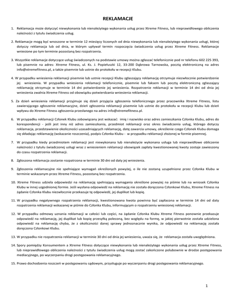 REKLAMACJE 1. Reklamacja może dotyczyć niewykonania lub nienależytego wykonania usług przez Xtreme Fitness, lub nieprawidłowego obliczenia należności z tytułu świadczenia usług. 2. Reklamacje mogą być wnoszone w terminie 12 miesięcy liczonych od dnia niewykonania lub nienależytego wykonania usługi, której dotyczy reklamacja lub od dnia, w którym upływał termin rozpoczęcia świadczenia usług przez Xtreme Fitness. Reklamacje wniesione po tym terminie pozostaną bez rozpatrzenia. 3. Wszystkie reklamacje dotyczące usług świadczonych na podstawie umowy można zgłaszać telefonicznie pod nr telefonu 602 225 393, lub pisemnie na adres: Xtreme Fitness, ul. Ks. J. Popiełuszki 12, 33-200 Dąbrowa Tarnowska, pocztą elektroniczną na adres [email protected], a także pisemnie lub ustnie do protokołu w recepcji Klubu. 4. W przypadku wniesienia reklamacji pisemnie lub ustnie recepcji Klubu zgłaszający reklamację otrzymuje niezwłocznie potwierdzenie jej wniesienia. W przypadku wniesienia reklamacji telefonicznie, pisemnie lub faksem lub pocztą elektroniczną zgłaszający reklamację otrzymuje w terminie 14 dni potwierdzenie jej wniesienia. Rozpatrzenie reklamacji w terminie 14 dni od dnia jej wniesienia zwalnia Xtreme Fitness od obowiązku potwierdzania wniesienia reklamacji. 5. Za dzień wniesienia reklamacji przyjmuje się dzień przyjęcia zgłoszenia telefonicznego przez pracownika Xtreme Fitness, listu zawierającego zgłoszenie reklamacyjne, dzień zgłoszenia reklamacji pisemnie lub ustnie do protokołu w recepcji Klubu lub dzień wpływu do Xtreme Fitness zgłoszenia przesłanego na adres [email protected]. 6. W przypadku reklamacji Członek Klubu zobowiązany jest wskazać: imię i nazwisko oraz adres zamieszkania Członka Klubu, adres do korespondencji - jeśli jest inny niż adres zamieszkania, przedmiot reklamacji oraz okres świadczenia usług, którego dotyczy reklamacja, przedstawienie okoliczności uzasadniających reklamację, datę zawarcia umowy, określenie czego Członek Klubu domaga się składając reklamację (wskazanie roszczenia), podpis Członka Klubu - w przypadku reklamacji złożonej w formie pisemnej. 7. W przypadku kiedy przedmiotem reklamacji jest niewykonana lub nienależycie wykonana usługa lub nieprawidłowe obliczenie należności z tytułu świadczonej usługi wraz z wniesieniem reklamacji obowiązek zapłaty kwestionowanej kwoty zostaje zawieszony do czasu rozpatrzenia reklamacji. 8. Zgłoszona reklamacja zostanie rozpatrzona w terminie 30 dni od daty jej wniesienia. 9. Zgłoszenia reklamacyjne nie spełniające wymagań określonych powyżej, o ile nie zostaną uzupełnione przez Członka Klubu w terminie wskazanym przez Xtreme Fitness, pozostaną bez rozpatrzenia. 10. Xtreme Fitness udziela odpowiedzi na reklamację spełniającą wymagania określone powyżej na piśmie lub na wniosek Członka Klubu w innej uzgodnionej formie. Jeśli wysłana odpowiedź na reklamację nie została doręczona Członkowi Klubu, Xtreme Fitness na żądanie Członka Klubu niezwłocznie przekazuje tę odpowiedź, jej duplikat lub kopię. 11. W przypadku negatywnego rozpatrzenia reklamacji, kwestionowana kwota powinna być zapłacona w terminie 14 dni od daty rozpatrzenia reklamacji wskazanej w piśmie do Członka Klubu, informującym o rozpatrzeniu wniesionej reklamacji. 12. W przypadku odmowy uznania reklamacji w całości lub części, na żądanie Członka Klubu Xtreme Fitness ponownie przekazuje odpowiedź na reklamację, jej duplikat lub kopię przesyłką poleconą, bez względu na formę, w jakiej pierwotnie została udzielona odpowiedź na reklamację chyba, że z okoliczności danej sprawy jednoznacznie wynika, że odpowiedź na reklamację została doręczona Członkowi Klubu. 13. W przypadku nie rozpatrzenia reklamacji w terminie 30 dni od dnia jej wniesienia, uważa się, że reklamacja została uwzględniona. 14. Spory pomiędzy Konsumentem a Xtreme Fitness dotyczące niewykonania lub nienależytego wykonania usług przez Xtreme Fitness, lub nieprawidłowego obliczenia należności z tytułu świadczenia usług mogą zostać zakończone polubownie w drodze postępowania mediacyjnego, po wyczerpaniu drogi postępowania reklamacyjnego. 15. Prawo dochodzenia roszczeń w postępowaniu sądowym, przysługuje po wyczerpaniu drogi postępowania reklamacyjnego. 1