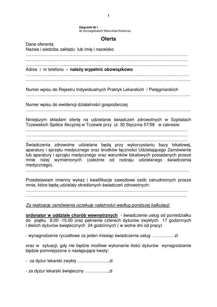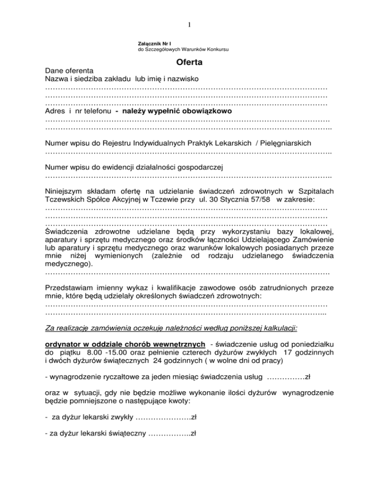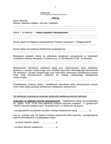 1 Załącznik Nr I do Szczegółowych Warunków Konkursu Oferta Dane oferenta Nazwa i siedziba zakładu lub imię i nazwisko ………………………………………………………………………………………………… ………………………………………………………………………………………………… ………………………………………………………………………………………………… Adres i nr telefonu - naleŜy wypełnić obowiązkowo …………………………………………………………………………………………………. ………………………………………………………………………………………………….. Numer wpisu do Rejestru Indywidualnych Praktyk Lekarskich / Pielęgniarskich ………………………………………………………………………………………………….. Numer wpisu do ewidencji działalności gospodarczej ………………………………………………………………………………………………….. Niniejszym składam ofertę na udzielanie świadczeń zdrowotnych w Szpitalach Tczewskich Spółce Akcyjnej w Tczewie przy ul. 30 Stycznia 57/58 w zakresie: ………………………………………………………………………………………………… ………………………………………………………………………………………………… ………………………………………………………………………………………………… Świadczenia zdrowotne udzielane będą przy wykorzystaniu bazy lokalowej, aparatury i sprzętu medycznego oraz środków łączności Udzielającego Zamówienie lub aparatury i sprzętu medycznego oraz warunków lokalowych posiadanych przeze mnie niŜej wymienionych (zaleŜnie od rodzaju udzielanego świadczenia medycznego). …………………………………………………………………………………………………. Przedstawiam imienny wykaz i kwalifikacje zawodowe osób zatrudnionych przeze mnie, które będą udzielały określonych świadczeń zdrowotnych: ………………………………………………………………………………………………… ………………………………………………………………………………………………... Za realizację zamówienia oczekuję naleŜności według poniŜszej kalkulacji: ordynator w oddziale chorób wewnętrznych - świadczenie usług od poniedziałku do piątku 8.00 -15.00 oraz pełnienie czterech dyŜurów zwykłych 17 godzinnych i dwóch dyŜurów świątecznych 24 godzinnych ( w wolne dni od pracy) - wynagrodzenie ryczałtowe za jeden miesiąc świadczenia usług ……………zł oraz w sytuacji, gdy nie będzie moŜliwe wykonanie ilości dyŜurów wynagrodzenie będzie pomniejszone o następujące kwoty: - za dyŜur lekarski zwykły ………………….zł - za dyŜur lekarski świąteczny ……………..zł 2 oraz w sytuacji, gdy niezbędne będzie pełnienie dyŜurów w większej liczbie niŜ wyŜej - za dyŜur lekarski zwykły ………………….zł - za dyŜur lekarski świąteczny ……………..zł lekarz w oddziale chorób wewnętrznych – świadczenie usług od poniedziałku do piątku 8.00-15.00 oraz pełnienie czterech dyŜurów zwykłych 17 godzinnych i dwóch dyŜurów świątecznych 24 godzinnych ( w wolne dni od pracy) , wykonanie 85 badań echa serca oraz zastępowanie ordynatora w czasie jego nieobecności - wynagrodzenie ryczałtowe za jeden miesiąc świadczenia usług …………..zł oraz w sytuacji, gdy nie będzie moŜliwe wykonanie ilości dyŜurów i badań echa serca wynagrodzenie będzie pomniejszone o następujące kwoty: - za dyŜur lekarski zwykły ………….. zł - za dyŜur lekarski świąteczny ……………zł - za badanie - echo serca ....…………zł oraz w sytuacji, gdy niezbędne będzie pełnienie dyŜurów i wykonanie badań echa serca w większej liczbie niŜ wyŜej wykazano: - za dyŜur lekarski zwykły ………….. zł - za dyŜur lekarski świąteczny ……………zł - za badanie - echo serca ....…………zł lekarz w oddziale chorób wewnętrznych, wykonywanie zadań zastępcy ordynatora oddziału w sali intensywnego nadzoru kardiologicznego od poniedziałku do piątku 8.00 -15.00 oraz pełnienie dyŜurów lekarskich - dyŜury w soboty, niedziele, święta od godz. 8.00 do godz. 8.00 oraz dyŜurów w dni robocze od godz.15.00 do godz.8.00 - wynagrodzenie ryczałtowe za jeden miesiąc świadczenia usług ……………. zł oraz stawka za 1 godzinę dyŜuru lekarskiego ………….. zł lekarz specjalista w zakresie chorób wewnętrznych w oddziale chorób wewnętrznych - świadczenie usług od poniedziałku do piątku 8.00-15.00 oraz pełnienie dyŜurów lekarskich - dyŜury w soboty, niedziele, święta od godz. 8.00 do godz. 8.00 oraz dyŜurów w dni robocze od godz.15.00 do godz.8.00 - wynagrodzenie ryczałtowe za jeden miesiąc świadczenia usług …………..- zł oraz za 1 godzinę dyŜuru lekarskiego ……………. zł 3 lub - wynagrodzenie za 1godzinę świadczenia usług od poniedziałku 8.00-15.00 …………………..zł oraz za 1 godzinę dyŜuru lekarskiego …………..zł do piątku lekarz w trakcie specjalizacji w zakresie chorób wewnętrznych w oddziale chorób wewnętrznych - świadczenie usług od poniedziałku do piątku 8.00-15.00 - stawka za 1 godzinę świadczenia usług ………….. zł lekarza specjalista w zakresie chorób wewnętrznych w oddziale chorób wewnętrznych - pełnienie dyŜurów lekarskich - dyŜury w soboty, niedziele, święta od godz. 8.00 do godz. 8.00 oraz dyŜurów w dni robocze od godz.15.00 do godz.8.00 - stawka za 1 godzinę świadczenia usług ………………..zł lekarz w nocnej i świątecznej opiece chorych lekarz specjalista lub lekarz posiadający I stopień specjalizacji 