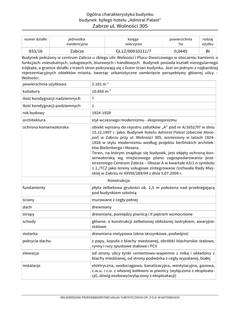 Ogólna charakterystyka budynku budynek byłego hotelu „Admiral Palast” Zabrze ul. Wolności 305 numer działki jednostka ewidencyjna księga wieczysta powierzchnia ha rodzaj użytku 833/16 Zabrze GL1Z/00010111/7 0,0445 Bi Budynek położony w centrum Zabrza u zbiegu ulic Wolności i Placu Dworcowego w otoczeniu kamienic o funkcjach: mieszkalnych, usługowych, biurowych i handlowych. Budynek posiada kształt nieregularnego trójkąta, a granice działki z trzech stron pokrywają się z licem ścian budynku. Jest on jednym z najbardziej reprezentacyjnych obiektów miasta, tworząc urbanistyczne zamknięcie perspektywy głównej ulicy – Wolności. powierzchnia użytkowa 2.101 m 2 kubatura 10.850 m 3 ilość kondygnacji nadziemnych 7 ilość kondygnacji podziemnych 1 rok budowy 1924-1928 architektura styl wczesnego modernizmu - ekspresjonizmu ochrona konserwatorska obiekt wpisany do rejestru zabytków „A” pod nr A/1652/97 w dniu 15.12.1997 r. jako: Budynek hotelu Admiral Palast (obecnie Monopol) w Zabrzu przy ul. Wolności 305, wzniesiony w latach 19241928 w stylu modernizmu według projektu berlińskich architektów Bielenberga i Mosera. Teren, na którym znajduje się budynek, jest objęty ochroną konserwatorską wg miejscowego planu zagospodarowania przestrzennego Centrum Zabrza – Obszar A w kwartale A3/1 o symbolu 1.1./TCZ jako tereny usługowe zintegrowane (Uchwała Rady Miejskiej w Zabrzu nr XXVIII/289/04 z dnia 5.07.2004 r. Konstrukcja fundamenty płyta żelbetowa grubości ok. 2,5 m położona nad przebiegającą pod budynkiem sztolnią ściany murowane z cegły pełnej dach drewniany stropy drewniane, pomiędzy piwnicą i II piętrem wzmocnione schody główne: o konstrukcji żelbetowej obłożonej lastrykiem, awaryjne: stalowe stolarka drewniana nietypowa (okna skrzynkowe, podwójne) pokrycie dachu z papy, kopuła z blachy miedzianej, obróbki blacharskie stalowe, rynny i rury spustowe stalowe i PCV elewacja od strony ulicy tynki cementowo-wapienne z miką i okładziny z blachy miedzianej, od strony podwórka z cegły wypalanej, białej instalacje elektryczna, wodociągowa, kanalizacyjna, wentylacyjna, gazowa, c.w.u. i c.o. z własnej kotłowni w piwnicy (wyłączona z eksploatacji), dźwig osobowy(wyłączony z eksploatacji) WOJEWÓDZKIE PRZEDSIĘBIORSTWO USŁUG TURYSTYCZNYCH SP. Z O.O. W KATOWICACH