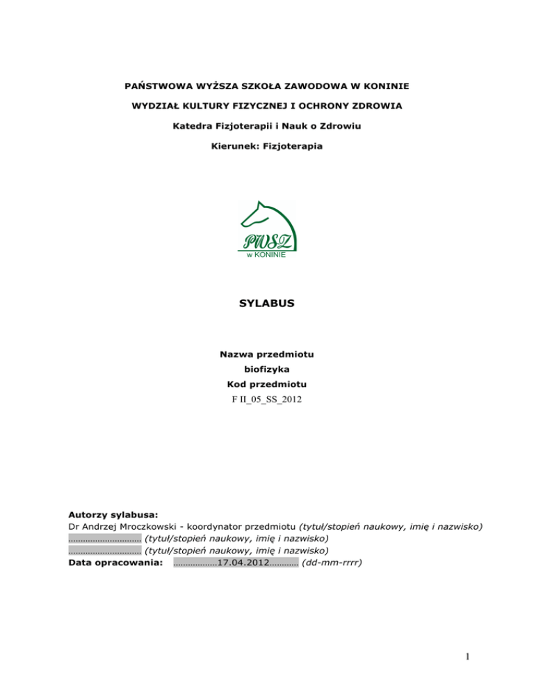PAŃSTWOWA WYŻSZA SZKOŁA ZAWODOWA W KONINIE WYDZIAŁ KULTURY FIZYCZNEJ I OCHRONY ZDROWIA Katedra Fizjoterapii i Nauk o Zdrowiu Kierunek: Fizjoterapia SYLABUS Nazwa przedmiotu biofizyka Kod przedmiotu F II_05_SS_2012 Autorzy sylabusa: Dr Andrzej Mroczkowski - koordynator przedmiotu (tytuł/stopień naukowy, imię i nazwisko) ………………………… (tytuł/stopień naukowy, imię i nazwisko) ………………………… (tytuł/stopień naukowy, imię i nazwisko) Data opracowania: ………………17.04.2012………… (dd-mm-rrrr) 1 1. Podstawowe informacje Poziom kształcenia Profil kształcenia studia pierwszego stopnia praktyczny Forma studiów stacjonarne Rok studiów I Semestr II Moduł kształcenia Forma zajęć (ogólny/podstawowy/kierunkowy/specjalnościowy) (wykłady/ćwiczenia) Wymiar godzinowy 15/15 Liczba punktów ECTS 2 Język wykładowy polski Forma zaliczenia zaliczenie z oceną Rok akademicki 2012/2013 2. Cele kształcenia C01 C02 Opanowanie wiedzy na temat zjawisk fizycznych zachodzących w organizmie człowieka pod wpływem zewnętrznych czynników fizycznych ł Opanowanie wiedzy na temat podstawowych właściwości fizycznych tkanek 3. Wymagania wstępne Student, który rozpoczyna zajęcia z przedmiotu: • • Wykazuje się podstawowymi wiadomościami z zakresu fizyki ze szkoły średniej 4. Efekty kształcenia Objaśnienie oznaczeń: P – przedmiotowe efekty kształcenia W – kategoria wiedzy U – kategoria umiejętności K (po podkreślniku) – kategoria kompetencji społecznych K (przed podkreślnikiem) – kierunkowe efekty kształcenia K_…… – efekty kształcenia dla kierunku studiów ……………….. …… – efekty kształcenia w obszarze kształcenia w zakresie nauk ……………….. dla studiów pierwszego stopnia 01, 02, 03 i kolejne – numer efektu kształcenia Tabela odniesień przedmiotowych efektów kształcenia do efektów kierunkowych i obszarowych Symbol Efekty kształcenia dla przedmiotu …biofizyka Student, który zaliczył przedmiot: Odniesienie do efektów kształcenia dla kierunku studiów fizjoterapia Odniesienie do efektów kształcenia w obszarze kształcenia w zakresie nauk nauk medycznych, nauk o zdrowiu oraz nauk o kulturze fizycznej 2 P_W01 Zna właściwości fizyczne podstawowych tkanek K_W07 M1_W01, M1_W02 P_W02 Zna zjawiska fizycznych zachodzących w organizmie człowieka pod wpływem zewnętrznych czynników fizycznych prawidłowo interpretuje pod względem fizycznym zjawiska w organizmie zachodzące pod wpływem siły zewnętrzne K_W01 M1_W01, M1_W02 K_W01 M1_W01, M1_W02 P_W04 umie interpretować zjawiska zachodzące w tkankach pod względem praw fizycznych K_W07 M1_W01, M1_W02 P_K01 Uznaje konieczność zastosowania wiedzy z biofizyki człowieka w zawodzie fizjoterapeuty K_K0 l M1_K01 P_W03 5. Treści kształcenia WYKŁADY WYK01 Biofizyka jako nauka, jej cele i zadania oraz związek z innymi dziedzinami naukowymi liczba godzin 1 WYK02 Równowaga sił w układzie mięśniowo-szkieletowym człowieka w warunkach statyki. 1 WYK03 Zasady mechaniki opisujące ruch mechaniczny człowieka 1 WYK06 Zjawiska rozciągania i ściskania tkanek, naprężenia odkształcenia, prawo Hooke’a. Zjawiska skręcania i zginania, złamania kości. Dostosowanie biernego układu ruchu do przenoszenia obciążeń mechanicznych Podstawy mechaniki płynów-biofizyka układu krążenia. 1 WYK07 Wpływ czynników mechanicznych na organizm człowieka (fale dźwiękowe, przyspieszenia, ciśnienie, drgania). 2 WYK04 WYK05 WYK08 WYK09 WYK10 WYK11 WYK12 WYK13 WYK14 ĆW01 Oddziaływanie prądu elektrycznego i pól elektromagnetycznych na organizm człowieka Fale elektromagnetyczne. Zasada działania lasera i charakterystyka promieniowania laserowego. Elementy teorii informacji i sterowania. Podstawy cybernetyki – regulacja procesów fizjologicznych. Biofizyka procesu widzenia. Biofizyka procesu słyszenia. Podstawy biotermodynamiki. Podstawy bioenergetyki i termokinetyki 1 1 1 1 1 1 1 1 1 ogółem 15 ĆWICZENIA liczba godzin Metody badawcze biofizyki. Analiza błędów, rachunek przybliżony. 1 3 ĆW02 ĆW03 Równowaga układu mięśniowo – szkieletowego w warunkach statyki. Równowaga płaskiego układu sił. Zasady mechaniki - przykłady, zadania . 1 1 ĆW04 Obliczanie naprężeń w kościach rozciąganych, ściskanych, zginanych skręcanych ĆW05 zadania. 1 ĆW06 Kinematyka, kinetyka, mechanika płynów – Obliczanie oporów aeroi hydrodynamicznych oraz parametrów przepływu. przykłady, zadania. 1 ĆW07 Termodynamika, zmiany stanu skupienia. Przemiany gazowe. Termoregulacja w organizmie człowieka. 2 1 Wpływ czynników mechanicznych na organizm człowieka - przykłady, ĆW08 Obliczanie natężenia i potencjału pola elektrostatycznego. Pomiar oporności ciała człowieka. 1 ĆW09 Rozwiązywanie obwodów prądu stałego. Obliczanie pracy i mocy prądu elektrycznego 2 ĆW10 Obliczanie dawek promieniowania laserowego. Audiometria. 2 ĆW11 ĆW12 Energetyka wysiłku fizycznego, praca, moc, sprawność. 1 Demonstracja zjawisk optyki geometrycznej ogółem 15 LABORATORIA liczba godzin 6. Metody kształcenia MK01 Prezentacje multimedialne MK02 Metoda problemowa 7. Metody oceny (ocena formująca, ocena podsumowująca) OF01 Aktywny udział w zajęciach OP01 Kolokwia z poszczególnych partii materiału 8. Obciążenie pracą studenta liczba godzin Godziny kontaktowe z nauczycielem 15 Praca indywidualna studenta, w tym: • Korzystanie z czytelni biblioteki uczelni 15 • Udział w wykładach 10 • Przygotowanie do ćwiczeń i kolokwiów 10 • ………………………………………………..…………. ……… Łączne obciążenie pracą studenta 50 9. Liczba punktów ECTS Liczba punktów ECTS, którą student uzyskuje za: • udział w zajęciach wymagających bezpośredniego udziału nauczycieli i studentów 4 • (godziny kontaktowe z nauczycielem) 2 pracę indywidualną 1 Sumaryczna liczba punktów ECTS dla przedmiotu 