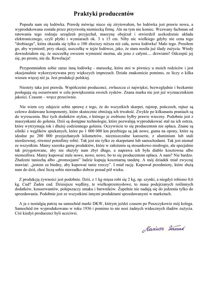 Praktyki producentów Popsuła nam się lodówka. Prawdę mówiąc nieco się zirytowałem, bo lodówka jest prawie nowa, a wyprodukowana została przez przyzwoitą niemiecką firmę. Ale na tym nie koniec. Wezwany fachman od ratowania tego rodzaju urządzeń przyjechał, maszynę obejrzał i stwierdził uszkodzenie układu elektronicznego, czyli płytki i wymiarach ok. 3 x 15 cm. Niby nic wielkiego gdyby nie cena tego "drobiazgu", która okazała się tylko o 100 złociszy niższa niż cała, nowa lodówka! Mało tego. Prosiłem go, aby wymienił, przy okazji, uszczelkę w tejże lodówce, jako, że stara nosiła już ślady zużycia. Wtedy dowiedziałem się, że uszczelkę owszem wymienić można, ale jeno z całymi.... drzwiami! Odczepić jej się, po prostu, nie da. Rewelacja! Przypomniałem sobie zaraz inną lodówkę - staruszkę, która stoi w piwnicy u moich rodziców i jest okazjonalnie wykorzystywana przy większych imprezach. Działa znakomicie pomimo, ze liczy o kilka wiosen więcej niż ja. Jest produkcji polskiej. Niestety taka jest prawda. Współcześni producenci, zwłaszcza ci najwięksi, bezwzględnie i bezkarnie posługują się oszustwami w celu powiększenia swoich zysków. Znana marka nie jest już wyznacznikiem jakości. Czasem – wręcz przeciwnie. Nie wiem czy zdajecie sobie sprawę z tego, że do wszystkich skarpet, rajstop, pończoch, rajtuz są celowo dodawane komponenty, które skutecznie obniżają ich trwałość. Zwykle po kilkunastu praniach są do wyrzucenia. Bez tych dodatków stylon, z którego je zrobiono byłby prawie wieczny. Podobnie jest z maszynkami do golenia. Dziś są dostępne technologie, które pozwalają wyprodukować stal na ich ostrza, które wytrzymają rok i dłużej codziennego golenia. Oczywiście to się producentom nie opłaca. Znane są silniki z węglików spiekanych, które po 1 000 000 km przebiegu są jak nowe, guma na opony, które są idealne po 200 000 przejechanych kilometrów, niezniszczalne karoserie, z aluminium lub stali nierdzewnej, również potrafimy robić. Tak jest nie tylko ze skarpetami lub samochodami. Tak jest niemal ze wszystkim. Mamy szeroka gamę produktów, które w założeniu są stosunkowo niedrogie, ale specjalnie tak przygotowane, aby nie służyły nam zbyt długo, a naprawa ich była diablo kosztowna albo niemożliwa. Mamy kupować stale nowe, nowe, nowe, bo to się producentom opłaca. A nam? Nie bardzo. Złudzeni taniochą albo „promocjami” ludzie kupują koszmarną tandetę. A mój dziadek miał zwyczaj mawiać: „jestem za biedny, aby kupować tanie rzeczy”. I miał rację. Kupował przedmioty, które służą nam do dziś, choć liczą sobie nierzadko dobrze ponad pół wieku. Z produkcją żywności jest podobnie. Dziś, z 1 kg mięsa robi się 2 kg, np. szynki, a niegdyś robiono 0,6 kg. Cud? Żaden cud. Dzisiejsze wędliny, te wielkoprzemysłowe, to masa podejrzanych roślinnych dodatków, konserwantów, polepszaczy smaku i barwników. Zupełnie nie nadają się do jedzenia tylko do sprzedawania. Podobnie jest ze wszystkimi innymi produktami sprzedawanymi w marketach. A ja z nostalgią patrzę na samochód marki DKW, którym jeździ czasem po Puszczykowie mój kolega. Samochód ów wyprodukowano w roku 1936 i pomimo to nie nosi żadnych widocznych śladów zużycia. Cóż kiedyś producenci byli uczciwsi.