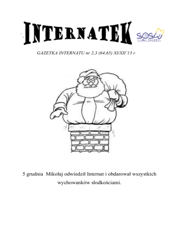 GAZETKA INTERNATU nr 2,3 (64,65) XI/XII’13 r 5 grudnia Mikołaj odwiedził Internat i obdarował wszystkich wychowanków słodkościami. Co się wydarzyło w listopadzie i w grudniu ? 21.11. Dzień Życzliwości- życzliwe cytaty zagościły na korytarzach już kilka dni wcześniej. Umilały nam życie a także zwracały uwagę na to, jak miło można spędzić czas oraz w jaki sposób można być życzliwym. Tego dnia wybrano Królową i Króla Życzliwości. Życzliwymi zostali: Ala Kolaska i Rafał Saltarius. Bądź życzliwy na drodze- to akcja prowadzona z okazji Dnia Życzliwości wspólnie z lubliniecką policją już od kilku lat. Ma na celu zwrócenie uwagę na bezpieczeństwo pieszych zwłaszcza dzieci. Akcja była serdecznie przyjęta przez wszystkich zatrzymanych kierowców, nawet tych, którzy za swoje przewinienie musieli zjeść plaster cytryny 27.11.w tym dniu w sali konferencyjnej odbył się wieczór andrzejkowych wróżb w dwóch częściach: dla grup młodszych i grup starszych. Wieczór był wypełniony wróżbami i zabawami związanymi z tym, co nas czeka w przyszłości. Każdy częstując się ciastem, mógł trafić na ciekawą przepowiednię dotyczącą swojego przyszłego życia . Wieczór zakończył się dyskoteką dla wszystkich lubiących się pobawić. Lwicami parkietu okazały się Marta Ż. i Agata Ż., które bawiły się bez przerwy od początku do końca. Brawo za wytrzymałość! Zbliżają się Święta, w związku z tym Redaktorki zadały wychowawcom po dwa pytania: „ Co Pani/ Pan myśli o świętach?”( odp w gwiazdkach) To najlepszy czas w roku… To czas świętego spokoju… To czas rozmyślań, zgody, miłości i spotkań z Rodziną Święta… trwają zbyt krótko… „ Z czym kojarzą się Pani/Panu święta Bożego Narodzenia?” Ze spokojem, zapachem choinki i miłą, rodzinną atmosferą Z tajemnicą, magią i dobrocią… Z zapachem pierników i pomarańczy… Chwila świątecznej rozrywki ( rozwiąż labirynty) Z ostatniej chwili! Wiadomość od Samorządu dla grup starszych !!!! W związku z tym, że chłopcy śpią w internacie dziewcząt apelujemy o spokojne i kulturalne spędzanie czasu wolnego zwłaszcza w godzinach wieczornych. Spotykamy się tylko w świetlicach !!!! życzy Internatek Redakcja Ewelina Łasek Monika Prandzioch Opiekun Monika Zaręba
