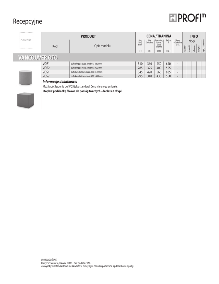 Recepcyjne CENA / TKANINA ( II ) ( III ) ( IV ) 310 285 345 295 360 325 420 340 450 400 560 430 640 505 885 560 VANCOUVER OTO VOR1 VOR2 VOS1 VOS2 pufa okrągła duża, średnica 530 mm pufa okrągła mała, średnica 400 mm pufa kwadratowa duża, 530 x530 mm pufa kwadratowa mała, 400 x400 mm Informacje dodatkowe: Możliwość łączenia puf VOS jako standard. Cena nie ulega zmianie. Stopki z podkładką filcową do podłóg twardych - dopłata 8 zł/kpl. UWAGI OGÓLNE: Powyższe ceny są cenami netto - bez podatku VAT. Za wyroby niestandardowe nie zawarte w niniejszym cenniku pobierane są dodatkowe opłaty. - Nogi opcja drewna (I) INFO Skóra + Softline S/SL chrom Skóra S satyna Ilio, Aquarius, Softline Fame, Step, Ultima metalik Opis modelu Kod Eco, Evo, Next czarny PRODUKT