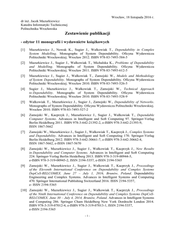 Wrocław, 18 listopada 2016 r. dr inż. Jacek Mazurkiewicz Katedra Informatyki Technicznej Politechnika Wrocławska Zestawienie publikacji - edytor 11 monografii i wydawnictw książkowych [1] Mazurkiewicz J., Nowak K., Sugier J., Walkowiak T., Dependability in Complex System Modelling. Monographs of System Dependability. Oficyna Wydawnicza Politechniki Wrocławskiej. Wrocław 2012. ISBN 978-83-7493-584-5 [2] Mazurkiewicz J., Sugier J., Walkowiak T., Michalska K., Problems of Dependability and Modelling. Monographs of System Dependability. Oficyna Wydawnicza Politechniki Wrocławskiej. Wrocław 2011. ISBN 978-83-7493-612-5 [3] Mazurkiewicz J., Sugier J., Walkowiak T., Zamojski W., Models and Methodology of System Dependability. Monographs of System Dependability. Oficyna Wydawnicza Politechniki Wrocławskiej. Wrocław 2010. ISBN 978-83-7493-526-5 [4] Sugier J., Mazurkiewicz J., Walkowiak T., Zamojski W., Technical Approach to Dependability. Monographs of System Dependability. Oficyna Wydawnicza Politechniki Wrocławskiej. Wrocław 2010. ISBN 978-83-7493-528-9 [5] Walkowiak T., Mazurkiewicz J., Sugier J., Zamojski W., Dependability of Networks. Monographs of System Dependability. Oficyna Wydawnicza Politechniki Wrocławskiej. Wrocław 2010. ISBN 978-83-7493-527-2 [6] Zamojski W., Kacprzyk J., Mazurkiewicz J., Sugier J., Walkowiak T., Dependable Computer Systems. Advances in Intelligent and Soft Computing 97. Springer-Verlag Berlin Heidelberg 2011. ISBN 978-3-642-21392-2, e-ISBN 978-3-642-21393-9, ISSN 1867-5662 [7] Zamojski W., Mazurkiewicz J., Sugier J., Walkowiak T., Kacprzyk J., Complex Systems and Dependability. Advances in Intelligent and Soft Computing 170. Springer-Verlag Berlin Heidelberg 2012. ISBN 978-3-642-30661-7, e-ISBN 978-3-642-30662-4, ISSN 1867-5662, e-ISSN 1867-5670 [8] Zamojski W., Mazurkiewicz J., Sugier J., Walkowiak T., Kacprzyk J., New Results in Dependability and Computer Systems. Advances in Intelligent and Soft Computing 224. Springer-Verlag Berlin Heidelberg 2013. ISBN 978-3-319-00944-5, e-ISBN 978-3-319-00945-2, ISSN 2194-5357, e-ISSN 2194-5365 [9] Zamojski W., Mazurkiewicz J., Sugier J., Walkowiak T., Kacprzyk J., Proceedings of the Eleventh International Conference on Dependability and Complex Systems DepCoS-RELCOMEX. June 27 – July 1, 2016, Brunów, Poland. Dependability Engineering and Complex Systems. Advances in Intelligent Systems and Computing 470. Springer International Publishing Switzerland 2016. ISSN 2194-5357, e- ISSN 2194-5365 [10] Zamojski W., Mazurkiewicz J., Sugier J., Walkowiak T., Kacprzyk J., Proceedings of the Ninth International Conference on Dependability and Complex Systems DepCoSRELCOMEX. June 30 – July 4, 2014, Brunów, Poland. Advances in Intelligent Systems and Computing 286. Springer Cham Heidelberg New York Dordrecht London 2014. ISBN 978-3-319-07012-4, e-ISBN 978-3-319-07013-1, ISSN 2194-5357, e-ISSN 2194-5365 -1- [11] Zamojski W., Mazurkiewicz J., Sugier J., Walkowiak T., Kacprzyk J., Proceedings of the Tenth International Conference on Dependability and Complex Systems DepCoSRELCOMEX. June 29 – July 3, 2015, Brunów, Poland. Theory and Engineering of Complex Systems and Dependability. Advances in Intelligent Systems and Computing 365. Springer Cham Heidelberg New York Dordrecht London 2015. ISBN 978-3-319-19215-4, e- ISBN 978-3-319-19216-1, ISSN 2194-5357, e- ISSN 2194-5365 - 1 podręcznik akademicki [12] J. Mazurkiewicz, Softcomputing, Internet Engineering. Inżynieria Internetowa. Wrocław University of Technology. Wrocław 2011, PRINTPAP Łódź, ISBN 978-83-62098-23-1 - 14 artykułów w LNCS/LNAI [13] K. Horecki, J. Mazurkiewicz, Natural Language Processing Methods Used for Automatic Prediction Mechanism of Related Phenomenon, Artificial Intelligence and Soft Computing – ICAISC 2015, 14th International Conference, Zakopane, Poland, June 2015, Proceedings, LNAI 9120, Springer International Publishing Switzerland 2015, L. Rutkowski et al. (Eds.), Part II, str.: 13 – 24 [14] M. Jankowski, J. Mazurkiewicz, Road Surface Recognition System Based on Its Picture, Artificial Intelligence and Soft Computing – ICAISC 2013, 12th International Conference, Zakopane, Poland, June 2013, Proceedings, LNAI 7894, Springer-Verlag Berlin Heidelberg 2013, L. Rutkowski et al. (Eds.), Part I, str.: 548 – 558 [15] T. Kapłon, J. Mazurkiewicz, The Method of Inflection Errors Correction in Texts Composed in Polish Language – A Concept, Artificial Neural Networks: Formal Models and Their Applications – ICANN 2005, 15th International Conference, Warsaw, Poland, September 2005, Proceedings Part II, LNCS 3697, Springer-Verlag Berlin Heidelberg 2005, W. Duch et al. (Eds.), str.: 853 – 858 [16] J. Mazurkiewicz, Complex System Analysis Using Softcomputing, Artificial Intelligence and Soft Computing – ICAISC 2014, 13th International Conference, Zakopane, Poland, June 2014, Proceedings, LNAI 8468, Springer International Publishing Switzerland 2014, L. Rutkowski et al. (Eds.), Part II, str.: 524 – 535 [17] J. Mazurkiewicz, Systolic Realization of Kohonen Neural Network, Artificial Neural Networks: Formal Models and Their Applications – ICANN 2005, 15th International Conference, Warsaw, Poland, September 2005, Proceedings Part II, LNCS 3697, Springer-Verlag Berlin Heidelberg 2005, W. Duch et al. (Eds.), str.: 1015 – 1020 [18] J. Mazurkiewicz, T. Serafin, M. Jankowski, Intelligent Driving Assistant System, Artificial Intelligence and Soft Computing – ICAISC 2016, 15th International Conference, Zakopane, Poland, June 2016, Proceedings, LNAI 9693, Springer International Publishing Switzerland 2016, L. Rutkowski et al. (Eds.), str.: 700 – 711 [19] J. Mazurkiewicz, T. Walkowiak, Fuzzy Economic Analysis of Simulated Discrete Transport System, Artificial Intelligence and Soft Computing – ICAISC 2004, 7th International Conference, Zakopane, Poland, June 2004, Proceedings, LNAI 3070, Springer-Verlag Berlin Heidelberg 2004, L. Rutkowski e