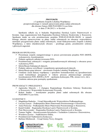 PROTOKÓŁ z I spotkania Zespołu Lokalnej Współpracy przeprowadzonego w ramach opracowania planu zada ochronnych dla obszaru Natura 2000 PLH180015 Łysa Góra w dniu 27.06.2012 r. w Kronie Spotkanie odbyło si w budynku Regionalnej Dyrekcji Lasów Pastwowych w Kronie. Jego organizatorem była Regionalna Dyrekcja Ochrony rodowiska w Rzeszowie. Spotkanie miało na celu przedstawienie projektu POIS.05.03.00-00-186/09, w ramach którego obecnie opracowywane s plany zada ochronnych na obszarze województwa, metodyki przygotowania planu zada ochronnych, zasad funkcjonowania Zespołu Lokalnej Współpracy, a take charakterystyki obszaru – przebiegu granic, przedmiotów ochrony i głównych zagroe. PROGRAM SPOTKANIA: Prezentacja zespołu zaangaowanego w proces powstawania projektu PZO (RDO, wykonawców, koordynatora); Podanie ogólnych załoe tworzenia PZO; Przedstawienie zebranych i wstpnie przeanalizowanych informacji o obszarze przez wykonawc PZO; Identyfikacja brakujcych danych; Podanie zakresu weryfikacji i uzupełnienia zgromadzonych danych; Identyfikacja grup interesu – utworzenie Zespołu Lokalnej Współpracy; Ustalenie zasad dalszej współpracy i sposobów komunikowania si (przedstawienie zasad komunikacji przyjtych w trakcie procesu planistycznego pomidzy koordynatorem PZO, RDO a ZLW – spotkania dyskusyjne, PIK, strona www, itd.); Ustalenie zakresu prac pomidzy spotkaniami. PROWADZCY I PRELEGENCI: Agnieszka Marcela – I Zastpca Regionalnego Dyrektora Ochrony rodowiska w Rzeszowie i Wojewódzki Konserwator Przyrody, Robert Stako – koordynator projektu planu zada ochronnych dla obszaru PLH180015 Łysa Góra. UCZESTNICY: Magdalena Radecka – Urzd Marszałkowski Województwa Podkarpackiego, Lucyna Zymyn – Podkarpackie Biuro Planowania Przestrzennego w Rzeszowie, Anna Potoczny - Podkarpackie Biuro Planowania Przestrzennego w Rzeszowie, Kamil Grałek – Regionalna Dyrekcja Lasów Pastwowych w Kronie, Piotr Brewczyski – Regionalna Dyrekcja Lasów Pastwowych w Kronie, Tomasz Najbar – Stowarzyszenia Inynierów i Techników Lenictwa i Drzewnictwa, Wiesława ywiec – Nadlenictwo Dukla, Przedstawiciel Nadlenictwa Kołaczyce. Barbara Mielniczek – Urzd Gminy Nowy migród, Tadeusz rebiec – Sołectwo Kty, Teresa Laskowska – Sołectwo Łysa Góra, Krzysztof Kłosowski – Rada Gminy Nowy migród, Halina Cycak – Urzd Gminy Dukla, Jarosław Sochacki – Magurski Park Narodowy, Damian Nowak – Magurski Park Narodowy, Grzegorz Zajdel – Agencja Restrukturyzacji i Modernizacji Rolnictwa w Rzeszowie, Podkarpacki Oddział Regionalny, Dorota Horabik – MGGP S.A., Radosław Jdral – Regionalna Dyrekcja Ochrony rodowiska w Rzeszowie, Dorota Rogała – planista regionalny, Regionalna Dyrekcja Ochrony rodowiska w Rzeszowie, PRZEBIEG SPOTKANIA Rozpoczcie spotkania i prezentacje Spotkanie rozpoczła Pani Agnieszka Marcela, która powitała zgromadzonych goci oraz przedstawiła pracowników RDO w Rzeszowie zaangaowanych w projekt oraz wykonawców projektu PZO. Podczas pierwszej prezentacji krótko scharakteryzowała sie Natura 2000, omówiła załoenia projektu POIS.05.03.00-00-186/09 „Opracowanie planów zada ochronnych dla obszarów Natura 2000 na obszarze Polski”, podała zasady tworzenia i zawarto planów zada ochronnych oraz sposób tworzenia i skład Zespołu Lokalnej Współpracy (ZLW). Na kocu opisała funkcjonowanie i rol Platformy InformacyjnoKomunikacyjnej w opracowywaniu PZO. W nastpnej kolejnoci głos zabrał Pan Robert Stako, który scharakteryzował obszar Natura 2000 Łysa Góra wskazujc przedmioty ochrony oraz omówił wyniki dotychczasowych inwentaryzacji. Nastpnie przybliył zasady planowania ochrony w obszarze Natura 2000, cele jakim słu plany zada ochronnych oraz tryb sporzdzania planu zada ochronnych. Na koniec podkrelił, jak wan funkcj pełni ZLW. Obie prezentacje zamieszczone s na stronie internetowej RDO w Rzeszowie (http://rzeszow.rdos.gov.pl) w zakładce „Plany zada ochronnych dla obszarów Natura 2000”. Dyskusja Pani Wiesława ywiec Zauwayła, e przy kolejnym projekcie PZO toczy si dyskusja o wskanikach dla buczyn, których jeszcze nie opracowano. Odniosła si do wskazanych przez Pana Roberta Stako informacji, proszc o podanie szczegółów dotyczcych proponowanych wartoci wskaników i ich interpretacji w skali obszaru. Nastpnie zaznaczyła, e inwentaryzacja Lasów Pastwowych nie wskazuje dokładnej powierzchni siedlisk. Zgodnie z przyjt wówczas metodyk, jeli siedlisko zajmowało ponad 50% wydzielenia to jako jego areał przyjmowano całe wyłczenie lene. W zwizku z tym poinformowała, e powierzchnie siedlisk zawarte w uzyskanych wówczas wynikach, na pewno bd si róni od rzeczywistego zasigu, który wykaza moe tylko szczegółowa inwentaryzacja. Zaznaczyła równie, e na etapie sporzdzania prognozy oddziaływania na rodowisko dokonano wstpnej weryfikacji siedlisk lenych i wykazała ona szereg niezgodnoci. Pan Robert Stako Odnoszc si do pierwszego pytania, wyjanił, e zawarte w prezentacji wskaniki dla buczyn zostały zaczerpnite z publikacji „Niezbdnik lenika” i s to propozycje sformułowane przez Pana Pawła Pawlaczyka. Prawdopodobnie w oparciu o nie zostanie wykonana ocena stanu siedlisk lenych w obszarze Łysa Góra. Pani Wiesława ywiec Skierowała pytanie do Pani Agnieszki Marceli, czy taka propozycja parametrów i wskaników bdzie wykorzystana przy PZO Łysa Góra. Pani Agnieszka Marcela Podkreliła, e jest to propozycja wykonawcy, a dzisiejsze spotkanie jest włanie po to by włanie takie kwestie przedyskutowa . Zaznaczyła, e opracowanie wspomniane przez Pana Roberta Stako nie jest jeszcze przyjte jako obowizujce. Nie wykluczyła, e wskaniki przyjte na skali całego kraju bd bardzo zblione do zaprezentowanych, jednak na razie nie ma takiej pewnoci. Wyjaniła, e na potrzeby wczeniej opracowywanych PZO zostały stworzone wskaniki autorskie, jest to jednak tylko wstpna przymiarka do rozwizania problemu i niewtpliwie ustalenie ostatec