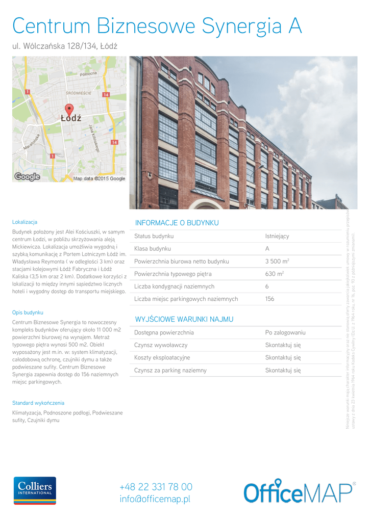 Centrum Biznesowe Synergia A Lokalizacja INFORMACJE O BUDYNKU Budynek położony jest Alei Kościuszki, w samym centrum Łodzi, w pobliżu skrzyżowania aleją Mickiewicza. Lokalizacja umożliwia wygodną i szybką komunikację z Portem Lotniczym Łódź im. Władysława Reymonta ( w odległości 3 km) oraz stacjami kolejowymi Łódź Fabryczna i Łódź Kaliska (3,5 km oraz 2 km). Dodatkowe korzyści z lokalizacji to między innymi sąsiedztwo licznych hoteli i wygodny dostęp do transportu miejskiego. Status budynku Istniejący Klasa budynku A Powierzchnia biurowa netto budynku 3 500 m2 Powierzchnia typowego piętra 630 m2 Liczba kondygnacji naziemnych 6 Liczba miejsc parkingowych naziemnych 156 Opis budynku Centrum Biznesowe Synergia to nowoczesny kompleks budynków oferujący około 11 000 m2 powierzchni biurowej na wynajem. Metraż typowego piętra wynosi 500 m2. Obiekt wyposażony jest m.in. w: system klimatyzacji, całodobową ochronę, czujniki dymu a także podwieszane sufity. Centrum Biznesowe Synergia zapewnia dostęp do 156 naziemnych miejsc parkingowych. WYJŚCIOWE WARUNKI NAJMU Dostępna powierzchnia Po zalogowaniu Czynsz wywoławczy Skontaktuj się Koszty eksploatacyjne Skontaktuj się Czynsz za parking naziemny Skontaktuj się Standard wykończenia Klimatyzacja, Podnoszone podłogi, Podwieszane sufity, Czujniki dymu +48 22 331 78 00 [email protected] Niniejsze warunki mają charakter informacyjny oraz nie stanowią oferty zawarcia jakiejkolwiek umowy w rozumieniu przepisów ustawy z dnia 23 kwietnia 1964 roku Kodeks Cywilny (Dz.U. z 1964 roku, nr 16, poz. 93 z późniejszymi zmianami). ul. Wólczańska 128/134, Łódź