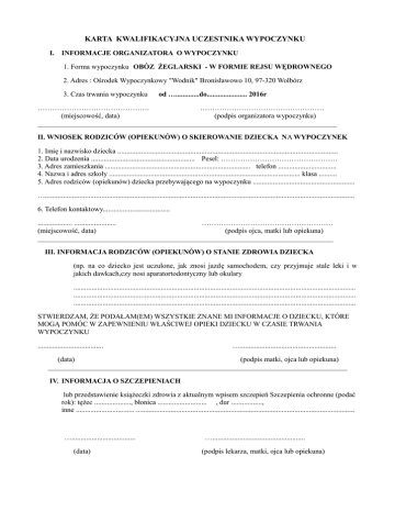 KARTA KWALIFIKACYJNA UCZESTNIKA WYPOCZYNKU I. INFORMACJE ORGANIZATORA O WYPOCZYNKU 1. Forma wypoczynku OBÓZ ŻEGLARSKI - W FORMIE REJSU WĘDROWNEGO 2. Adres : Ośrodek Wypoczynkowy "Wodnik" Bronisławowo 10, 97-320 Wolbórz 3. Czas trwania wypoczynku od ….............do...................... 2016r ………………………………………. …………………………………………… (miejscowość, data) (podpis organizatora wypoczynku) __________________________________________________________________________________ II. WNIOSEK RODZICÓW (OPIEKUNÓW) O SKIEROWANIE DZIECKA NA WYPOCZYNEK 1. Imię i nazwisko dziecka ......................................................................................................................... 2. Data urodzenia ......................................................... Pesel: ………………………………………… 3. Adres zamieszkania ................................................................................ telefon ................................ 4. Nazwa i adres szkoły ......................................................................................................... klasa .......... 5. Adres rodziców (opiekunów) dziecka przebywającego na wypoczynku ........................................................ ….......................................................................................................................................................................... 6. Telefon kontaktowy..................................... ................... ....................... ……………………………………………… (miejscowość, data) (podpis ojca, matki lub opiekuna) _________________________________________________________________________________ III. INFORMACJA RODZICÓW (OPIEKUNÓW) O STANIE ZDROWIA DZIECKA (np. na co dziecko jest uczulone, jak znosi jazdę samochodem, czy przyjmuje stale leki i w jakich dawkach,czy nosi aparatortodontyczny lub okulary ........................................................................................................................................................... ........................................................................................................................................................... ........................................................................................................................................................... STWIERDZAM, ŻE PODAŁAM(EM) WSZYSTKIE ZNANE MI INFORMACJE O DZIECKU, KTÓRE MOGĄ POMÓC W ZAPEWNIENIU WŁAŚCIWEJ OPIEKI DZIECKU W CZASIE TRWANIA WYPOCZYNKU .................................... …..................................................... (data) (podpis matki, ojca lub opiekuna) __________________________________________________________________________________ IV. INFORMACJA O SZCZEPIENIACH lub przedstawienie książeczki zdrowia z aktualnym wpisem szczepień Szczepienia ochronne (podać rok): tężec ...................., błonica ........................... , dur ................., inne ................................ ........................................................................................................................ …................................... (data) …................................................... (podpis lekarza, matki, ojca lub opiekuna) V. INFORMACJA WYCHOWAWCY KLASY O DZIECKU (w przypadku braku możliwości uzyskania opinii wychowawcy klasy - wypełnia rodzic lub opiekun) .................................................................................................................................................................. .................................................................................................................................................................. ........................ ........................................................ (data) (podpis wychowawcy lub rodzica -opiekuna) __________________________________________________________________________________ VI. DECYZJA O KWALIFIKACJI UCZESTNIKA Postanawia się: 1. Zakwalifikować i skierować dziecko na wypoczynek 2. Odmówić skierowania dziecka na wypoczynek ze względu: ........................................................... … ............................................................................................................................................................. ................................. . (data) _______________________________________ …...................................................... (podpis) VII. POTWIERDZENIE POBYTU DZIECKA NA WYPOCZYNKU Dziecko przebywało na ............................................................................................................................. (forma i adres miejsca wypoczynku)..................................................................................................... od dnia ................ do dnia ................. 201... r. ........................ ............................................ (data) (czytelny podpis kierownika wypoczynku) __________________________________________________________________________________ VIII. INFORMACJE O STANIE ZDROWIA DZIECKA W CZASIE TRWANIA WYPOCZYNKU (dane o zachorowaniach, urazach, leczeniu itp.) ....................................................................................................................................................................... ................................................................................................................................................................. Organizator informuje rodziców o leczeniu ambulatoryjnym lub hospitalizacji dziecka …............................ (miejscowość, data) ........................................................................................ (podpis lekarza lub pielęgniarki sprawującej opiekę medyczną podczas wypoczynku) ______________________________________________________ I