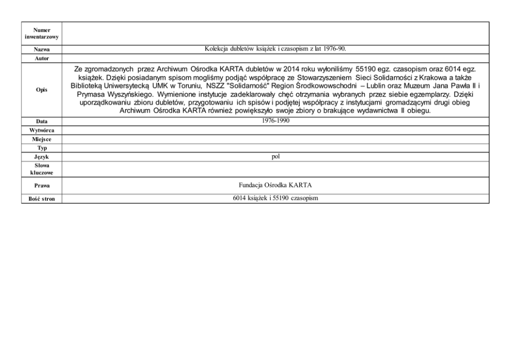 Ze zgromadzonych przez Archiwum O rodka KARTA dubletów w 2014 roku wyłonili my 55190 egz. czasopism oraz 6014 egz.