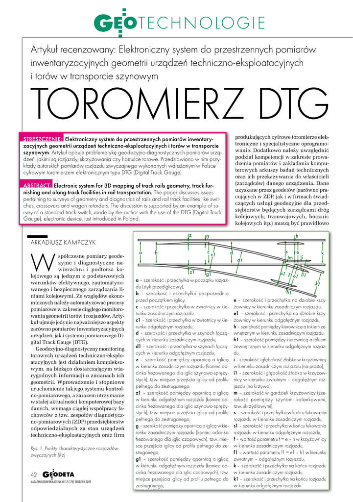 TECHNOLOGIE Artykuł recenzowany: Elektroniczny system do przestrzennych pomiarów inwentaryzacyjnych geometrii urządzeń techniczno-eksploatacyjnych i torów w transporcie szynowym Toromierz DTG produkujących cyfrowe toromierze elektroniczne i specjalistyczne oprogramowanie. Dodatkowo należy uwzględnić podział kompetencji w zakresie prowadzenia pomiarów i zakładania komputerowych arkuszy badań technicznych oraz ich przekazywania do właścicieli (zarządców) danego urządzenia. Dane uzyskane przez geodetów (zarówno pracujących w ZDP, jak i w firmach świadczących usługi geodezyjne dla przedsiębiorstw będących zarządcami dróg kolejowych, tramwajowych, bocznic kolejowych itp.) muszą być prawidłowo Streszczenie: Elektroniczny system do przestrzennych pomiarów inwentaryzacyjnych geometrii urządzeń techniczno-eksploatacyjnych i torów w transporcie szynowym. Artykuł opisuje problematykę geodezyjno-diagnostycznych pomiarów urządzeń, jakimi są rozjazdy, skrzyżowania czy hamulce torowe. Przedstawiono w nim przykłady autorskich pomiarów rozjazdu zwyczajnego wykonanych wdrażanym w Polsce cyfrowym toromierzem elektronicznym typu DTG (Digital Track Gauge). Abstract: Electronic system for 3D mapping of track rails geometry, track furnishing and along-track facilities in rail transportation. The paper discusses issues pertaining to surveys of geometry and diagnostics of rails and rail track facilities like switches, crossovers and wagon retarders. The discussion is supported by an example of survey of a standard track switch, made by the author with the use of the DTG (Digital Track Gauge), electronic device, just introduced in Poland. z g h ARKADIUSZ KAMPCZYK W spółczesne pomiary geodezyjne i diagnostyczne nawierzchni i podtorza kolejowego są jednym z podstawowych warunków efektywnego, zautomatyzowanego i bezpiecznego zarządzania liniami kolejowymi. Ze względów ekonomicznych należy automatyzować procesy pomiarowe w zakresie ciągłego monitorowania geometrii torów i rozjazdów. Artykuł ujmuje jedynie najważniejsze aspekty zarówno pomiarów inwentaryzacyjnych urządzeń, jak i systemu pomiarowego Digital Track Gauge (DTG). Geodezyjno-diagnostyczny monitoring torowych urządzeń techniczno-eksploatacyjnych jest działaniem kompleksowym, na bieżąco dostarczającym wiarygodnych informacji o zmianach ich geometrii. Wprowadzenie i stopniowe uruchomienie takiego systemu kontrol no-pomiarowego, a zarazem utrzymanie w stałej aktualności komputerowej bazy danych, wymaga ciągłej współpracy fachowców z tzw. zespołów diagnostyczno-pomiarowych (ZDP) przedsiębiorstw odpowiedzialnych za stan urządzeń techniczno-eksploatacyjnych oraz firm Rys. 1. Punkty charakterystyczne rozjazdów zwyczajnych (Rz) 42 MAGAZYN geoinformacYJNY nr 12 (175) Grudzień 2009 a b c c1 z1 g1 a – szerokość i przechyłka w początku rozjazdu (styk przediglicowy), b – szerokość i przechyłka bezpośrednio przed początkiem iglicy, c – szerokość i przechyłka w zwrotnicy w kierunku zasadniczym rozjazdu, c1 – szerokość i przechyłka w zwrotnicy w kierunku odgałęźnym rozjazdu, d – szerokość i przechyłka w szynach łączących w kierunku zasadniczym rozjazdu, d1 – szerokość i przechyłka w szynach łączących w kierunku odgałęźnym rozjazdu, z – szerokość pomiędzy opornicą a iglicą w kierunku zasadniczym rozjazdu (koniec odcinka frezowanego dla iglic szynowo-sprężystych), tzw. miejsce przejścia iglicy od profilu pełnego do zestruganego, z1 – szerokość pomiędzy opornicą a iglicą w kierunku odgałęźnym rozjazdu (koniec odcinka frezowanego dla iglic szynowo-sprężystych), tzw. miejsce przejścia iglicy od profilu pełnego do zestruganego, g – szerokość pomiędzy opornicą a iglicą w kierunku zasadniczym rozjazdu (koniec odcinka frezowanego dla iglic czopowych), tzw. miejsce przejścia iglicy od profilu pełnego do zestruganego, g1 – szerokość pomiędzy opornicą a iglicą w kierunku odgałęźnym rozjazdu (koniec odcinka frezowanego dla iglic czopowych), tzw. miejsce przejścia iglicy od profilu pełnego do zestruganego, s d d1 m fe i k s1 f1 e i1 1 k1 h1 e – szerokość i przechyłka na dziobie krzyżownicy w kierunku zasadniczym rozjazdu, e1 – szerokość i przechyłka na dziobie krzyżownicy w kierunku odgałęźnym rozjazdu, h – szerokość pomiędzy kierownicą a tokiem zewnętrznym w kierunku zasadniczym rozjazdu, h1 – szerokość pomiędzy kierownicą a tokiem zewnętrznym w kierunku odgałęźnym rozjazdu, i – szerokość i głębokość żłobka w krzyżownicy w kierunku zasadniczym rozjazdu (na prosto), i1 – szerokość i głębokość żłobka w krzyżownicy w kierunku zwrotnym – odgałęźnym rozjazdu (na krzywo), m – szerokość w gardzieli krzyżownicy (szerokość pomiędzy szynami kolankowymi, tzw. skrzydłowymi), s – szerokość i przechyłka w końcu łukowania rozjazdu w kierunku zasadniczym rozjazdu, s1 – szerokość i przechyłka w końcu łukowania rozjazdu w kierunku odgałęźnym rozjazdu, f – wartość parametru f = e – h w krzyżownicy w kierunku zasadniczym rozjazdu, f1 – wartość parametru f1 = e1 – h1 w kierunku zwrotnym – odgałęźnym rozjazdu, k – szerokość i przechyłka na końcu rozjazdu w kierunku zasadniczym rozjazdu, k1 – szerokość i przechyłka na końcu rozjazdu w kierunku odgałęźnym rozjazdu. TECHNOLOGIE h k i i1 k1 e f A s m e1 s1 f1 h1 b D g1 i5 g2 c2 c c1 c3 b1 B e5 e6 f4 g i6 g3 C Rys. 2. Punkty charakterystyczne rozjazdów krzyżowych podwójnych (Rkpd), tzw. angielskich i umiejętnie zinterpretowane, by odpowiednie służby na bieżąco uzysk iwały wiarygodne informacje o stanie takiego urządzenia. l pomiary inwentaryzacyjne geometrii rozjazdów Prawidłowo przeprowadzone pomiary inwentaryzacyjne geometrii urządzeń techniczno-eksploatacyjnych, a następnie ich analiza i ocena pozwalają na podjęcie stosownych kroków zaradczych, zanim nie