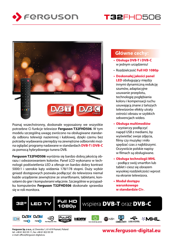 Główne cechy: • Obsługa DVB-T i DVB-C w jednym urządzeniu! • Rozdzielczość Full HD 1080p • Doskonałej jakości panel LED obsługujący między innymi dynamiczną redukcję szumów, adaptacyjne usuwanie przeplotu, technologię pogłębiania koloru i kompensacji ruchu usuwającą znane z tańszych telewizorów efekty utraty ostrości obrazu w szybkich sekwencjach wideo. Poznaj wszechstronny, doskonale wyposażony we wszystkie potrzebne Ci funkcje telewizor Ferguson T32FHD506. W tym modelu szczególną uwagę zwrócono na obsługiwane standardy odbioru telewizji naziemnej i kablowej, dzięki czemu bez potrzeby wydawania pieniędzy na zewnętrzne odbiorniki można oglądać programy nadawane w standardach DVB-T i DVB-C za pomocą hybrydowego tunera DVB. Ferguson T32FHD506 wyróżnia się bardzo dobrą jakością obrazu i odwzorowaniem kolorów. Panel LCD wykonano w technologii podświetlenia LED a oferuje on bardzo dobry kontrast 5000:1 i szerokie kąty widzenia 178/178 stopni. Duży wybór gniazd dostępowych pozwala podłączyć do telewizora niemal każde urządzenie zewnętrzne ze smartfonami, tabletami, konsolami do gier i komputerami włącznie. Szczególnie w przypadku komputerów Ferguson T32FHD506 doskonale sprawdza się w roli monitora. Ferguson Sp. z o.o., ul. Dworska 1, 61-619 Poznań, Poland tel. +48 61 822 05 11, fax +48 61 822 05 59 e-mail: [email protected] • Obsługa multimediów - wystarczy podłączyć napęd USB z mediami, by wyświetlać swoje zdjęcia, filmy czy muzykę i miło spędzać czas z najbliższymi. Oczywiście polskie napisy w filmach są obsługiwane. • Obsługa technologii MHL - podłącz swój smartfon lub tablet i ciesz się obrazem wysokiej rozdzielczości wprost na ekranie telewizora. • Moduł dostępu warunkowego w standardzie CI+. www.ferguson-digital.eu Wejścia/wyjścia: 1. Moduł dostępu warunkowego CI+ 2. USB 3. HDMI 1 4. HDMI 2 / MHL 5. HDMI 3 6. RF 7. Coaxial OUT 8. VGA/PC 9. PC-Audio 10.SCART 11.Audio IN MHL to innowacyjna technologia, która całkowicie zmienia sposób pracy i zabawy. Zmień swój telefon w system kina domowego i przesyłaj swoje ulubione kanały telewizyjne, filmy i domowe nagrania wideo w wysokiej rozdzielczości wprost do telewizora! Opakowanie: Pakowanie zbiorcze: 2 szt. Kod EAN Kod: 5907115002507 Ferguson Sp. z o.o., ul. Dworska 1, 61-619 Poznań, Poland tel. +48 61 822 05 11, fax +48 61 822 05 59 e-mail: [email protected] Specyfikacja techniczna: • Przekątna ekranu: 32” • Rozdzielczość: do 1920x1080 60Hz pikseli (FullHD) • Proporcje obrazu: 16:9 • Kontrast: 5000:1 • Czas reakcji: 8ms • Kąty widzenia: 178/178 • Najważniejsze technologie poprawy obrazu: redukcja szumów 3D, dynamiczna redukcja szumów, adaptacyjne usuwanie przeplotu, kompensacja ruchu • Głośniki: 2x5W (wbudowane) • Tryb dźwięku: Standard/Music/Personal/Movie • Automatyczna regulacja głośności (AVC): tak • Obsługa Dolby Digital Plus (EAC3): tak • Obsługa dźwięku przestrzennego: tak • Funkcja blokady: tak • Funkcja EPG: tak • Funkcja obsługi napisów: tak • Funkcja kontroli rodzicielskiej: tak • Funkcje hotelowe: tak • Obsługa timerów: tak • Funkcja teletekstu: tak • NICAM: tak • PVR (nagrywanie programów): tak (na zewnętrzną pamięć) • Języki menu ekranowego: angielski, niemiecki, polski, słowacki, czeski, słoweński, bułgarski, hiszpański, włoski, grecki, holenderski, rosyjski, francuski • Obsługa wideo: H.264/MPEG1/ MPEG2/MPEG4/XviD/VC1 • Obsługa audio: MP3/LPCM • Obsługa obrazów: JPG/JPEG • Obsługiwane systemy wideo: PAL, NTSC, SECAM • Zasilanie: AC 180-240V 50/60Hz • Wymiary z podstawą (szerokość x wysokość x głębokość): 731x475x196 mm • Wymiary bez podstawy (szerokość x wysokość x głębokość): 731x437x80 mm • Waga: 5,8kg www.ferguson-digital.eu
