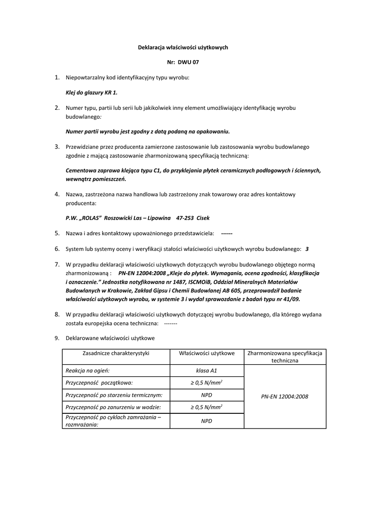 Deklaracja właściwości użytkowych Nr: DWU 07 1. Niepowtarzalny kod identyfikacyjny typu wyrobu: Klej do glazury KR 1. 2. Numer typu, partii lub serii lub jakikolwiek inny element umożliwiający identyfikację wyrobu budowlanego: Numer partii wyrobu jest zgodny z datą podaną na opakowaniu. 3. Przewidziane przez producenta zamierzone zastosowanie lub zastosowania wyrobu budowlanego zgodnie z mającą zastosowanie zharmonizowaną specyfikacją techniczną: Cementowa zaprawa klejąca typu C1, do przyklejania płytek ceramicznych podłogowych i ściennych, wewnątrz pomieszczeń. 4. Nazwa, zastrzeżona nazwa handlowa lub zastrzeżony znak towarowy oraz adres kontaktowy producenta: P.W. „ROLAS” Roszowicki Las – Lipowina 47-253 Cisek 5. Nazwa i adres kontaktowy upoważnionego przedstawiciela: ------ 6. System lub systemy oceny i weryfikacji stałości właściwości użytkowych wyrobu budowlanego: 3 7. W przypadku deklaracji właściwości użytkowych dotyczących wyrobu budowlanego objętego normą zharmonizowaną : PN-EN 12004:2008 „Kleje do płytek. Wymagania, ocena zgodności, klasyfikacja i oznaczenie.” Jednostka notyfikowana nr 1487, ISCMOiB, Oddział Mineralnych Materiałów Budowlanych w Krakowie, Zakład Gipsu i Chemii Budowlanej AB 605, przeprowadził badanie właściwości użytkowych wyrobu, w systemie 3 i wydał sprawozdanie z badań typu nr 41/09. 8. W przypadku deklaracji właściwości użytkowych dotyczącej wyrobu budowlanego, dla którego wydana została europejska ocena techniczna: ------9. Deklarowane właściwości użytkowe Zasadnicze charakterystyki Reakcja na ogień: Przyczepność początkowa: Przyczepność po starzeniu termicznym: Właściwości użytkowe Zharmonizowana specyfikacja techniczna klasa A1 ≥ 0,5 N/mm2 NPD PN-EN 12004:2008 2 Przyczepność po zanurzeniu w wodzie: ≥ 0,5 N/mm Przyczepność po cyklach zamrażania – rozmrażania: NPD 10. Właściwości użytkowe wyrobu określone w pkt. 1 i 2 są zgodne z właściwościami użytkowymi deklarowanymi w pkt. 9. Niniejsza deklaracja właściwości użytkowych wydana zostaje na wyłączną odpowiedzialność producenta określonego w pkt 4. W imieniu producenta podpisał: Paweł Papiernik - technolog Roszowicki Las – Lipowina, 01.07.13