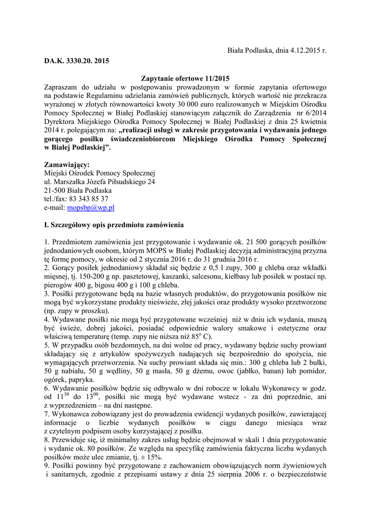 Biała Podlaska, dnia 4.12.2015 r. DA.K. 3330.20. 2015 Zapytanie ofertowe 11/2015 Zapraszam do udziału w postępowaniu prowadzonym w formie zapytania ofertowego na podstawie Regulaminu udzielania zamówień publicznych, których wartość nie przekracza wyraŜonej w złotych równowartości kwoty 30 000 euro realizowanych w Miejskim Ośrodku Pomocy Społecznej w Białej Podlaskiej stanowiącym załącznik do Zarządzenia nr 6/2014 Dyrektora Miejskiego Ośrodka Pomocy Społecznej w Białej Podlaskiej z dnia 25 kwietnia 2014 r. polegającym na: „realizacji usługi w zakresie przygotowania i wydawania jednego gorącego posiłku świadczeniobiorcom Miejskiego Ośrodka Pomocy Społecznej w Białej Podlaskiej”. Zamawiający: Miejski Ośrodek Pomocy Społecznej ul. Marszałka Józefa Piłsudskiego 24 21-500 Biała Podlaska tel./fax: 83 343 85 37 e-mail: [email protected] I. Szczegółowy opis przedmiotu zamówienia 1. Przedmiotem zamówienia jest przygotowanie i wydawanie ok. 21 500 gorących posiłków jednodaniowych osobom, którym MOPS w Białej Podlaskiej decyzją administracyjną przyzna tę formę pomocy, w okresie od 2 stycznia 2016 r. do 31 grudnia 2016 r. 2. Gorący posiłek jednodaniowy składał się będzie z 0,5 l zupy, 300 g chleba oraz wkładki mięsnej, tj. 150-200 g np. pasztetowej, kaszanki, salcesonu, kiełbasy lub posiłek w postaci np. pierogów 400 g, bigosu 400 g i 100 g chleba. 3. Posiłki przygotowane będą na bazie własnych produktów, do przygotowania posiłków nie mogą być wykorzystane produkty nieświeŜe, złej jakości oraz produkty wysoko przetworzone (np. zupy w proszku). 4. Wydawane posiłki nie mogą być przygotowane wcześniej niŜ w dniu ich wydania, muszą być świeŜe, dobrej jakości, posiadać odpowiednie walory smakowe i estetyczne oraz właściwą temperaturę (temp. zupy nie niŜsza niŜ 85o C). 5. W przypadku osób bezdomnych, na dni wolne od pracy, wydawany będzie suchy prowiant składający się z artykułów spoŜywczych nadających się bezpośrednio do spoŜycia, nie wymagających przetworzenia. Na suchy prowiant składa się min.: 300 g chleba lub 2 bułki, 50 g nabiału, 50 g wędliny, 50 g masła, 50 g dŜemu, owoc (jabłko, banan) lub pomidor, ogórek, papryka. 6. Wydawanie posiłków będzie się odbywało w dni robocze w lokalu Wykonawcy w godz. od 1130 do 1300, posiłki nie mogą być wydawane wstecz - za dni poprzednie, ani z wyprzedzeniem – na dni następne. 7. Wykonawca zobowiązany jest do prowadzenia ewidencji wydanych posiłków, zawierającej informacje o liczbie wydanych posiłków w ciągu danego miesiąca wraz z czytelnym podpisem osoby korzystającej z posiłku. 8. Przewiduje się, iŜ minimalny zakres usług będzie obejmował w skali 1 dnia przygotowanie i wydanie ok. 80 posiłków. Ze względu na specyfikę zamówienia faktyczna liczba wydanych posiłków moŜe ulec zmianie, tj. ± 15%. 9. Posiłki powinny być przygotowane z zachowaniem obowiązujących norm Ŝywieniowych i sanitarnych, zgodnie z przepisami ustawy z dnia 25 sierpnia 2006 r. o bezpieczeństwie Ŝywności i Ŝywienia (Dz. U. z 2015 r., poz. 594) oraz przepisami wykonawczymi wydanymi na podstawie tej ustawy. 10. Miejsce realizacji zamówienia: 1/ Wykonawca zobowiązany jest do realizacji zamówienia na terenie miasta Biała Podlaska w lokalu usytuowanym w odległości nie większej niŜ 1 km od przystanku komunikacji miejskiej, 2/ Wykonawca zapewni odpowiednie warunki lokalowe (miejsca siedzące przy stole), umoŜliwiające spoŜycie posiłku w tym samym czasie dla minimum 30 osób, 3/ Wykonawca zobowiązany jest do ponoszenia odpowiedzialności prawnej i materialnej wobec organów kontroli (stacji sanitarno-epidemiologicznej, PIP, BHP) w zakresie wykonywanej usługi, w tym m.in. w zakresie jakości produktów i przygotowania posiłków w zakresie wymagań higieniczno-sanitarnych. 11. Posiłki wydawane będą sukcesywnie przez cały czas określony w pkt 1. 12. Ogólna ilość zakupionych posiłków uzaleŜniona będzie od rzeczywistych potrzeb Zamawiającego. 13. Rozliczenia finansowe z Wykonawcą będą odbywały się w miesięcznych okresach rozliczeniowych na podstawie rozliczeń wydanych posiłków w danym miesiącu, które będzie polegać na: 1/ sprawdzeniu list potwierdzających codzienną ilość wydawanych gorących posiłków oraz list potwierdzających wydanie suchego prowiantu, 2/ przeliczeniu ilości wydanych gorących posiłków i suchego prowiantu razy cenę jednego posiłku lub cenę suchego prowiantu wynikającą ze złoŜonej oferty, 3/ Zamawiający zobowiązuje się do przekazywania naleŜności za wydane posiłki w ciągu 14 dni od otrzymania faktury VAT, przelewem na konto Wykonawcy. II. Termin wykonania zamówienia Od 2 stycznia 2016 r. do 31 grudnia 2016 r. III. Opis kryteriów jakimi będzie kierował się Zamawiający przy wyborze oferty 1.Tryb oceny ofert Oferty będą oceniane w dwóch etapach: 1/ Ocena pod kątem kompletności i prawidłowości przedłoŜonych dokumentów zgodnie z wymogami zawartymi w zapytaniu ofertowym z dn. 4.12.2015 r. 2/ Ocena merytoryczna wg kryteriów określonych poniŜej 2.Kryteria oceny ofert Zamawiający przyjął następujące kryteria oceny ofert: 1/ CENA – wartość brutto usługi – waga 70% max 70 pkt, 2/ DOŚWIADCZENIE – doświadczenie Wykonawcy – 20% max 20 pkt, maksymalna ilość punktów zostanie przyznana Oferentowi, który przedłoŜy wraz z ofertą stosowne oświadczenie, 3/ KADRA Oferenta – waga 10% max 10 pkt, punkty uzyska Oferent, który w swojej polityce zatrudnienia posiłkuje się zatrudnieniem socjalnym w myśl ustawy z dn. 13.06.2003 r. o zatrudnieniu socjalnym (Dz. U. z 2011 r., Nr 43, poz. 225, z późn. zm.) i wykaŜe ten fakt w stosownym oświadczeniu. 3. Warunkiem realizacji zamówienia będzie zapewnienie przez Oferenta, iŜ w dniu składania oferty posiada na terenie Białej Podlaskiej lokal przystosowany do sporządzania i wydawania posiłków. IV. Sp