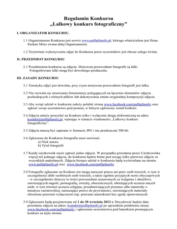 Regulamin Konkursu „Lalkowy konkurs fotograficzny” I. ORGANIZATOR KONKURSU. 1.1 Organizatorem Konkursu jest serwis www.pullipfamily.pl, którego właścicielem jest firma Siedem Mórz zwana dalej Organizatorem. 1.2 Terytorium wykonywania zdjęć do Konkursu przez uczestników jest obszar całego świata. II. PRZEDMIOT KONKURSU 2.1 Przedmiotem konkursu są zdjęcia. Motywem przewodnim fotografii są lalki. Fotografowane lalki mogą być dowolnego producenta. III. ZASADY KONKURSU 3.1 Tematyka zdjęć jest dowolna, przy czym motywem przewodnim fotografii jest lalka. 3.2 Nie zezwala się stosowania fotomontaży polegających na łączeniu elementów zdjęcia pochodzących z różnych plików lub dokonywania zmian oryginalnej kompozycji zdjęcia. 3.3 Aby wziąć udział w konkursie należy polubić stronę www.facebook.com/pullipfamily oraz zgłosić swoje uczestnictwo pod postem, w którym ogłoszony został konkurs. 3.4 Zdjęcia należy przesyłać na Konkurs tylko i wyłącznie drogą elektroniczną na adres [email protected], wpisując w temacie wiadomości „Lalkowy konkurs fotograficzny”. 3.5 Zdjęcia muszą być zapisane w formacie JPG i nie przekraczać 500 kb. 3.6 Zgłoszona do Konkursu fotografia musi zawierać: a) Nick autora b) Tytuł fotografii 3.7 Każdy użytkownik może zgłosić jedno zdjęcie. W przypadku przesłania przez Użytkownika więcej niż jednego zdjęcia, do konkursu będzie brane pod uwagę tylko pierwsze zdjęcie ze wszystkich nadesłanych. Zdjęcia biorące udział w konkursie będą wyświetlane na stronie www.pullipfamily.pl oraz www.facebook.com/pullipfamily. 3.8 Fotografie zgłaszane na Konkurs nie mogą naruszać prawa ani praw osób trzecich, w tym w szczególności dóbr osobistych osób trzecich, a także ogólnie przyjętych norm obyczajowych – w szczególności dotyczy to treści powszechnie uznawanych za wulgarne i obraźliwe, zawierających nagość, pornografię, erotykę, obscenicznych, obrażających uczucia innych osób, w tym również uczucia religijne, przedstawiających przemoc albo materiały o tematyce rasistowskiej, naruszające prawo do prywatności, zawierających materiały chronione prawami wyłącznymi (np. prawami autorskimi) bez zgody uprawnionych. 3.9 Zgłoszenia będą przyjmowane od 1 do 30 września 2012 r. Decydować będzie data przesłania zdjęcia na adres: [email protected] po uprzednim polubieniu strony www.facebook.com/pullipfamily i zgłoszeniu uczestnictwa pod banerkiem promującym konkurs na tejże stronie. 3.10 Uczestnik konkursu wysyłając zdjęcie do konkursu na adres: [email protected] oświadcza, iż przysługują mu wyłączne i nieograniczone prawa autorskie do nadesłanych fotografii oraz że wszystkie osoby widniejące na fotografiach wyrażają zgodę na ich opublikowanie oraz publiczną ekspozycję. Ponadto oświadcza, że w przypadku otrzymania nagrody lub wyróżnienia w Konkursie, wyraża zgodę na wielokrotne, nieodpłatne publikowanie nagrodzonych fotografii oraz opublikowanie jego imienia, nazwiska, miejscowości zamieszkania w materiałach promocyjnych związanych z Konkursem, na stronie internetowej www.pullipfamily.pl a także na ich wykorzystywanie w celach promocyjnych i marketingowych Organizatora, w tym w szczególności na utrwalanie i zwielokrotnianie fotografii każdą techniką, w tym m.in. drukarską, reprograficzną, zapisu magnetycznego, cyfrową, audiowizualną, na jakichkolwiek nośnikach, bez ograniczeń, co do ilości i wielkości nakładu, a także rozpowszechnianie fotografii poprzez publiczne udostępnianie w taki sposób, aby każdy mógł mieć do nich dostęp w miejscu i w czasie przez siebie wybranym, w szczególności w sieciach komputerowych, Internecie i Intranecie oraz telefonach komórkowych. IV. WARUNKI UCZESTNICTWA W KONKURSIE 4.1 Uczestnikiem Konkursu może być każda osoba fizyczna. Osoby niepełnoletnie mogą wziąć udział w Konkursie za zgodą rodziców lub przedstawicieli ustawowych. 4.2 W Konkursie nie mogą brać udziału pracownicy i przedstawiciele Organizatora oraz innych podmiotów biorących bezpośredni udział w przygotowaniu i prowadzeniu konkursu oraz członkowie ich rodzin i osoby im najbliższe. V. OCENA I NAGRODY 5.1 Po zakończeniu etapu zgłoszeń, odbędzie się głosowanie za pośrednictwem strony: www.facebook.com/pullipfamily, w którym udział mogą wziąć wszyscy użytkownicy Internetu. Autorzy trzech najlepiej ocenianych zdjęć uzyskają miano laureatów i otrzymają nagrody. 5.2 Do puli laureatów może zostać zakwalifikowane tylko jedno zdjęcie Uczestnika. 5.3 Autorzy trzech najlepiej ocenianych zdjęć uzyskają miano laureatów i otrzymają nagrody. 5.4 Spośród zwycięskich zdjęć Organizatorzy Konkursu przyznają I, II i III miejsce. 5.5 Decyzje podjęte przez Organizatora są ostateczne i prawnie wiążące dla wszystkich uczestników Konkursu. 5.6 Termin zakończenia głosowania to 14 październik 2012 r. 5.7 Laureaci otrzymają następujące nagrody: za I miejsce: Lalka Little Pullip Phonetika. za II miejsce: miniaturowe różowe wysokie trampki dla lalki w skali 1:6 za III miejsce: miniaturowy szampan z dwoma kieliszkami w skali 1:6 5.8 Decyzje podjęte przez Organizatora są ostateczne i prawnie wiążące dla wszystkich uczestników Konkursu. 5.9 Organizator zastrzega sobie prawo do selekcji zdjęć publikowanych na stronie www.pullipfamily.pl według ogólnie przyjętych norm obyczajowych oraz nie spełniających warunków wymienionych w punkcie 3.2 lub 4.2 i 4.3. 5.10 Organizator zastrzega sobie prawo do usuwania użytkowników podpisujących się słowami (Nick) naruszającymi ogólnie przyjęte normy obyczajowe. 5.11 Za wygrane nagrody rzeczowe nie przysługuje ekwiwalent pieniężny. 5.12 Informacja o rozstrzygnięciu konkursu pojawi się na stronach najpóźniej miesiąc po jego zakończeniu. 5.13 Osobie, która nie nadeśle w ciągu dwóch tygodni od ogłoszenia wyników konkursu danych adresowych z infor