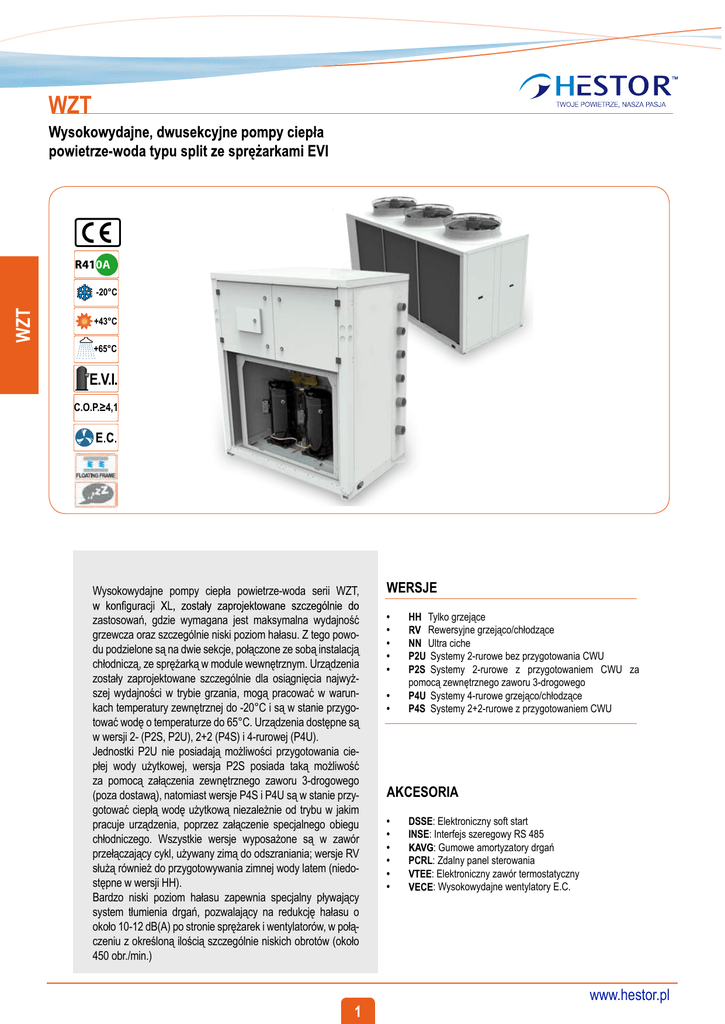 WZT WZT -15°C -20°C +63°C +43°C +65°C +43°C E.V.I. C.O.P.≥4,1 Wysokowydajne pompy ciepła powietrze-woda serii WZT, zastosowań, gdzie wymagana jest maksymalna wydajność grzewcza oraz szczególnie niski poziom hałasu. Z tego powodu podzielone są na dwie sekcje, połączone ze sobą instalacją chłodniczą, ze sprężarką w module wewnętrznym. Urządzenia zostały zaprojektowane szczególnie dla osiągnięcia najwyższej wydajności w trybie grzania, mogą pracować w warunkach temperatury zewnętrznej do -20°C i są w stanie przygotować wodę o temperaturze do 65°C. Urządzenia dostępne są w wersji 2- (P2S, P2U), 2+2 (P4S) i 4-rurowej (P4U). Jednostki P2U nie posiadają możliwości przygotowania ciepłej wody użytkowej, wersja P2S posiada taką możliwość za pomocą załączenia zewnętrznego zaworu 3-drogowego (poza dostawą), natomiast wersje P4S i P4U są w stanie przygotować ciepłą wodę użytkową niezależnie od trybu w jakim pracuje urządzenia, poprzez załączenie specjalnego obiegu chłodniczego. Wszystkie wersje wyposażone są w zawór przełączający cykl, używany zimą do odszraniania; wersje RV służą również do przygotowywania zimnej wody latem (niedostępne w wersji HH). Bardzo niski poziom hałasu zapewnia specjalny pływający system tłumienia drgań, pozwalający na redukcję hałasu o około 10-12 dB(A) po stronie sprężarek i wentylatorów, w połączeniu z określoną ilością szczególnie niskich obrotów (około 450 obr./min.) 1 WERSJE • • • • • • • HH Tylko grzejące Rewersyjne grzejąco/chłodzące NN Ultra ciche P2U Systemy 2-rurowe bez przygotowania CWU P2S Systemy 2-rurowe z przygotowaniem CWU za pomocą zewnętrznego zaworu 3-drogowego P4U Systemy 4-rurowe grzejąco/chłodzące P4S Systemy 2+2-rurowe z przygotowaniem CWU AKCESORIA • • • • • • DSSE: Elektroniczny soft start INSE: Interfejs szeregowy RS 485 : Gumowe amortyzatory drgań PCRL: Zdalny panel sterowania : Elektroniczny zawór termostatyczny : Wysokowydajne wentylatory E.C. www.hestor.pl WZT Wydajność grzewcza (EN14511) (1) Całkowity pobór mocy (EN14511)(1) COP (EN14511) (1) Wydajność grzewcza (EN14511) (2) Całkowity pobór mocy (EN14511)(2) COP (EN14511) (2) Wydajność chłodnicza (EN14511) (3) Całkowity pobór mocy (EN14511)(3) EER (EN14511) (3) Wydajność chłodnicza (EN14511) (4) Całkowity pobór mocy (EN14511)(4) EER (EN14511) (4) Zasilanie Maks. pobór prądu Prąd szczytowy Prąd szczytowy jednostka standard unit with soft starter (opcja) Sprężarki Internal unit Poziom mocy akustycznej (5) Internal unit Poziom ciśnienia akustycznego (6) Std external unit Poziom mocy akustycznej (5) kW kW W/W kW kW W/W kW kW W/W kW kW W/W V/fazy/Hz A A A n° scroll dB (A) dB (A) dB (A) dB (A) WZT - WZT/SW6 Models Wydajność grzewcza (EN14511) (1) Całkowity pobór mocy (EN14511)(1) COP (EN14511) (1) Wydajność grzewcza (EN14511) (2) Całkowity pobór mocy (EN14511)(2) COP (EN14511) (2) Wydajność chłodnicza (EN14511) (3) Całkowity pobór mocy (EN14511)(3) EER (EN14511) (3) Wydajność chłodnicza (EN14511) (4) Całkowity pobór mocy (EN14511)(4) EER (EN14511) (4) Zasilanie Maks. pobór prądu Prąd szczytowy Prąd szczytowy std unit with soft starter (opcja) Sprężarki Internal unit Poziom mocy akustycznej (5) Internal unit Poziom ciśnienia akustycznego (6) Std external unit Poziom mocy akustycznej (5) kW kW W/W kW kW W/W kW kW W/W kW kW W/W V/fazy/Hz A A A n° scroll dB (A) dB (A) dB (A) dB (A) Wydajność odnosi się do następujących warunków: (1)Grzanie: temperatura zewnętrzna 7°C DB, 6°C WB, temperatura wody 30/35°C. (2)Grzanie: temperatura zewnętrzna -7°C DB, -8°C WB, temperatura wody 30/35°C. (3)Chłodzenie: temperatura zewnętrzna 35°C, temperatura wody 23/18°C. (4)Chłodzenie: temperatura zewnętrzna 35°C, temperatura wody 12/7°C. 06 08 6,7 1,6 4,1 4,5 1,5 3,0 6,9 2,1 3,3 4,9 1,8 2,7 230/1/50 15,1 58,6 36,6 1 HP 51 43 63 35 8,8 2,1 4,2 5,9 1,9 3,1 9,6 2,5 3,8 7,0 2,2 3,2 230/1/50 19,5 77,0 50,6 1 HP 52 44 63 35 10M 10T 14M 14T 21 9,6 9,6 13,9 13,9 19,6 2,3 2,3 3,3 3,2 4,5 4,2 4,2 4,2 4,3 4,4 6,9 6,8 9,9 9,9 14,3 2,1 2,0 3,1 3,0 4,1 3,3 3,4 3,2 3,3 3,5 11,3 11,3 15,4 15,5 21,4 3,0 2,9 4,1 4,0 5,6 3,8 3,9 3,8 3,9 3,8 8,5 8,7 11,5 11,6 16,4 2,6 2,5 3,8 3,7 5,1 3,3 3,5 3,0 3,1 3,2 230/1/50 400/3+N/50 230/1/50 400/3+N/50 400/3+N/50 21,0 7,0 32,0 12,0 15,8 98,0 41,0 162,0 66,0 102,8 58,8 24,6 97,3 39,7 62,3 1 E.V.I. 1 E.V.I. 1 E.V.I. 1 E.V.I. 1 E.V.I. 52 52 54 54 60 44 44 46 46 52 63 63 66 66 66 35 35 38 38 38 28 42 52 72 82 92 30,9 6,9 4,4 20,0 6,5 3,0 37,7 7,8 4,8 28,0 7,7 3,2 400/3/50 22,6 76,6 44,6 2 E.V.I. 60 52 68 40 41,4 9,2 4,5 27,2 8,8 3,0 51,6 11,4 4,5 38,8 11,1 3,2 400/3/50 30,6 1131,6 64,6 2 E.V.I. 60 52 70 42 52,0 11,8 4,4 37,3 10,8 3,5 57,8 15,2 3,8 42,4 13,3 3,2 400/3/50 39,2 119,9 80,2 2 E.V.I. 61 53 70 42 74,7 18,1 4,1 50,4 16,4 3,0 84,4 23,6 3,6 61,8 21,4 2,9 400/3/50 55,0 158,8 106,9 2 E.V.I. 62 54 71 43 89,4 22,0 4,1 64,7 20,4 3,2 93,2 27,0 3,5 75,0 26,4 2,8 400/3/50 62,0 202,3 135,5 2 E.V.I. 63 55 71 43 106,3 26,2 4,1 74,6 24,0 3,1 117,0 33,2 3,5 90,2 31,1 2,9 400/3/50 76,9 242,9 164,2 2 E.V.I. 63 55 72 44 (5)Poziom mocy akustycznej zgodnie z normą ISO 9614.. (6) calculated zgodnie z normą ISO 9614. (7) Poziom ciśnienia akustycznego mierzony w odległości 10 metrów od urządzenia, w wolnej przestrzeni, kierunek przepływu Q=2, in accordance with ISO 9614. 2 www.hestor.pl WZT WZT - WZT/SW6 Models WZT WZT RAMA All WZT wykonane są z blachy ocynkowanej ogniowo, malowanej farbą proszkową poliuretanową w temperaturze 180°C dla zapewnienia najlepszej odporności na działanie czynników atmosferycznych. Rama jest konstrukcją samonośną z możliwością demontażu paneli. Wszystkie zastosowane nity i wkręty wykonane są ze stali nierdzewnej. Standardowy kolor jednostek to RAL 7035. OBIEG CHŁODNICZY Zastosowany czynnik to R407C. Układ chłodniczy wykonano z zastosowaniem podzespołów
