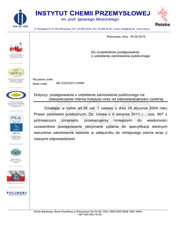INSTYTUT CHEMII PRZEMYSŁOWEJ im. prof. Ignacego Mościckiego Rok zał. 1922 ul. Rydygiera 8, 01-793 Warszawa; Tel.: 22 568 20 00, Fax: 22 568 23 90, e-mail: [email protected]; www.ichp.pl Warszawa, dnia: 05.05.2015 Do uczestników postępowania o udzielenie zamówienia publicznego Na pismo znak: Nasz znak: NE-3/223/221/15/MR Dotyczy: postępowania o udzielenie zamówienia publicznego na ubezpieczenie mienia Instytutu oraz od odpowiedzialności cywilnej Działając w trybie art.38 ust. 1 ustawy z dnia 29 stycznia 2004 roku Prawo zamówień publicznych, Dz. Ustaw z 9 sierpnia 2013 r. , poz. 907 z późniejszymi zmianami, przekazujemy niniejszym do wiadomości uczestników postępowania otrzymane pytania do specyfikacji istotnych warunków zamówienia zawarte w załączniku do niniejszego pisma wraz z naszymi odpowiedziami Konto Bankowe: Bank Handlowy w Warszawie SA Nr 82 1030 1508 0000 0008 1644 4004 NIP 525-000-79-39 I. Ubezpieczenie mienia od wszystkich ryzyk 1. Czy Zamawiający posiada pustostany jeśli tak prosimy o podanie wartości pustostanów zgłoszonych do ubezpieczenia oraz wartości mienia w nich znajdującego się. Prosimy również o dodanie poniższego zapisu: „Z zachowaniem pozostałych, nie zmienionych niniejszą klauzulą, postanowień umowy ubezpieczenia, w tym określonych we wniosku i ogólnych (szczególnych) warunkach ubezpieczenia strony uzgodniły, że ochrona ubezpieczeniowa nie obejmuje szkód w obiektach wyłączonych z użytkowania przez okres dłuższy niż 30 dni. Przez wyłączenie z użytkowania strony rozumieją całkowite i trwałe zaprzestanie eksploatacji obiektu poprzez brak jakiejkolwiek aktywności z nim związanej. Za zgodą Ubezpieczyciela ochrona w odniesieniu do takich obiektów może być udzielana przez okres dłuższy niż 30 dni od wyłączenia obiektu z użytkowania, pod warunkiem że spełnione są łącznie następujące warunki: 1) maszyny i urządzenia są oczyszczone, konserwowane oraz odłączone od źródeł zasilania, 2) teren zakładu jest ogrodzony, dozorowany, oświetlony w porze nocnej, 3) gaśnice oraz inne instalacje ppoż. znajdują się w wyznaczonym miejscu , są sprawne technicznie i gotowe do użycia, 4) z urządzeń (instalacji) wodno-kanalizacyjnych i technologicznych została usunięta woda, inne ciecze oraz para. Mienie wyłączone z eksploatacji ze względu na zły stan techniczny lub przeznaczone do likwidacji pozostaje poza zakresem ubezpieczenia.” Podanie wykazu budynków z określenie wartości poszczególnego budynku; Odp. Pustostanów w sensie nieużytkowanych budynków Instytut nie posiada z wyjątkiem Ośrodka Wypoczynkowego w Krynicy Zdrój, czasowo wyłączonego z eksploatacji, w pełni zabezpieczonego i dozorowanego przez cały okres użytkowania. Zamawiający nie wyraża zgody na wprowadzenie klauzuli. Jednocześnie Zamawiający informuje, że kwestie nieuregulowane SIWZ mogą być regulowanie Ogólnymi Warunkami Ubezpieczenia Wykonawcy, o ile nie stoją w sprzeczności z SIWZ. 2. prosimy o wprowadzenie w zakresie ubezpieczenia, że „wyłączone są szkody spowodowane w ubezpieczanym sprzęcie przez uszkodzony lub źle funkcjonujący system klimatyzacyjny, jeżeli system ten nie został wyposażony w oddzielny system alarmowy, który w sposób ciągły monitoruje temperaturę i wilgotność pomieszczeń, w których znajduje się ubezpieczony sprzęt oraz może uruchomić niezależne alarmy optyczne lub akustyczne. Powyższe wyłącznie dotyczy sprzętu, który z uwagi na specyfikę swojej pracy wymaga stosowania odpowiednio regulowanych zewnętrznych warunków klimatyzacyjnych (odpowiedniej temperatury i wilgotności), zgodnie z instrukcją producenta sprzętu. Odp. Zamawiający nie wyraża zgody na wprowadzenie klauzuli. 3. Jeśli w ramach ubezpieczenia mienia od wszystkich ryzyk znajduje się elektroniczny sprzęt przenośny to prosimy o doprecyzowanie, że jest on objęty ubezpieczeniem tylko w miejscu ubezpieczenia - lokalizacjach Zamawiającego. Jeśli wiek ubezpieczanego sprzętu elektronicznego ubezpieczanego w ramach mienia od wszystkich ryzyk przekracza 5 lat - wnioskujemy o włączenie poniższej klauzuli dla sprzętu powyżej 5 lat: KLAUZULA ubezpieczania sprzętu elektronicznego starszego niż 5 lat i/lub w wartościach rzeczywistych Z zastrzeżeniem pozostałych postanowień do umowy ubezpieczenia strony ustalają, że w przypadku, gdy suma ubezpieczenia odpowiada kosztom zastąpienia ubezpieczonego sprzętu lub urządzeń przez nowy sprzęt lub urządzenie tego samego rodzaju, typu, mocy i wydajności z uwzględnieniem stopnia faktycznego zużycia oraz z uwzględnieniem kosztów transportu, montażu i demontażu oraz opłat celnych i innych tego typu należności, z wyłączeniem kosztów transportu ekspresowego i lotniczego, rozmiar szkody ustala się na podstawie cen z dnia ustalenia odszkodowania w następujący sposób: 1) w przypadku wymiany sprzętu (strata całkowita) - według kosztów zakupu nowego sprzętu tego samego rodzaju, typu, mocy i wydajności, z uwzględnieniem stopnia faktycznego zużycia do dnia szkody oraz kosztów transportu i montażu, 2) jeżeli sprzęt nadaje się do naprawy (strata częściowa) - według kosztów remontu lub naprawy, z uwzględnieniem kosztów transportu, demontażu i montażu, potwierdzonych rachunkiem wykonawcy lub kalkulacją poszkodowanego, który usunął szkodę własnymi siłami, z uwzględnieniem stopnia faktycznego zużycia do dnia szkody. W przypadku, gdy w dniu wystąpienia szkody zadeklarowana suma ubezpieczenia jest niższa niż koszty wymienione wyżej, mają zastosowanie postanowienia dotyczące zastosowania zasady proporcji przy niedoubezpieczeniu. Odp. Zamawiający informuje, że w ramach ubezpieczenia mienia od wszystkich ryzyk ochrona obejmuje mienie w lokalizacjach wskazanych w SIWZ. Zamawiający nie wyraża zgody na wprowadzenie klauzuli. 4. Prosimy o informacje dotyczące o konstrukcji poszczególnych budynków (w tym da