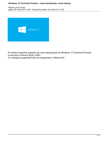 Windows 10 Technical Preview - nowa aktualizacja, nowe funkcje Wpisany przez Kuba piątek, 08 maja 2015 13:48 - Poprawiony piątek, 22 maja 2015 13:02 W zeszłym tygodniu pojawiła się nowa aktualizacja do Windows 10 Technical Preview oznaczona numerem Build 10061. Co nowego przygotowali dla nas programiści z Redmond? 1/8 Windows 10 Technical Preview - nowa aktualizacja, nowe funkcje Wpisany przez Kuba piątek, 08 maja 2015 13:48 - Poprawiony piątek, 22 maja 2015 13:02 Nowości, nowości, nowości... Czego innego się można spodziewać (oprócz usprawnień) niż nowości! Microsoft przygotował dla nas dwie nowe aplikacje - Kalendarz i Poczta. Działają dużo szybciej niż ich poprzednicy. Usprawniony Interfejs Użytkownika (GUI) pozwala na szybkie przełączanie pomiędzy tymi dwoma aplikacjami. Wprowadzono też obsługę gestów, dzięki czemu możemy szybciej kasować, flagować, oznaczać jako przeczytane i nieprzeczytane wiadomości zalegające w naszej skrzynce e-mail. Dodano też kilka funkcji znanych z Worda - tworzenie tabelek, dodawanie obrazków, formatowanie tekstu. 2/8 Windows 10 Technical Preview - nowa aktualizacja, nowe funkcje Wpisany przez Kuba piątek, 08 maja 2015 13:48 - Poprawiony piątek, 22 maja 2015 13:02 Nowy Nie karty wprowadzony tylko wPasjans! pasjans. ja spędziłem system Czekają nagród miliony na nas igodzin osiągnięć. odświeżone w szkolemotywy na zajęciach i wyzwania. z informatyki Z czasem czyma w pracy zostać układając Pracownicy urzędów państwowych, szykować mysze! 3/8 Windows 10 Technical Preview - nowa aktualizacja, nowe funkcje Wpisany przez Kuba piątek, 08 maja 2015 13:48 - Poprawiony piątek, 22 maja 2015 13:02 Poprawki w trybie "Continuum" Pasek przyciski palcem. zostały Dzięki aplikacji urządzeń temu zadań też To ustawień. Start, ikony samo czytelność został z Cortana ekranem aktualnie tyczy Możliwe bardziej interfejsu się oraz mniejszym elementów działających jest zoptymalizowany Widoku też zwiększyła uruchamianie niż Zadań wprogramów 10” obszarze są opcja się. pod większe, Możliwe systemu ta kątem notyfikacji. i będzie aplikacji dzięki jest tabletów. bezpośrednio wybrana ich przypiętych W czemu trybie przywrócenie Wdomyślnie. trybie można tabletowym do dotrybu dotykowym Paska w znie poziomu tabletowego. usunięte łatwiej Zadań.trafić Dla 4/8 Windows 10 Technical Preview - nowa aktualizacja, nowe funkcje Wpisany przez Kuba piątek, 08 maja 2015 13:48 - Poprawiony piątek, 22 maja 2015 13:02 ustawień Windows 10 "Kameleon" W Możemy nowymustawić (dotychczas Buildzie przeźroczystość dano była nam taka możliwość możliwość menu start, jeszcze jedynie a nawet większej przez ustawić edycję personalizacji ciemny rejestru) motyw niż dotychczas. GUI z poziomu 5/8 Windows 10 Technical Preview - nowa aktualizacja, nowe funkcje Wpisany przez Kuba piątek, 08 maja 2015 13:48 - Poprawiony piątek, 22 maja 2015 13:02 6/8 Windows 10 Technical Preview - nowa aktualizacja, nowe funkcje Wpisany przez Kuba piątek, 08 maja 2015 13:48 - Poprawiony piątek, 22 maja 2015 13:02 się Widok Zadań W zamykania klawiszy Widoku Alt+Tab Zadań zadań oraz mamy i miniatury skorzystaniu zmodyfikowano aplikacji. zgigant funkcji Tejego zmiany ikonę są Assist. oraz widoczne znajdujące pokto wciśnięciu się w wygodnie nim kombinacji przyciski Nieskończony Wirtualny Pulpit Wirtualizacja będzie między ich nielimitowana. aż nimi pulpitów nieskończoność! nawet Programiści to wtedy, absolutna gdy Otóż ich zadbali nowość miniaturki również zwSnap Redmont Windowsie nie obędą to,postanowił, żeby widoczne 10, ale można że na by było ilość ekranie. się spodziewał, Wirtualnych przełączać że Pulpitów 7/8 Windows 10 Technical Preview - nowa aktualizacja, nowe funkcje Wpisany przez Kuba piątek, 08 maja 2015 13:48 - Poprawiony piątek, 22 maja 2015 13:02 Czekamy na nowsze aktualizacje, o których będziemy Was informować na bieżąco! 8/8
