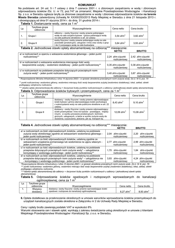 KOMUNIKAT Na podstawie art. 24 ust. 5 i 7 ustawy z dnia 7 czerwca 2001 r. o zbiorowym zaopatrzeniu w wodę i zbiorowym odprowadzaniu ścieków /Dz. U. nr 72, poz.747 ze zmianami/, Miejskie Przedsiębiorstwo Wodociągów i Kanalizacji Sp. z o.o. w Sieradzu ogłasza taryfę za zbiorowe zaopatrzenie w wodę i zbiorowe odprowadzanie ścieków na terenie Miasta Sieradza zatwierdzoną Uchwałą Nr XXXIII/253/2013 Rady Miejskiej w Sieradzu z dnia 21 listopada 2013 r. i obowiązującą od dnia 01 stycznia 2014 r. do dnia 31 grudnia 2014 r. Tabela 1. Dostarczanie wody, cena za 1 m Lp. Taryfowa grupa odbiorców 1. Grupa I 2. Grupa II 3 Wyszczególnienie Cena netto odbiorcy – osoby fizyczne i osoby prawne pobierające wodę na cele socjalno-bytowe i gmina pobierająca wodę na cele publiczne określone w art. 22 ustawy osoby fizyczne i osoby prawne pobierające wodę na cele pozostałe (produkcyjne, usługowe i inne) oraz osoby z grup I do II zuŜywające wodę na cele budowlane Cena brutto 3,54 zł/m3 3,82 zł/m3 3,64 zł/m3 3,93 zł/m3 Tabela 2. Jednostkowe stawki opłaty abonamentowej na odbiorcę*** miesięcznie: NETTO a/ w rozliczeniach w oparciu o wskazania wodomierza głównego – jeden punkt rozliczeniowy** b/ w rozliczeniach o wskazania wodomierza mierzącego ilość wody bezpowrotnie zuŜytej – wodomierz dodatkowy - jeden punkt rozliczeniowy** c/ w rozliczeniach na podstawie przepisów dotyczących przeciętnych norm zuŜycia wody* - jeden punkt rozliczeniowy** BRUTTO 2,24 zł/m-c/punkt rozliczeniowy 2,42 zł/m-c/punkt rozliczeniowy 0,35 zł/m-c/punkt rozliczeniowy 0,38 zł/m-c/punkt rozliczeniowy 3,40 zł/m-c/punkt rozliczeniowy 3,67 zł/m-c/punkt rozliczeniowy * Rozporządzenie Ministra Infrastruktury z dnia 14 stycznia 2002 r. w sprawie określenia przeciętnych norm zuŜycia wody. Dz.U. Nr 8, poz. 70 ** punkt rozliczeniowy: wodomierz główny, wodomierz mierzący ilość wody bezpowrotnie zuŜytej (wodomierz dodatkowy), lokal, zakład, obiekt podlegający odrębnemu rozliczeniu. *** stawka opłaty abonamentowej dla odbiorcy = iloczynowi liczby punktów rozliczeniowych u odbiorcy i jednostkowej stawki opłaty abonamentowej. Tabela 3. Odprowadzanie ścieków bytowych i przemysłowych, cena za 1 m Lp. Taryfowa grupa odbiorców 1. Grupa I 2. Grupa II Wyszczególnienie 3 Cena netto dostawcy - osoby fizyczne i osoby prawne odprowadzające ścieki bytowe i gmina odprowadzająca ścieki pochodzące z wykorzystania wody na cele publiczne określone w art. 22 ustawy. dostawcy - osoby fizyczne i osoby prawne odprowadzający ścieki przemysłowe i inne niŜ bytowe - powstające, między innymi, w wyniku procesów produkcyjnych, technologicznych, usługowych, a takŜe w wyniku zuŜycia wody do studzenia, czyszczenia, płukania, jak np. transport itp. 8,43 zł/m3 12,09 zł/m3 Cena brutto 9,10 zł/m3 13,06 zł/m3 Tabela 4. Jednostkowe stawki opłaty abonamentowej na odbiorcę*** miesięcznie: NETTO a/ w rozliczeniach za ilość odprowadzonych ścieków, ustaloną na podstawie zuŜycia wody określonego zgodnie ze wskazaniami wodomierza głównego jeden punkt rozliczeniowy** b/ w rozliczeniach za ilość odprowadzonych ścieków, ustaloną zgodnie ze wskazaniami urządzenia pomiarowego lub wodomierza na ujęciu własnym jeden punkt rozliczeniowy** c/ w rozliczeniach za ilość odprowadzonych ścieków, ustaloną na podstawie przepisów dotyczących przeciętnych norm zuŜycia wody* – usługobiorca korzystający z wodociągu publicznego - jeden punkt rozliczeniowy** d/ w rozliczeniach za ilość odprowadzonych ścieków, ustaloną na podstawie przepisów dotyczących przeciętnych norm zuŜycia wody* – usługobiorca nie - korzystający z wodociągu publicznego - jeden punkt rozliczeniowy** BRUTTO 2,04 zł/m-c/punkt rozliczeniowy 2,20 zł/m-c/punkt rozliczeniowy 2,77 zł/m-c/punkt rozliczeniowy 2,99 zł/m-c/punkt rozliczeniowy 1,70 zł/m-c/punkt rozliczeniowy 1,84 zł/m-c/punkt rozliczeniowy 3,93 zł/m-c/punkt rozliczeniowy 4,24 zł/m-c/punkt rozliczeniowy *Rozporządzenie Ministra Infrastruktury z dnia 14 stycznia 2002 r. w sprawie określenia przeciętnych norm zuŜycia wody. Dz.U. Nr 8, poz. 70. ** punkt rozliczeniowy: wodomierz główny, wodomierz mierzący ilość wody bezpowrotnie zuŜytej (wodomierz dodatkowy), lokal, zakład, obiekt podlegający odrębnemu rozliczeniu. ***stawka opłaty abonamentowej dla odbiorcy = iloczynowi liczby punktów rozliczeniowych u odbiorcy i jednostkowej stawki opłaty abonamentowej. Tabela 5. Lp. 1. Odprowadzanie ścieków opadowych i roztopowych wprowadzanych do kanalizacji 3 ogólnospławnej, cena za 1 m Taryfowa grupa odbiorców Wszyscy dostawcy Wyszczególnienie dostawcy- osoby fizyczne i osoby prawne wprowadzające ścieki opadowe i roztopowe do kanalizacji ogólnospławnej Cena netto Cena brutto 8,27 zł/m3 8,93 zł/m3 6. Opłata dodatkowa za przekroczenie określonych w umowie warunków wprowadzania ścieków przemysłowych do urządzeń kanalizacyjnych została określona w Załączniku nr 2 do Uchwały Rady Miejskiej w Sieradzu. Ceny i opłaty brutto zawierają podatek VAT w wysokości 8% Warunki stosowania cen i stawek opłat, wynikają z zakresu świadczenia usług określonych w umowie z klientami Miejskiego Przedsiębiorstwa Wodociągów i Kanalizacji Sp. z o.o. w Sieradzu.