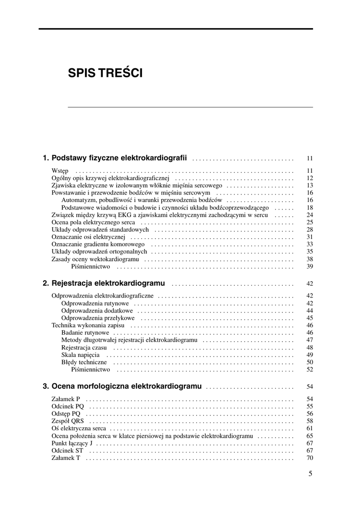 SPIS TREŚCI 1. Podstawy fizyczne elektrokardiografii . . . . . . . . . . . . . . . . . . . . . . . . . . . . . . 11 Wstęp . . . . . . . . . . . . . . . . . . . . . . . . . . . . . . . . . . . . . . . . . . . . . . . . . . . . . . . . . . . . . . . . Ogólny opis krzywej elektrokardiograficznej . . . . . . . . . . . . . . . . . . . . . . . . . . . . . . . . . . . Zjawiska elektryczne w izolowanym włóknie mięśnia sercowego . . . . . . . . . . . . . . . . . . . . Powstawanie i przewodzenie bodźców w mięśniu sercowym . . . . . . . . . . . . . . . . . . . . . . . Automatyzm, pobudliwość i warunki przewodzenia bodźców . . . . . . . . . . . . . . . . . . . . Podstawowe wiadomości o budowie i czynności układu bodźcoprzewodzącego . . . . . . Związek między krzywą EKG a zjawiskami elektrycznymi zachodzącymi w sercu . . . . . . Ocena pola elektrycznego serca . . . . . . . . . . . . . . . . . . . . . . . . . . . . . . . . . . . . . . . . . . . . . Układy odprowadzeń standardowych . . . . . . . . . . . . . . . . . . . . . . . . . . . . . . . . . . . . . . . . . Oznaczanie osi elektrycznej . . . . . . . . . . . . . . . . . . . . . . . . . . . . . . . . . . . . . . . . . . . . . . . . Oznaczanie gradientu komorowego . . . . . . . . . . . . . . . . . . . . . . . . . . . . . . . . . . . . . . . . . . Układy odprowadzeń ortogonalnych . . . . . . . . . . . . . . . . . . . . . . . . . . . . . . . . . . . . . . . . . . Zasady oceny wektokardiogramu . . . . . . . . . . . . . . . . . . . . . . . . . . . . . . . . . . . . . . . . . . . . Piśmiennictwo . . . . . . . . . . . . . . . . . . . . . . . . . . . . . . . . . . . . . . . . . . . . . . . . . . . . 11 12 13 16 16 18 24 25 28 31 33 35 38 39 2. Rejestracja elektrokardiogramu . . . . . . . . . . . . . . . . . . . . . . . . . . . . . . . . . . . . 42 Odprowadzenia elektrokardiograficzne . . . . . . . . . . . . . . . . . . . . . . . . . . . . . . . . . . . . . . . . Odprowadzenia rutynowe . . . . . . . . . . . . . . . . . . . . . . . . . . . . . . . . . . . . . . . . . . . . . . . Odprowadzenia dodatkowe . . . . . . . . . . . . . . . . . . . . . . . . . . . . . . . . . . . . . . . . . . . . . . Odprowadzenia przełykowe . . . . . . . . . . . . . . . . . . . . . . . . . . . . . . . . . . . . . . . . . . . . . Technika wykonania zapisu . . . . . . . . . . . . . . . . . . . . . . . . . . . . . . . . . . . . . . . . . . . . . . . . Badanie rutynowe . . . . . . . . . . . . . . . . . . . . . . . . . . . . . . . . . . . . . . . . . . . . . . . . . . . . . Metody długotrwałej rejestracji elektrokardiogramu . . . . . . . . . . . . . . . . . . . . . . . . . . . Rejestracja czasu . . . . . . . . . . . . . . . . . . . . . . . . . . . . . . . . . . . . . . . . . . . . . . . . . . . . . Skala napięcia . . . . . . . . . . . . . . . . . . . . . . . . . . . . . . . . . . . . . . . . . . . . . . . . . . . . . . . Błędy techniczne . . . . . . . . . . . . . . . . . . . . . . . . . . . . . . . . . . . . . . . . . . . . . . . . . . . . . Piśmiennictwo . . . . . . . . . . . . . . . . . . . . . . . . . . . . . . . . . . . . . . . . . . . . . . . . . . . . 42 42 44 45 46 46 47 48 49 50 52 3. Ocena morfologiczna elektrokardiogramu . . . . . . . . . . . . . . . . . . . . . . . . . . 54 Załamek P . . . . . . . . . . . . . . . . . . . . . . . . . . . . . . . . . . . . . . . . . . . . . . . . . . . . . . . . . . . . . Odcinek PQ . . . . . . . . . . . . . . . . . . . . . . . . . . . . . . . . . . . . . . . . . . . . . . . . . . . . . . . . . . . . Odstęp PQ . . . . . . . . . . . . . . . . . . . . . . . . . . . . . . . . . . . . . . . . . . . . . . . . . . . . . . . . . . . . . Zespół QRS . . . . . . . . . . . . . . . . . . . . . . . . . . . . . . . . . . . . . . . . . . . . . . . . . . . . . . . . . . . . Oś elektryczna serca . . . . . . . . . . . . . . . . . . . . . . . . . . . . . . . . . . . . . . . . . . . . . . . . . . . . . . Ocena położenia serca w klatce piersiowej na podstawie elektrokardiogramu . . . . . . . . . . . Punkt łączący J . . . . . . . . . . . . . . . . . . . . . . . . . . . . . . . . . . . . . . . . . . . . . . . . . . . . . . . . . . Odcinek ST . . . . . . . . . . . . . . . . . . . . . . . . . . . . . . . . . . . . . . . . . . . . . . . . . . . . . . . . . . . . Załamek T . . . . . . . . . . . . . . . . . . . . . . . . . . . . . . . . . . . . . . . . . . . . . . . . . . . . . . . . . . . . . 54 55 56 58 61 65 67 67 70 5 Odstęp QT . . . . . . . . . . . . . . . . . . . . . . . . . . . . . . . . . . . . . . . . . . . . . . . . . . . . . . . . . . . . . Załamek U . . . . . . . . . . . . . . . . . . . . . . . . . . . . . . . . . . . . . . . . . . . . . . . . . . . . . . . . . . . . . Piśmiennictwo . . . . . . . . . . . . . . . . . . . . . . . . . . . . . . . . . . . . . . . . . . . . . . . . . . . . 73 76 77 4. Inne metody oceny czynności elektrycznej serca . . . . . . . . . . . . . . . . . . 79 Zmienność rytmu serca . . . . . . . . . . . . . . . . . . . . . . . . . . . . . . . . . . . . . . . . . . . . . . . . . . . Analiza czasowa . . . . . . . . . . . . . . . . . . . . . . . . . . . . . . . . . . . . . . . . . . . . . . . . . . . . . . Analiza częstotliwościowa . . . . . . . . . . . . . . . . . . . . . . . . . . . . . . . . . . . . . . . . . . . . . . Inne metody oceny zmienności rytmu serca . . . . . . . . . . . . . . . . . . . . . . . . . . . . . . . . . Podstawy fizjologiczne zmienności rytmu serca . . . . . . . . . . . . . . . . . . . . . . . . . . . . . . Znaczenie kliniczne zmienności rytmu serca . . . . . . . . . . . . . . . . . . . . . . . . . . . . . . . . . Elektrogramy wewnątrzsercowe . . . . . . . . . . . . . . . . . . . . . . . . . . . . . . . . . . . . . . . . . . . . . Elektrokardiogram uśredniony . . . . . . . . . . . . . . . . . . . . . . . . . . . . . . . . . . . . . . . . . . . . . . Naprzemienność załamków T . . . . . . . . . . . . . . . . . . . . . . . . . . . . . . . . . . . . . . . . . . 