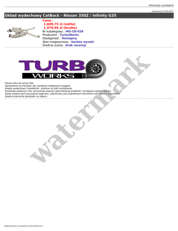 Informacje o produkcie Utworzono 07-03-2017 Układ wydechowy CatBack - Nissan 350Z / Infinity G35 Cena : 1.609,75 zł (netto) 1.979,99 zł (brutto) er m ar k Nr katalogowy : MG-CB-028 Producent : TurboWorks Dostępność : Dostępny Stan magazynowy : bardzo wysoki Średnia ocena : brak recenzji w at Pasuje tylko do wersji USA. Sprawdzone na hamowni dla uzyskania najlepszych osiągów. Układy wydechowe TurboWorks zrobione ze stali nierdzewnej. Pozwalają zwiększyć moc samochodu poprzez optymalizację prędkości i przepływu spalin z silnika. Każdy wydech jest precyzyjnie doginany, zakończony jest przelotowym tłumikiem końcowym z silencerem. Zawiera elementy pokazane na zdjęciu. Wygenerowano w programie www.oscGold.com