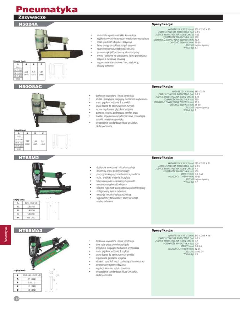 3QHXPDW\ND =V]\ZDF]H N5024A 6SHF\ILNDFMD • • • • • • • L • A B C 23,3 (,917) 1,45 (,057) 1,61 (,063) 25 (1) 32 (1-1/4) 38 (1-1/2) 45 (1-3/4) doskonale wyważona i lekka konstrukcja szybko i precyzyjnie reagujący mechanizm wyzwalacza maks. prędkość wbijania 3 zszywki/s łatwy dostęp do zakleszczonych zszywek ręcznie regulowana głębokość wbijania gumowa rękojeść podnosząca komfort pracy trwała i odporna na uszkodzenia listwa prowadząca zszywki z metalową powłoką wyposażenie standardowe: klucz sześciokąt, okulary ochronne WYMIARY D X W X S (mm) ZAKRES CIŚNIENIA ROBOCZEGO (bar) ZUŻYCIE POWIETRZA NA JEDEN CYKL (l) POJEMNOŚĆ MAGAZYNKA (szt.) SZEROKOŚĆ ZEWNĘTRZNA ZSZYWEK (mm) DŁUGOŚĆ ZSZYWEK (mm) ŁĄCZENIE WAGA (kg) 365 X 250 X 85 5-8,5 1,05 150 25,4 25-50 klejone żywicą 2,1 50 (2) N50O8AC 6SHF\ILNDFMD • • • • • • • • L A B doskonale wyważona i lekka konstrukcja szybko i precyzyjnie reagujący mechanizm wyzwalacza maks. prędkość wbijania 3 zszywki/s łatwy dostęp do zakleszczonych zszywek ręcznie regulowana głębokość wbijania gumowa rękojeść podnosząca komfort pracy trwała i odporna na uszkodzenia listwa prowadząca zszywki z metalową powłoką wyposażenie standardowe: klucz sześciokąt, okulary ochronne WYMIARY D X W (mm) ZAKRES CIŚNIENIA ROBOCZEGO (bar) ZUŻYCIE POWIETRZA NA JEDEN CYKL (l) POJEMNOŚĆ MAGAZYNKA (szt.) SZEROKOŚĆ ZEWNĘTRZNA ZSZYWEK (mm) DŁUGOŚĆ ZSZYWEK (mm) ŁĄCZENIE WAGA (kg) 365 X 254 5-8,5 1,14 150 11,1 25-50 klejone żywicą 2 C 25 (1) 32 (1-1/4) 38 (1-1/2) 7,85 1,45 1,61 (,309) (,057) (,063) 45 (1-3/4) 50 (2) NT65M2 6SHF\ILNDFMD • • • • • • • • • • L 25(1) - 65(2-1/2) A 2,8 (,110) B 1,4 (,054) 1,3 (,050) D 1,65 (,065) Pneumatyka C doskonale wyważona i lekka konstrukcja dwa tryby pracy: pojedynczy/ciągły precyzyjnie reagujący mechanizm wyzwalacza maks. prędkość wbijania 3 sztyfty/s łatwy dostęp do zakleszczonych gwoździ regulowana głębokość wbijania rękojeść typu Soft touch podnosząca komfort pracy zintegrowany system odpylania regulacja kierunku wylotu powietrza wyposażenie standardowe: klucz sześciokąt, okulary ochronne NT65MA3 L 32 (1-1/4) - 65 (2-1/2) 2,4 (,095) B 3,0 (,12) C 1,1 (,045) D 1,8 (,072) 112 295 X 285 X 71 5-8,5 1,2 100 1,4-1,65 25-65 klejone żywicą 1,7 6SHF\ILNDFMD • • • • • • • • • • A WYMIARY D X W X S (mm) ZAKRES CIŚNIENIA ROBOCZEGO (bar) ZUŻYCIE POWIETRZA NA JEDEN CYKL (l) POJEMNOŚĆ MAGAZYNKA (szt.) SZTYFTY (mm) DŁUGOŚĆ SZTYFTÓW (mm) ŁĄCZENIE WAGA (kg) doskonale wyważona i lekka konstrukcja dwa tryby pracy: pojedynczy/ciągły precyzyjnie reagujący mechanizm wyzwalacza maks. prędkość wbijania 3 sztyfty/s łatwy dostęp do zakleszczonych gwoździ regulowana głębokość wbijania rękojeść typu Soft touch podnosząca komfort pracy zintegrowany system odpylania regulacja kierunku wylotu powietrza wyposażenie standardowe: klucz sześciokąt, okulary ochronne WYMIARY D X W X S (mm) ZAKRES CIŚNIENIA ROBOCZEGO (bar) ZUŻYCIE POWIETRZA NA JEDEN CYKL (l) POJEMNOŚĆ MAGAZYNKA (szt.) SZTYFTY (mm) DŁUGOŚĆ SZTYFTÓW (mm) ŁĄCZENIE WAGA (kg) 343 X 305 X 76 5-8,5 1,2 100 2,4-3,0 32-65 taśma 34° 1,9 Pneumatyka *ZRĒG]LDUNL NV45AB2 6SHF\ILNDFMD • • • • • • • • L 22 (7/8) - 45 (1-3/4) d 3,0 (,120) D 10,5 (,413) • doskonale wyważona i lekka konstrukcja szybko i precyzyjnie reagujący mechanizm wyzwalacza maks. prędkość wbijania 3 gwoździe/s pojemny i wygodny do załadowania magazynek ręcznie regulowana głębokość wbijania gumowa rękojeść podnosząca komfort pracy gumowe nakładki zapobiegające ześlizgiwaniu gwoździarki z dachu wstawki oporowe wykonane z węglika, wydłużają żywotność dźwigni zwalniającej wyposażenie standardowe: klucz sześciokąt, okulary ochronne NV50AH WYMIARY D X W (mm) ZAKRES CIŚNIENIA ROBOCZEGO (bar) ZUŻYCIE POWIETRZA NA JEDEN CYKL (l) POJEMNOŚĆ MAGAZYNKA (szt.) ŚREDNICA GŁOWY GWOŹDZIA (mm) ŚREDNICA TRZONU GWOŹDZIA (mm) DŁUGOŚĆ GWOŹDZIA (mm) ŁĄCZENIE WAGA (kg) 250 X 264 4,8-8,3 1,3 120 10,5 3 22-45 zwój łączony drutem 2,5 6SHF\ILNDFMD • • • • • • • • L 27 (1-1/16) - 50 (2) d 1,8 (,071) - 2,3 (,091) D 4,6 (,181) - 4,8 (,189) doskonale wyważona i lekka konstrukcja szybko i precyzyjnie reagujący mechanizm wyzwalacza maks. prędkość wbijania 3 gwoździe/s pojemny i wygodny do załadowania magazynek ręcznie regulowana głębokość wbijania gumowa rękojeść podnosząca komfort pracy regulacja kierunku wylotu powietrza wyposażenie standardowe: klucz sześciokąt, okulary ochronne NV90AB WYMIARY D X W (mm) ZAKRES CIŚNIENIA ROBOCZEGO (bar) ZUŻYCIE POWIETRZA NA JEDEN CYKL (l) POJEMNOŚĆ MAGAZYNKA (szt.) ŚREDNICA GŁOWY GWOŹDZIA (mm) ŚREDNICA TRZONU GWOŹDZIA (mm) DŁUGOŚĆ GWOŹDZIA (mm) ŁĄCZENIE WAGA (kg) 252 X 269 4,9-8,3 0,8 200-800 4,6-4,8 1,8-2,3 27-50 zwój łączony drutem 1,4 6SHF\ILNDFMD L 45 (1-3/4) - 90 (3-1/2) d 2,5 (,099) - 3,8 (,150) D 6,0 (,236) - 7,9 (,311) doskonale wyważona i lekka konstrukcja szybko i precyzyjnie reagujący mechanizm wyzwalacza maks. prędkość wbijania 3 gwoździe/s pojemny i wygodny do załadowania magazynek ręcznie regulowana głębokość wbijania gumowa rękojeść podnosząca komfort pracy regulacja kierunku wylotu powietrza wyposażenie standardowe: klucz sześciokąt, okulary ochronne NR90AD 292 X 389 5-8,5 2,7 150-300 6-7,9 2,5-3,8 45-90 zwój łączony drutem 3 Pneumatyka • • • • • • • • WYMIARY D X W (mm) ZAKRES CIŚNIENIA ROBOCZEGO (bar) ZUŻYCIE POWIETRZA NA JEDEN CYKL (l) POJEMNOŚĆ MAGAZYNKA (szt.) ŚREDNICA GŁOWY GWOŹDZIA (mm) ŚREDNICA TRZONU GWOŹDZIA (mm) DŁUGOŚĆ GWOŹDZIA (mm) ŁĄCZENIE WAGA (kg) 6SHF\ILNDFMD • • • • • • • • • L 50 (2) - 90 (3-1/2) d 2,9 (,113) - 3,8 (,148) D 6,8 (,266) - 7,6 (,300) nowoczesna i agresywna stylistyka doskonale wyważona i lekka konstrukcja przystosowana do p